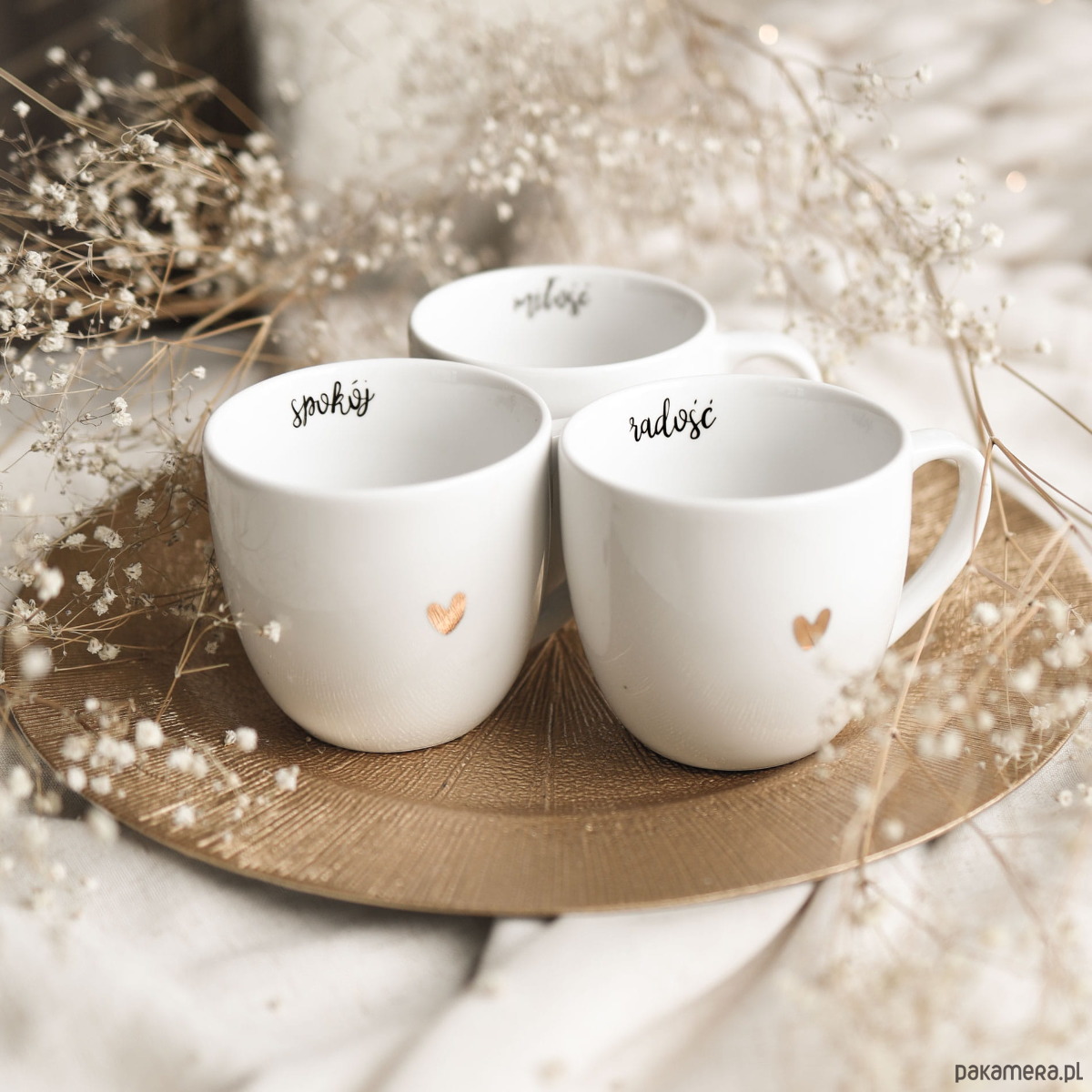 I celebrację codziennych chwil, zestaw 3 kubków z napisem: miłość, spokój, radość to opcja dla Ciebie. Przypominamy, że każde zamówienie złożone w naszym sklepie, możesz dodatkowo spersonalizować przy pomocy konfiguratora. Starannie ozdabiamy i pakujemy Wasze zamówienia, dbając o każdy szczegół. Nasza porcelana podróżuje bezpiecznie w ekologicznym, dobrym dla środowiska opakowaniu. Będzie nam miło, jeśli zechcesz podzielić się z nami chwilami spędzanymi przy naszej nadzwyczajnie zdobionej porcelanie. Możesz to zrobić, oznaczając nas na Instagramie.