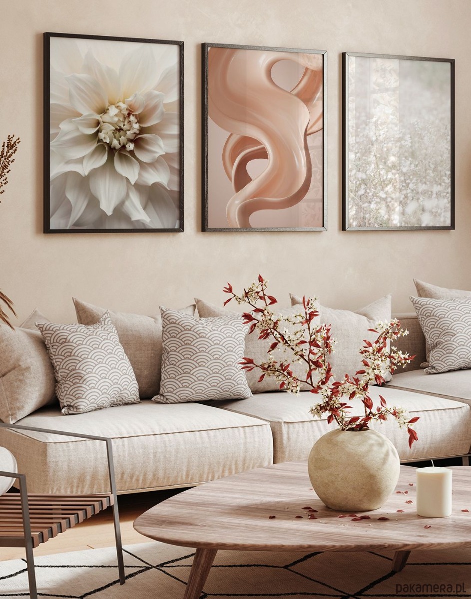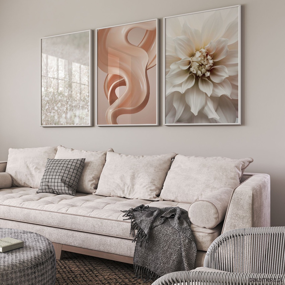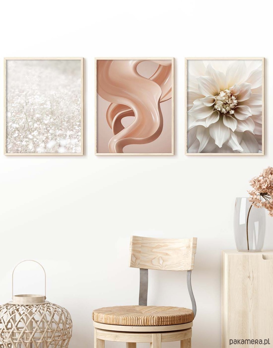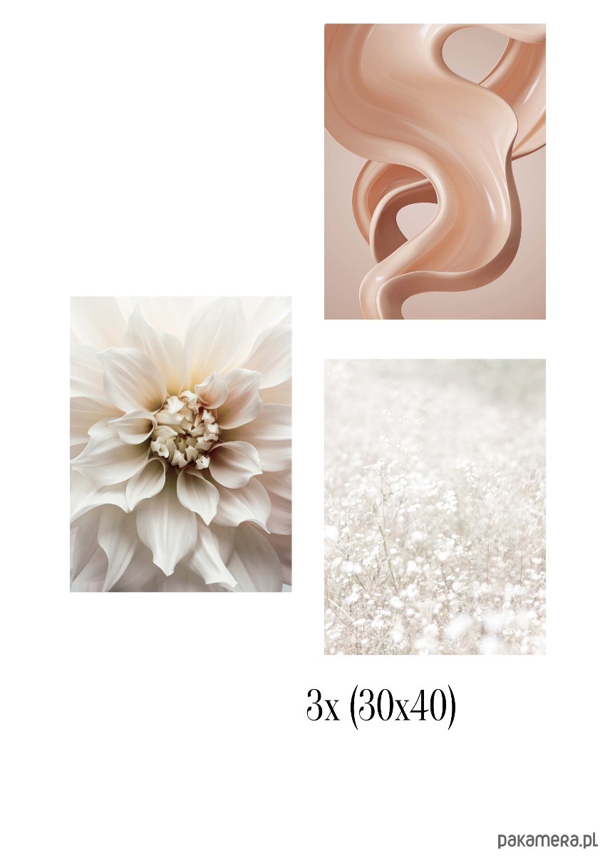 Odkryj harmonię i spokój dzięki temu urzekającemu trio plakatów, które wniesie do każdego wnętrza powiew nowoczesności i naturalnego piękna. Zestaw składa się z trzech idealnie dopasowanych grafik w rozmiarze 30x40 cm, prezentujących świetlistą białą dalię, subtelną abstrakcję w odcieniach pudrowego różu i beżu oraz delikatne, drobne kwiaty na rozmytym tle. Te zjawiskowe plakaty to gotowe rozwiązanie dla osób ceniących sobie wyszukany design i spójność wizualną.