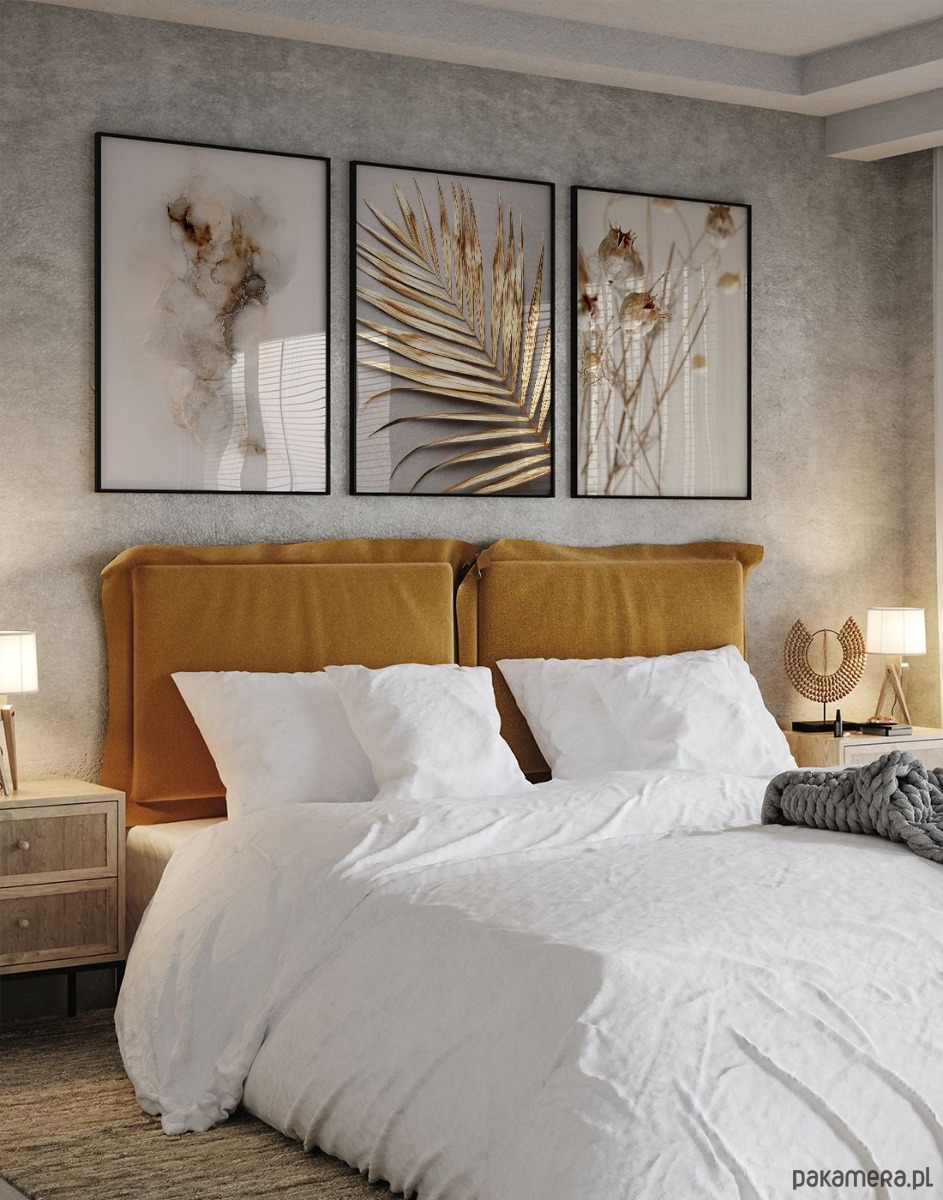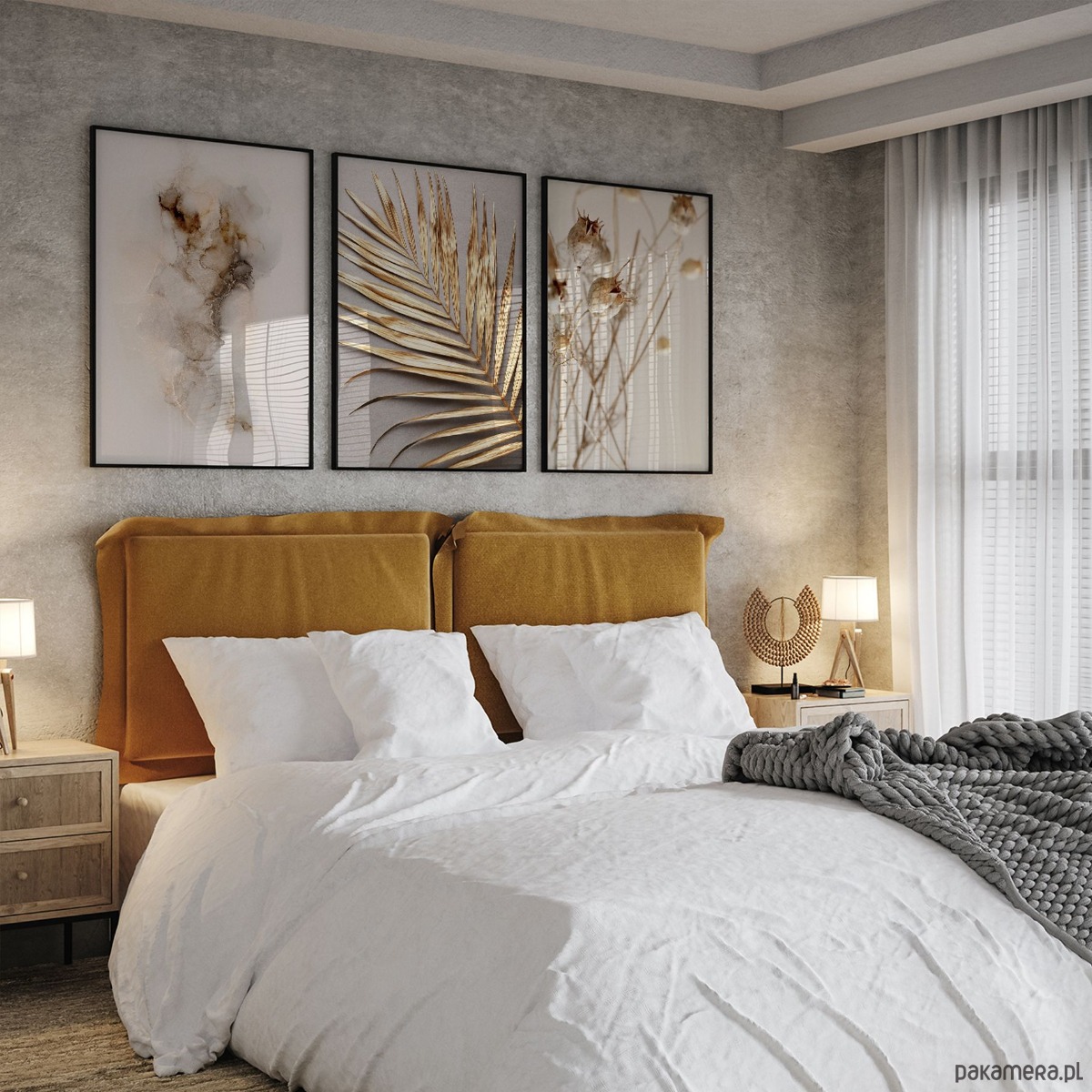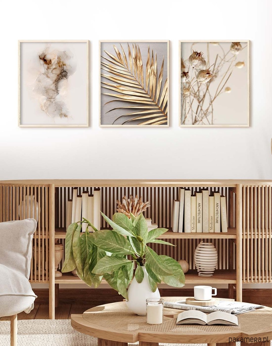 Plakaty charakteryzują się harmonijną paletą barw, w której dominują odcienie beżu, brązu, złota i łamanej bieli, nadając przestrzeni ciepły i przytulny charakter. Abstrakcyjny wzór, inspirowany naturalnymi teksturami, pięknie komponuje się ze złotym liściem palmy, dodając odrobinę egzotyki i blasku. Delikatne suszone kwiaty wnoszą natomiast element natury i ukojenia.