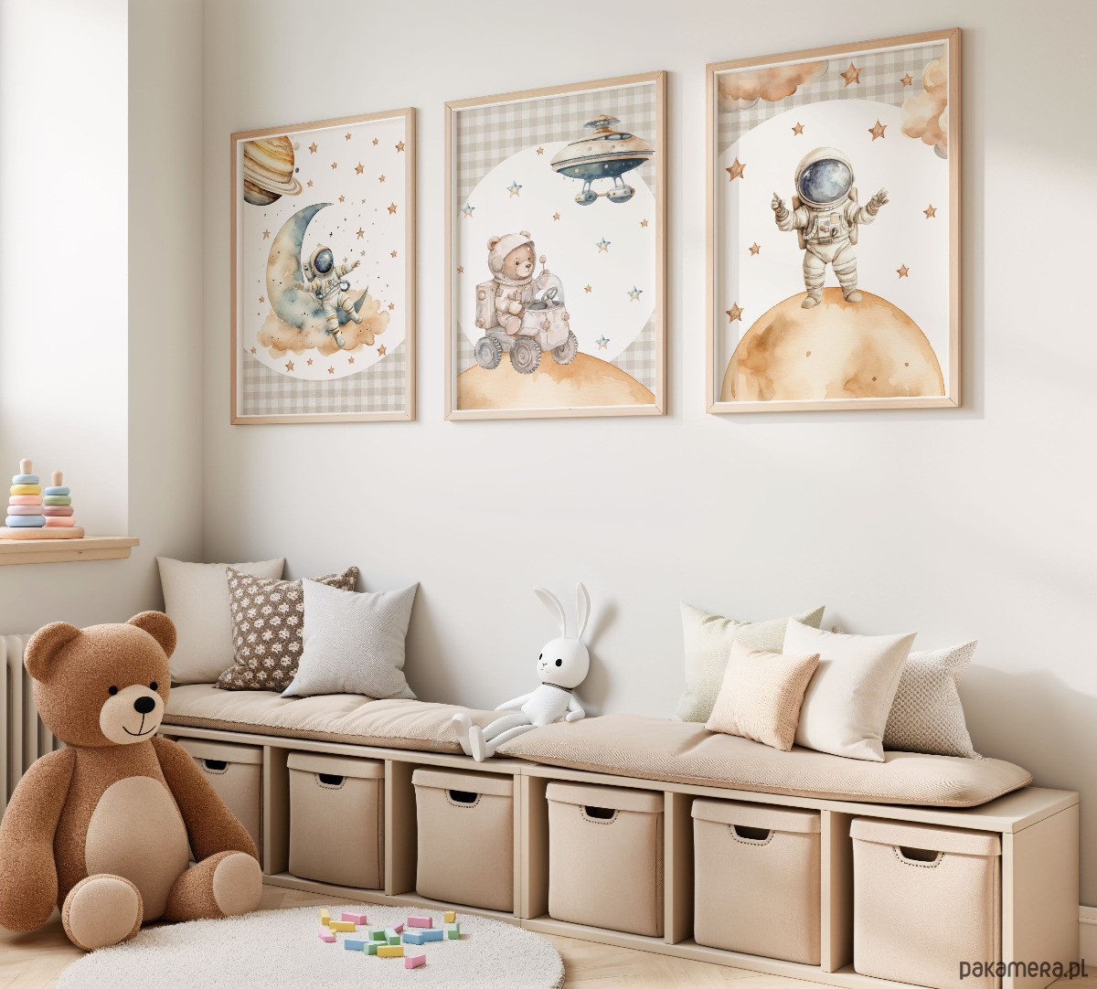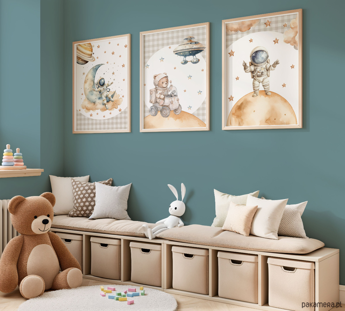 Ciepłe, stonowane kolory i akwarelowe ilustracje tworzą przytulny, bajkowy klimat w pokoju dziecka.