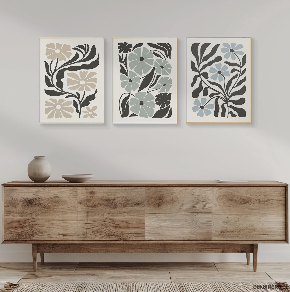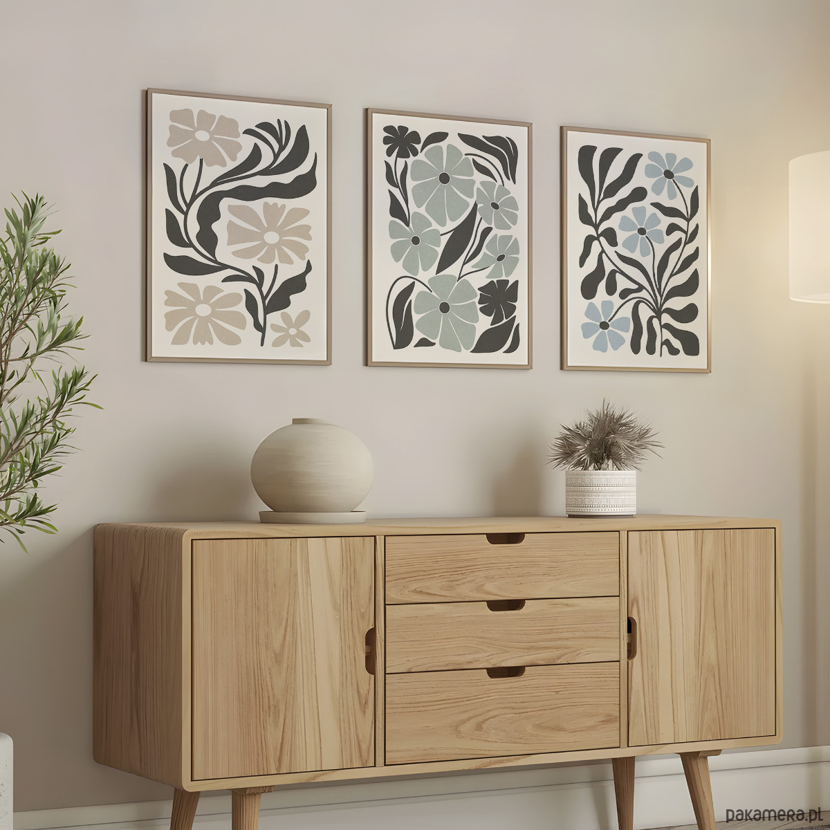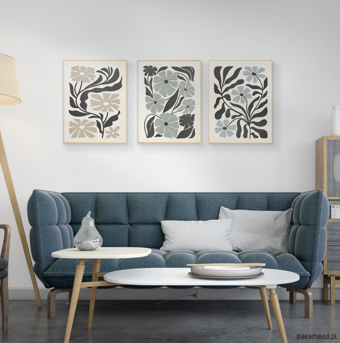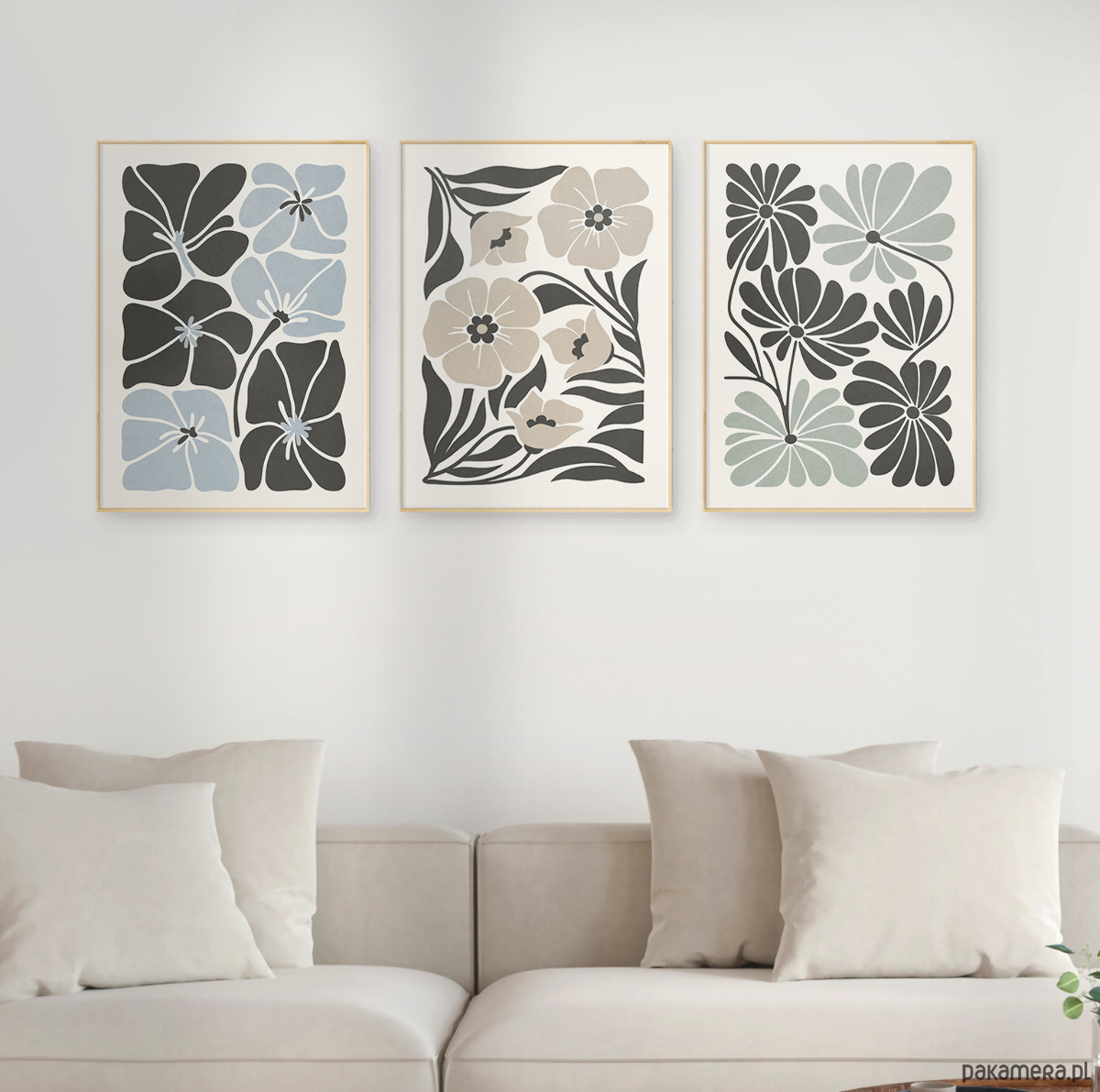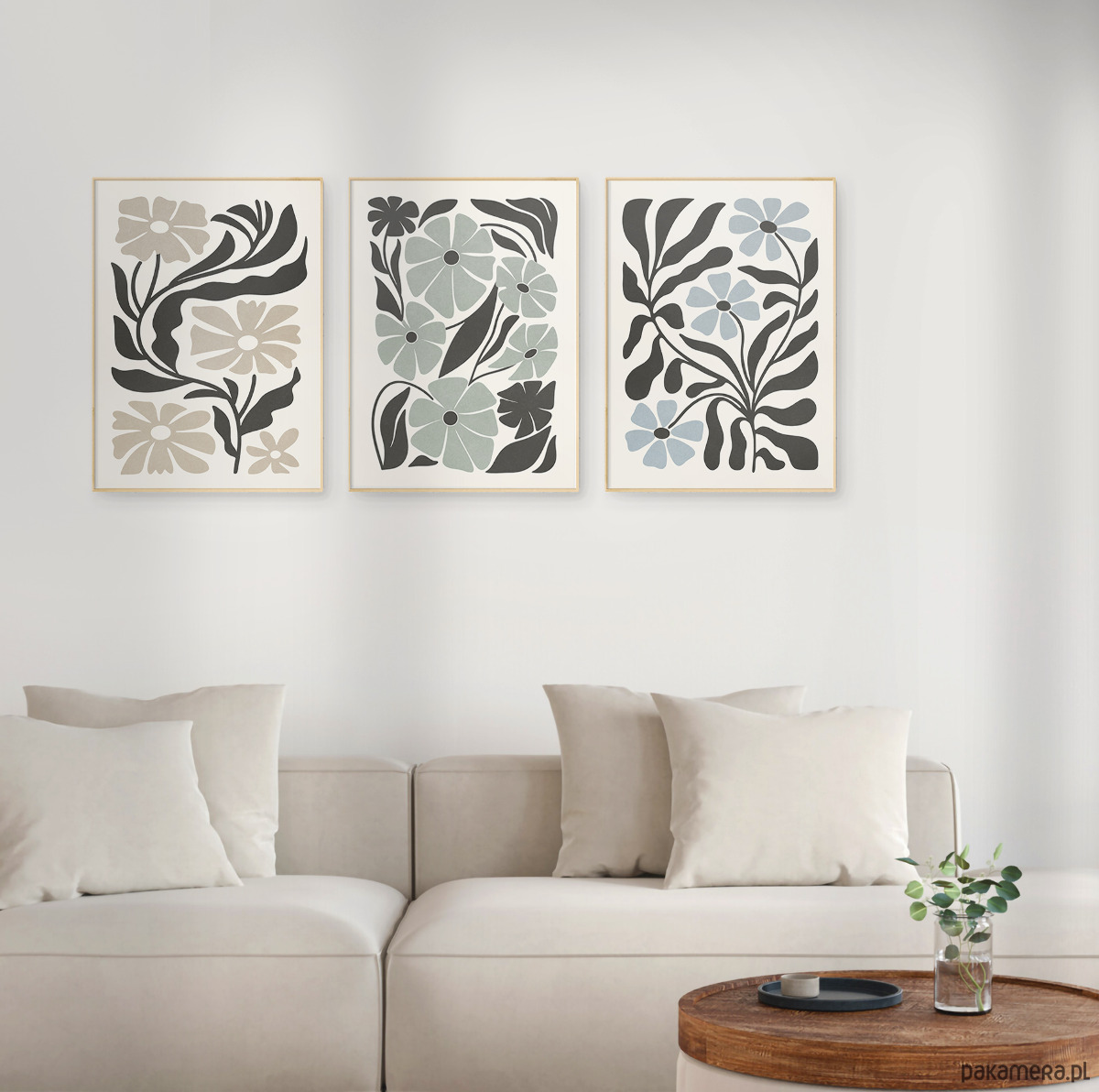 Zestaw trzech plakatów z motywem abstrakcyjnych kwiatów i roślin. Spójna kompozycja, stylowa, minimalistyczna paleta barw oraz subtelna tekstura nadają plakatom wyjątkowy charakter, doskonale wpisując się w nowoczesne wnętrza.
