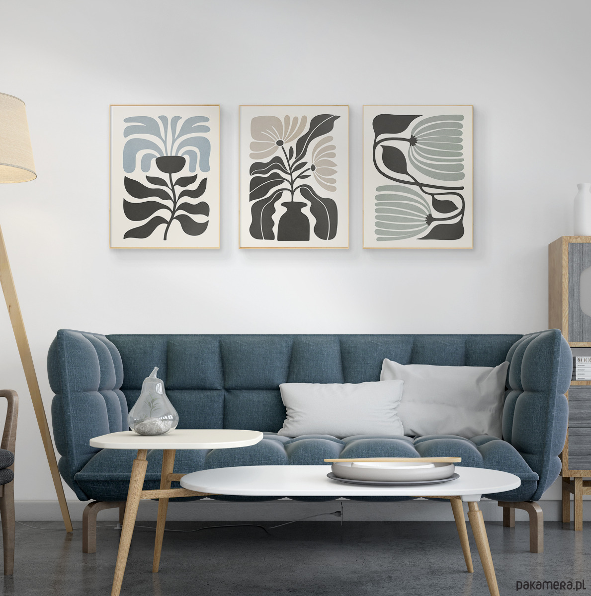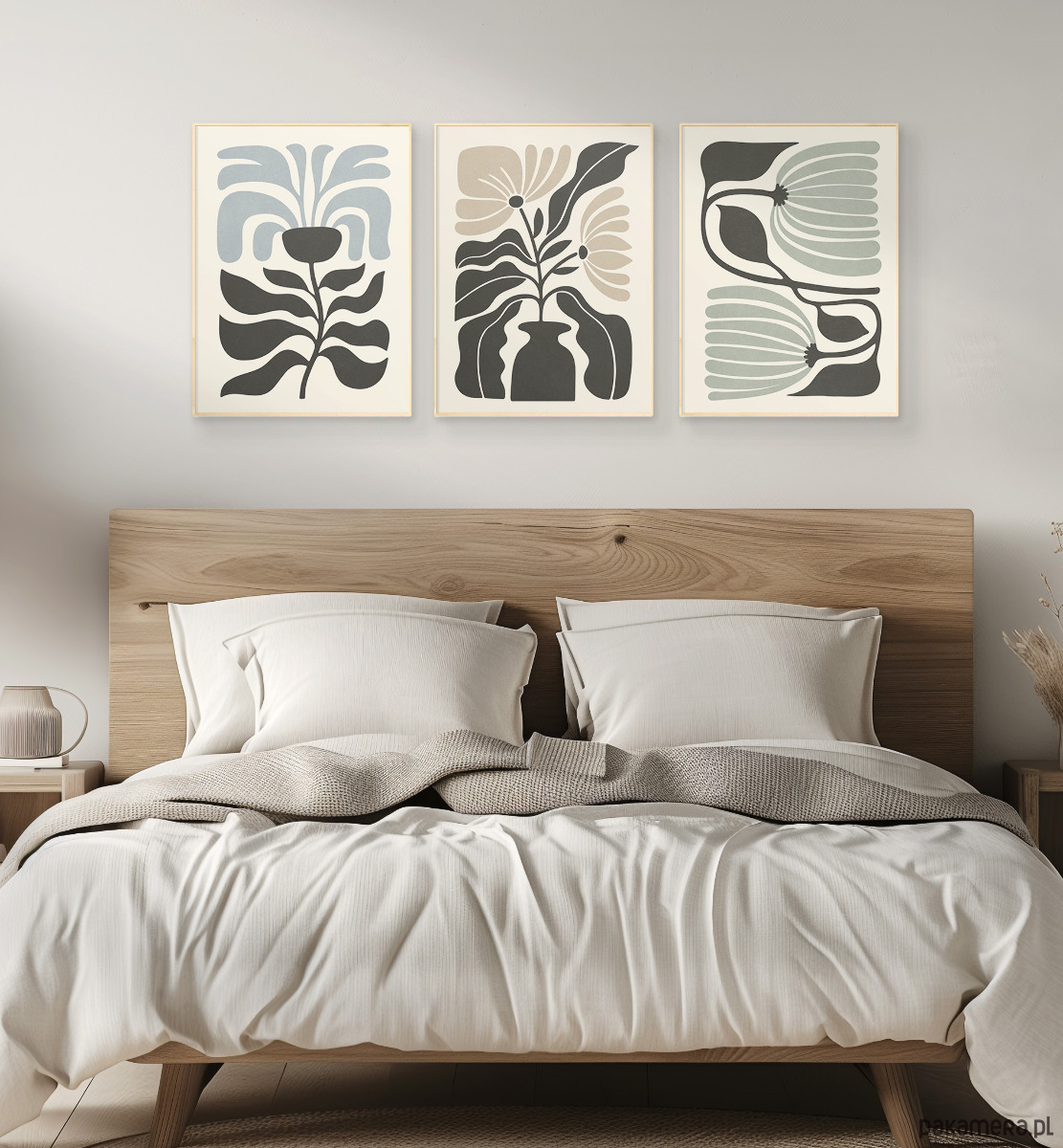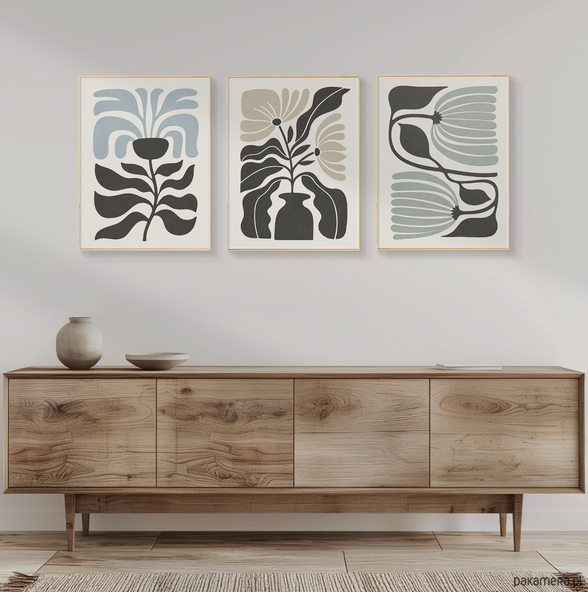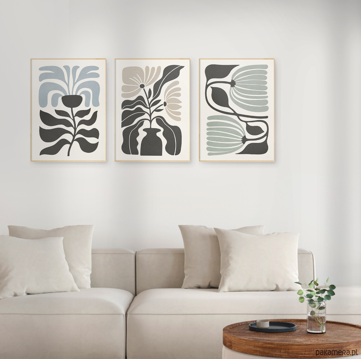 Zestaw trzech plakatów z motywem abstrakcyjnych kwiatów i roślin. Spójna kompozycja, stylowa, minimalistyczna paleta barw oraz subtelna tekstura nadają plakatom wyjątkowy charakter, doskonale wpisując się w nowoczesne wnętrza.