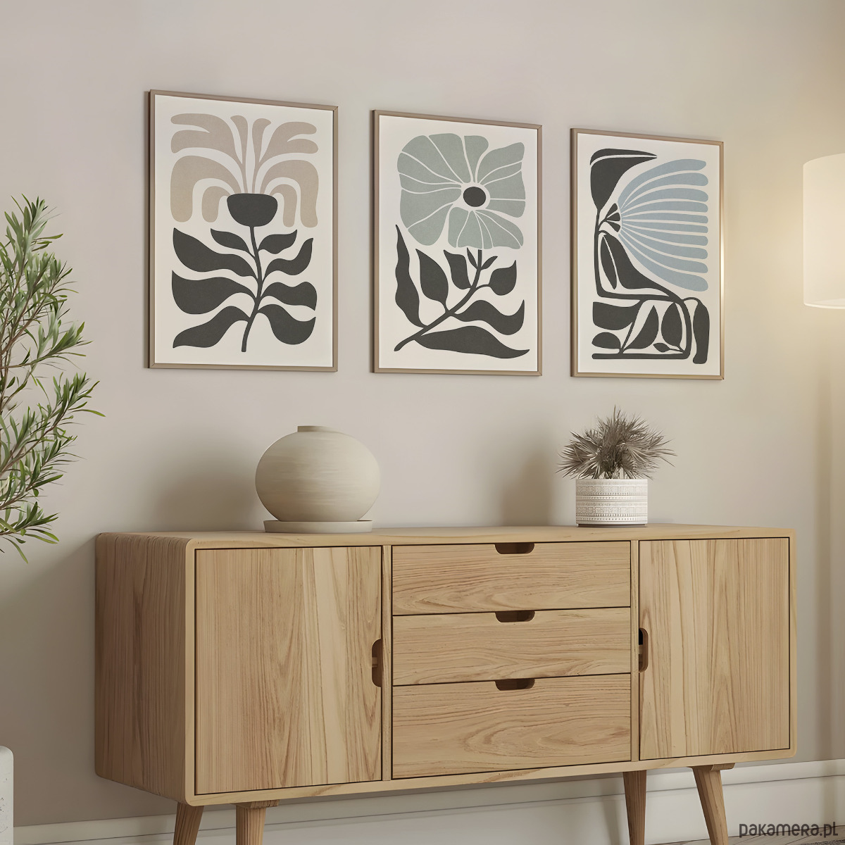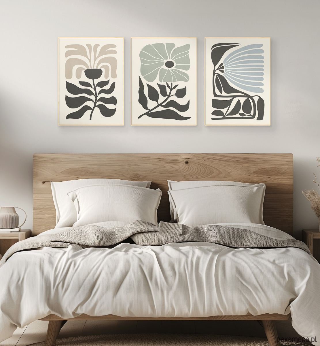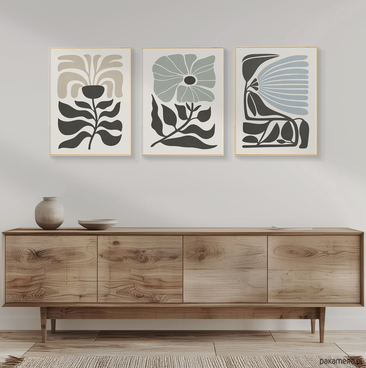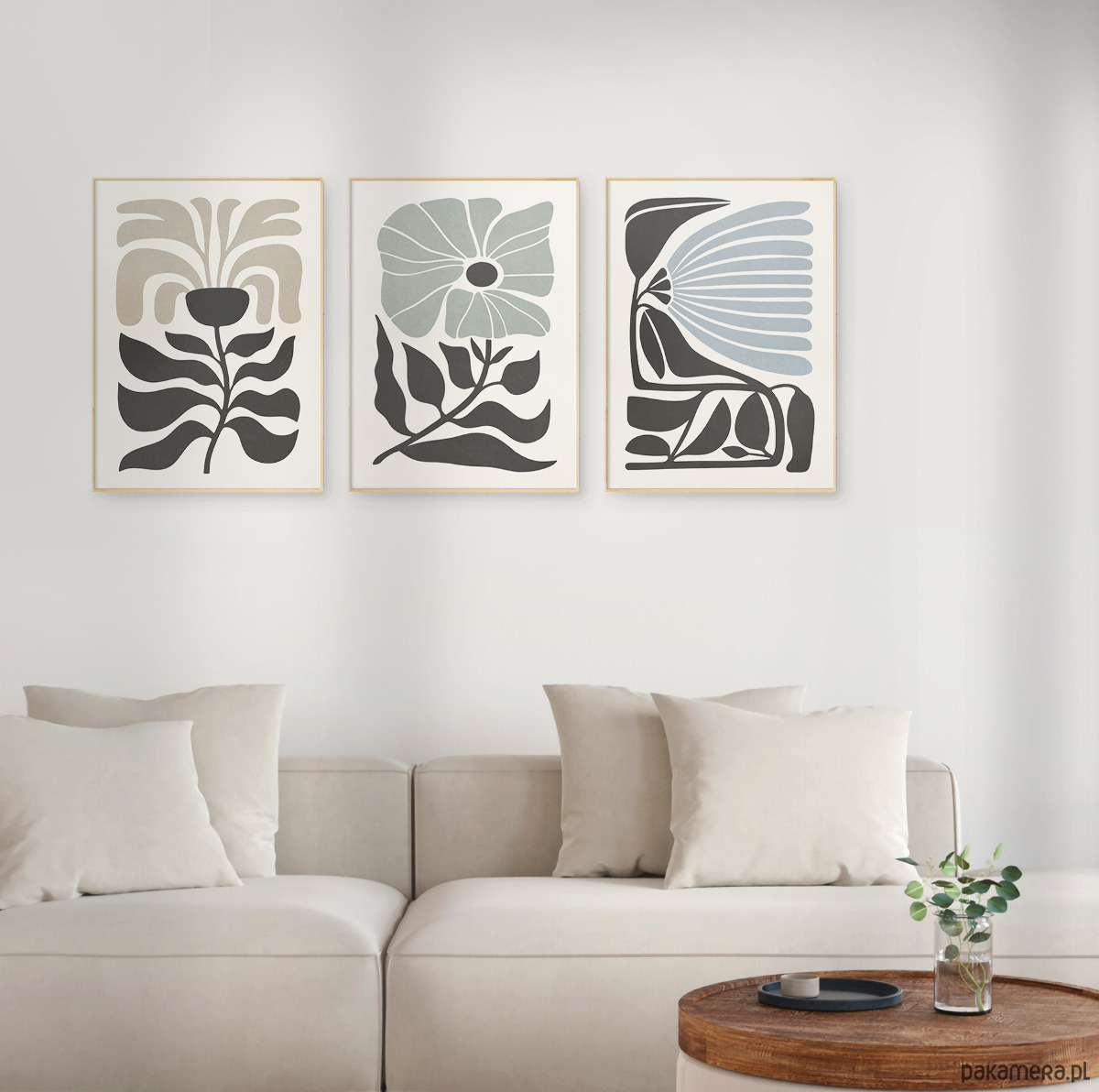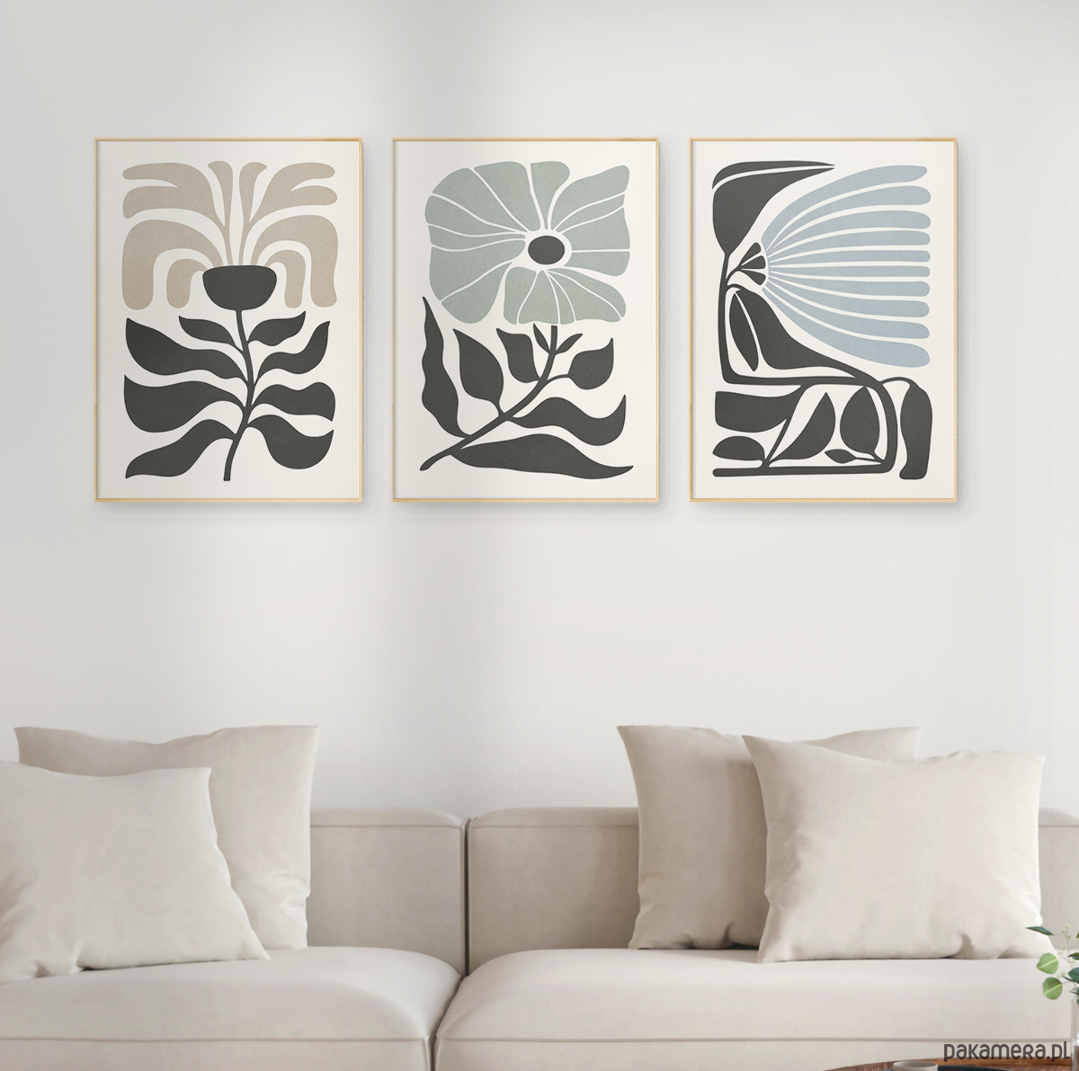 Zestaw trzech plakatów z motywem abstrakcyjnych kwiatów i roślin. Spójna kompozycja, stylowa, minimalistyczna paleta barw oraz subtelna tekstura nadają plakatom wyjątkowy charakter, doskonale wpisując się w nowoczesne wnętrza.
