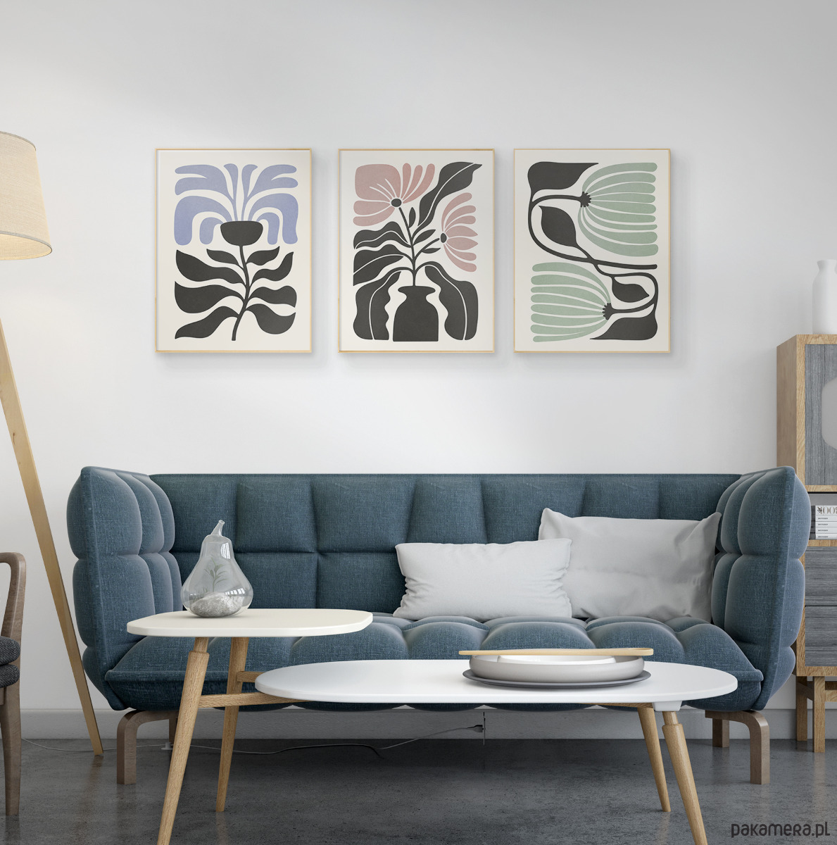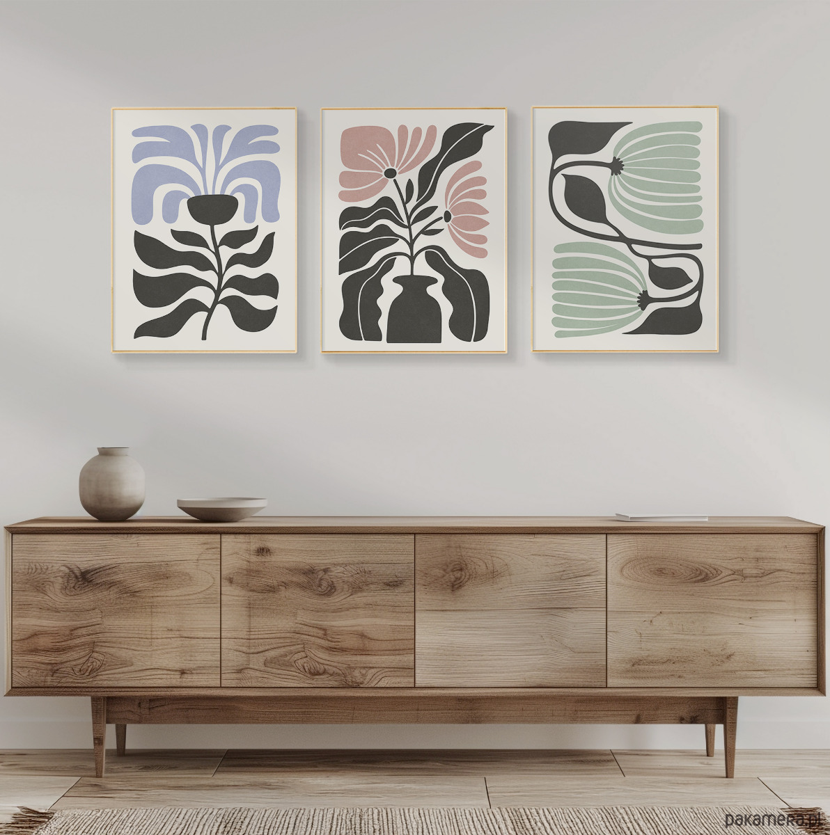 Zestaw trzech plakatów z motywem abstrakcyjnych kwiatów i roślin. Spójna kompozycja, stylowa paleta barw oraz subtelna tekstura nadają plakatom wyjątkowy charakter, doskonale wpisując się w nowoczesne wnętrza.