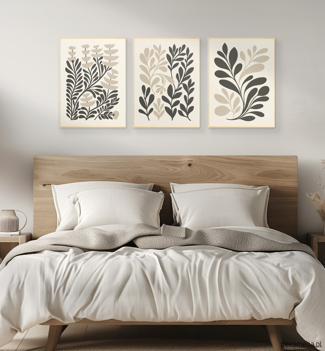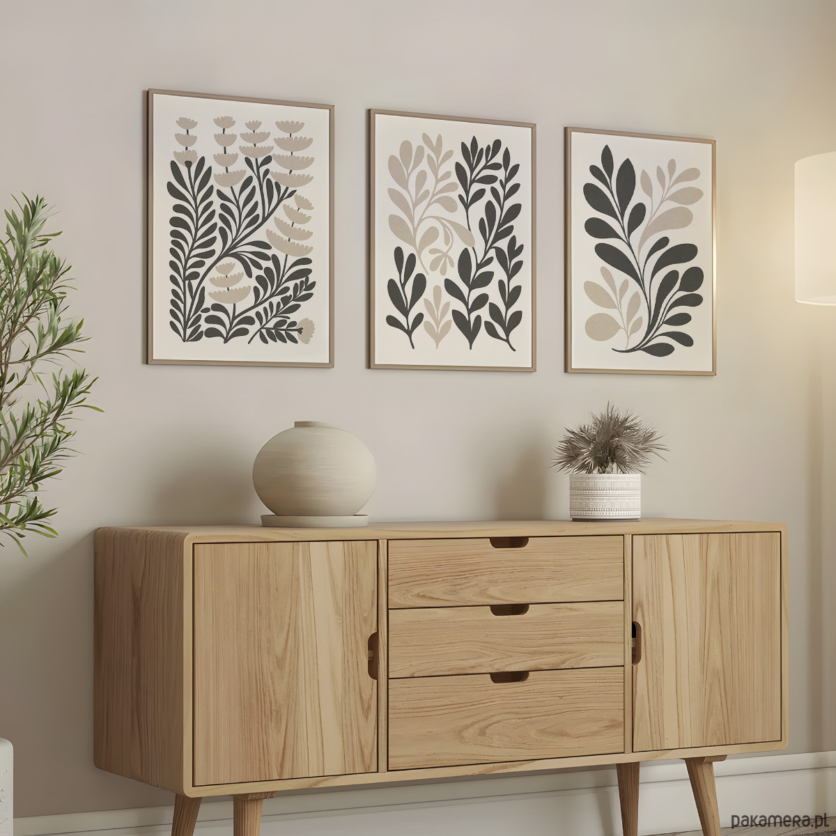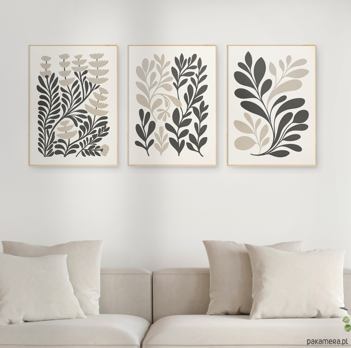 Zestaw trzech plakatów z motywem abstrakcyjnych roślin, liści i kwiatów. Spójna kompozycja, stylowa beżowa paleta barw oraz subtelna tekstura nadają plakatom wyjątkowy charakter, doskonale wpisując się w nowoczesne wnętrza.