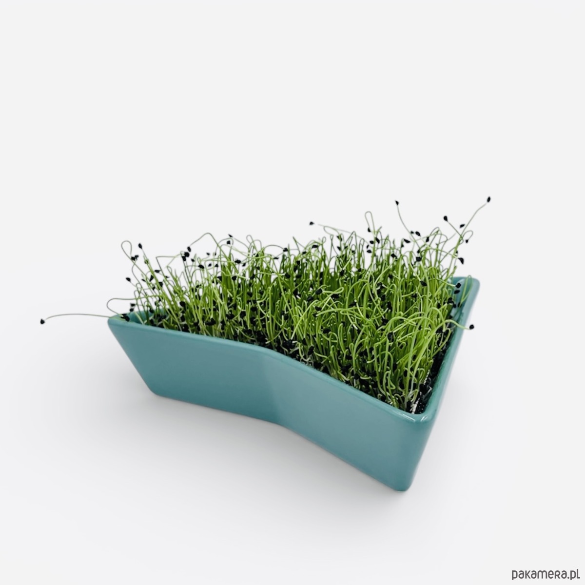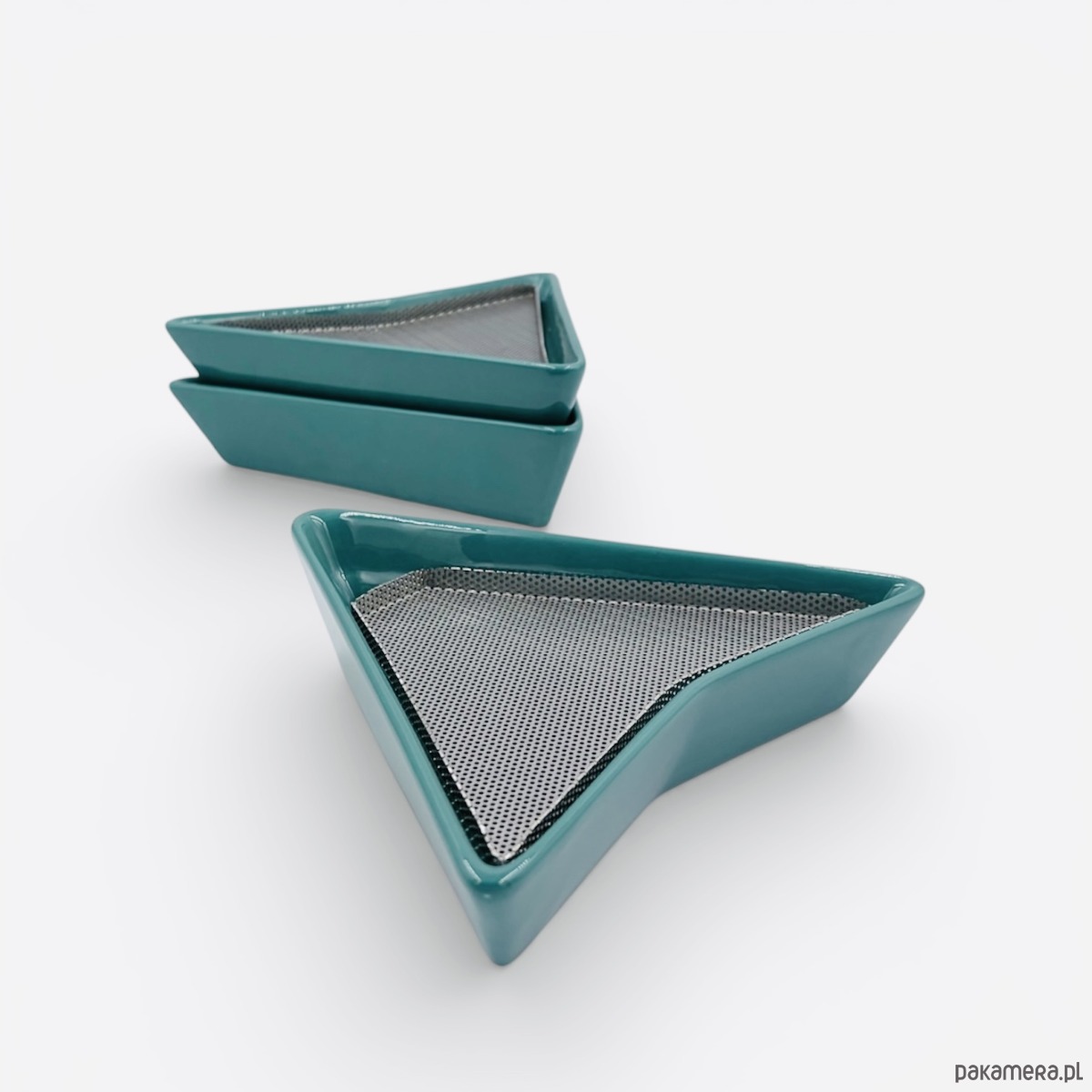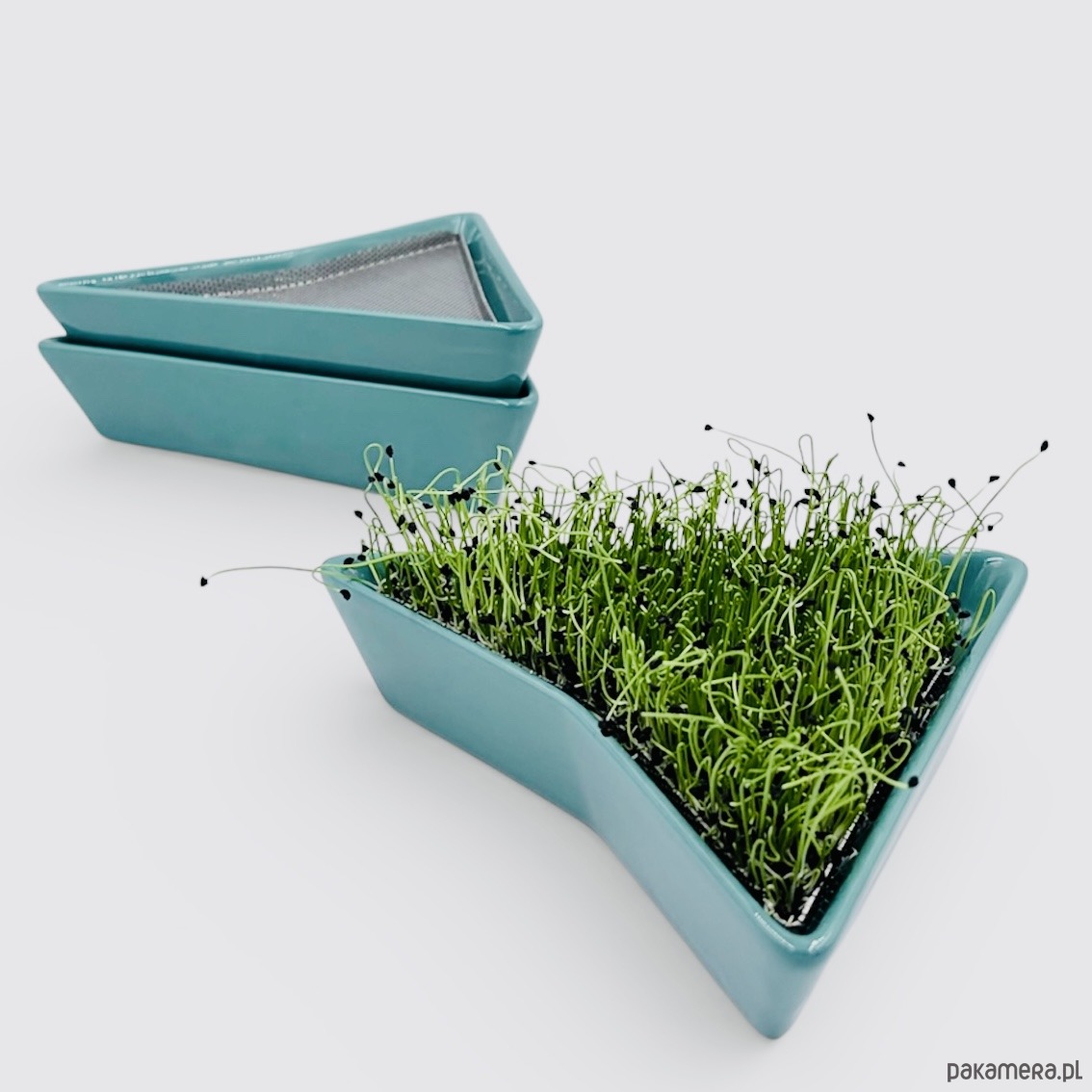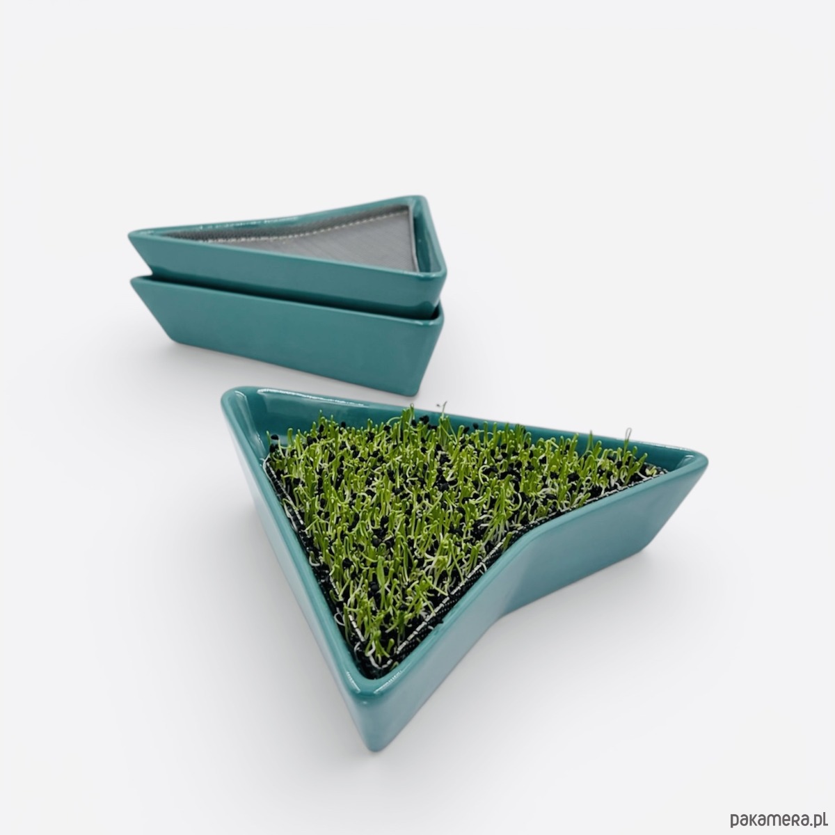Zestaw 3 kiełkowników w kolorze morskim, w skład którego wchodzą: 3 ceramiczne miski, 3 sitka wykonane ze stali nierdzewnej oraz opakowania wraz z instrukcją obsługi.