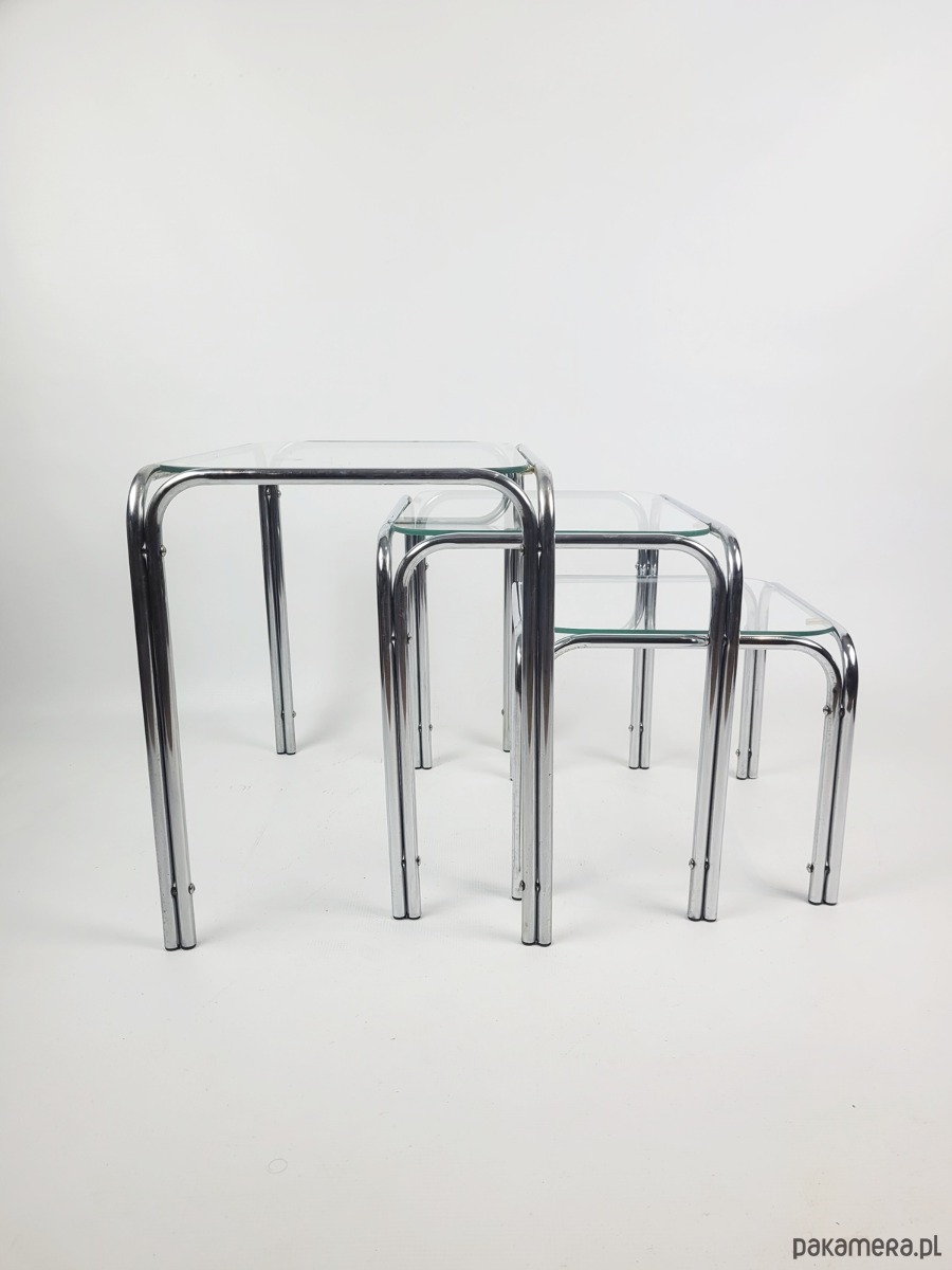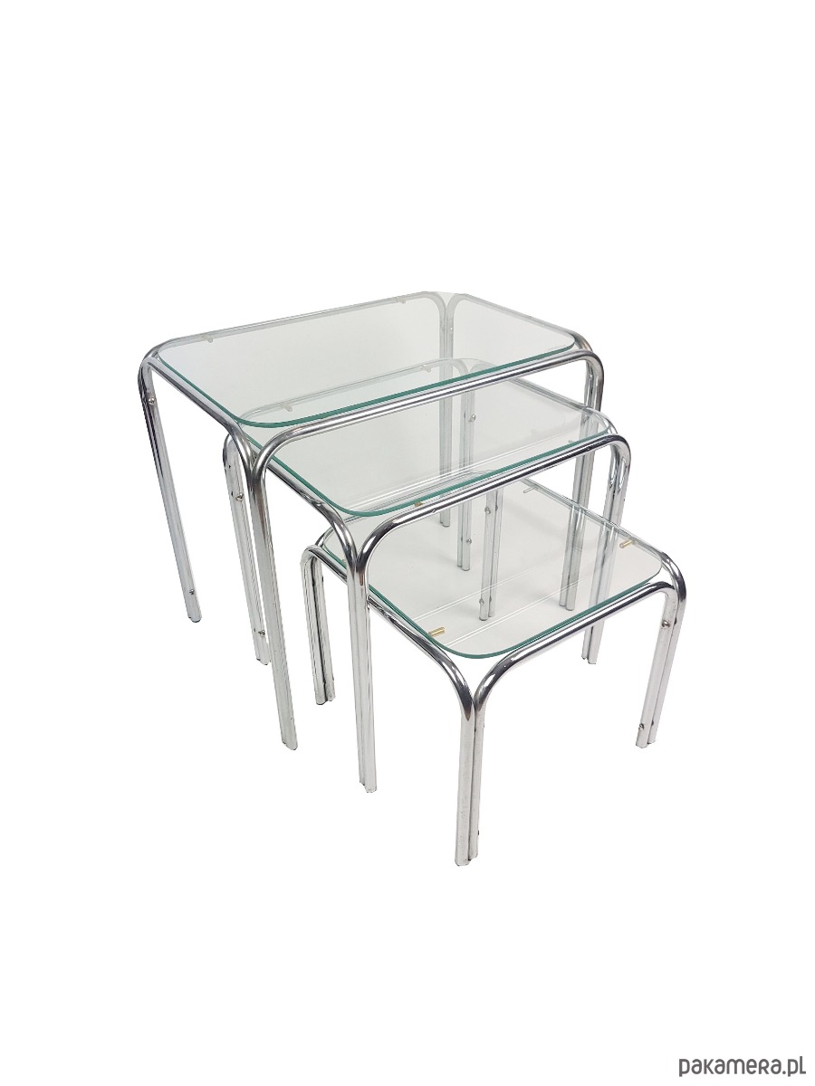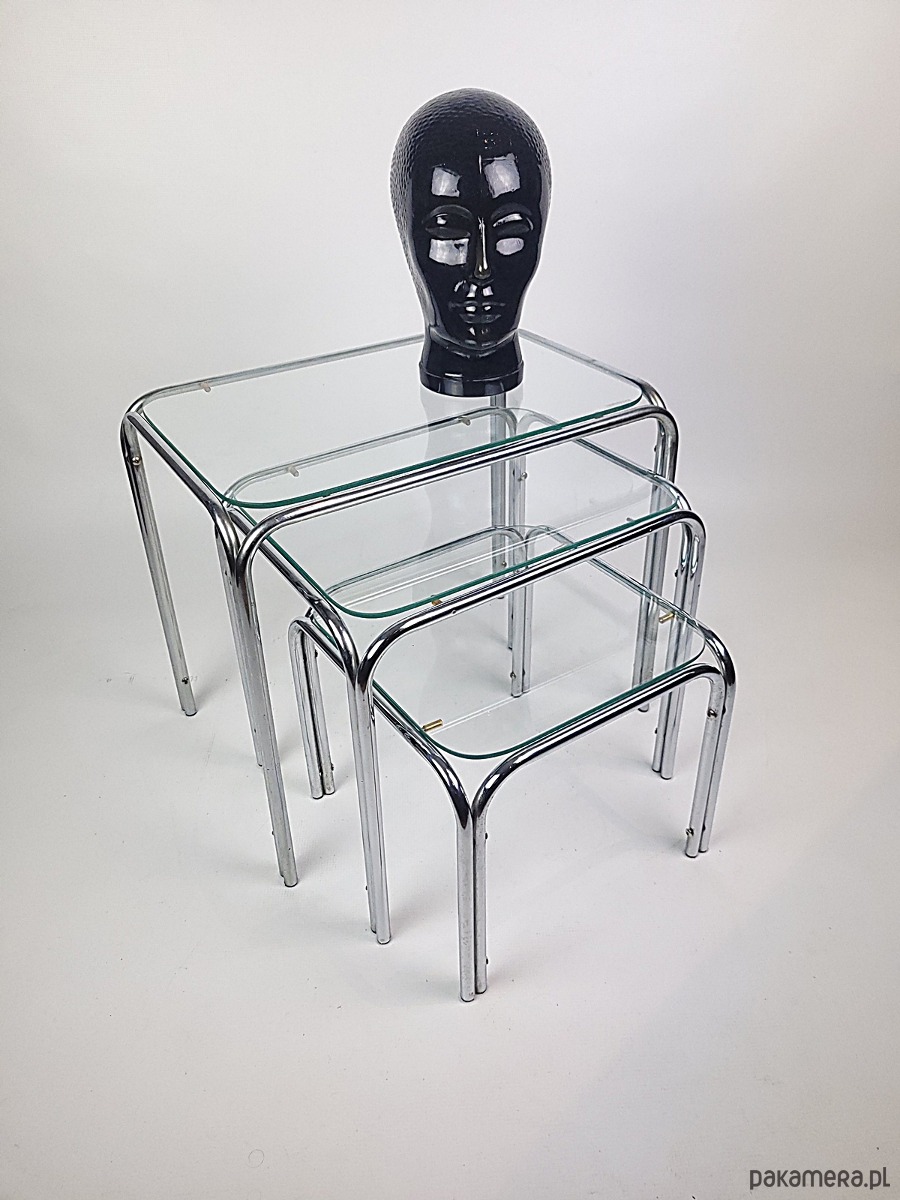 Prezentujemy wyjątkowy komplet trzech stolików typu nesting zachowany w doskonałej estetyce ery kosmicznej. Meble charakteryzują się minimalistyczną formą opartą na giętych chromowanych rurkach oraz blatach z grubego hartowanego szkła. To klasyczny przykład wzornictwa lat siedemdziesiątych łączący industrialną lekkość metalu z elegancją szklanych tafli. Konstrukcja zestawu pozwala na całkowite wsunięcie mniejszych stolików pod największy co czyni go niezwykle funkcjonalnym rozwiązaniem w mniejszych wnętrzach. Zaokrąglone krawędzie stelaża oraz transparentne blaty sprawiają że meble nie przytłaczają przestrzeni a ich srebrzysty blask dodaje wnętrzu luksusowego sznytu. Komplet idealnie wpisuje się w klimat mid century modern oraz nowoczesne aranżacje typu loft. Stoliki zachowane są w oryginalnym stanie vintage z naturalną patyną na chromowanych elementach która podkreśla ich autentyczne pochodzenie. Szklane blaty są przejrzyste i solidnie osadzone na gumowych podkładkach zapewniających stabilność. Stoliki w dobrym stanie posiadają delikatne utlenienia na chromowanej konstrukcji.