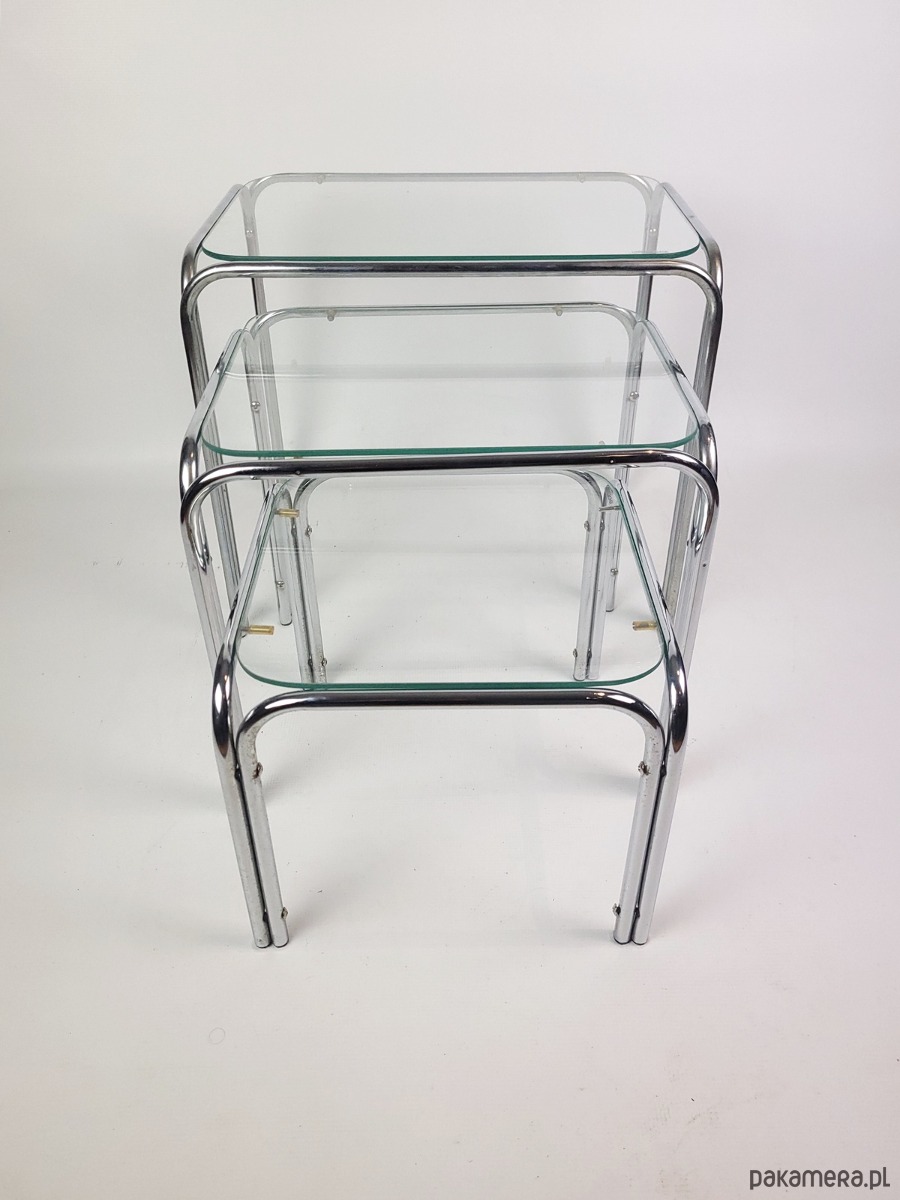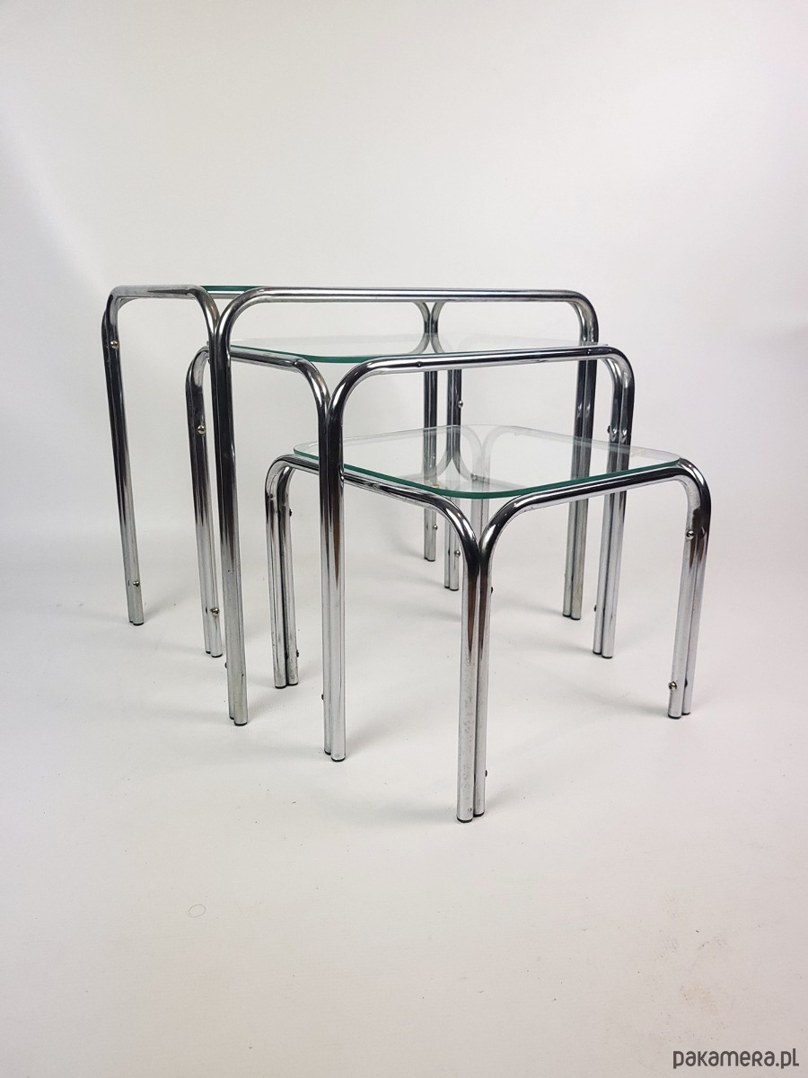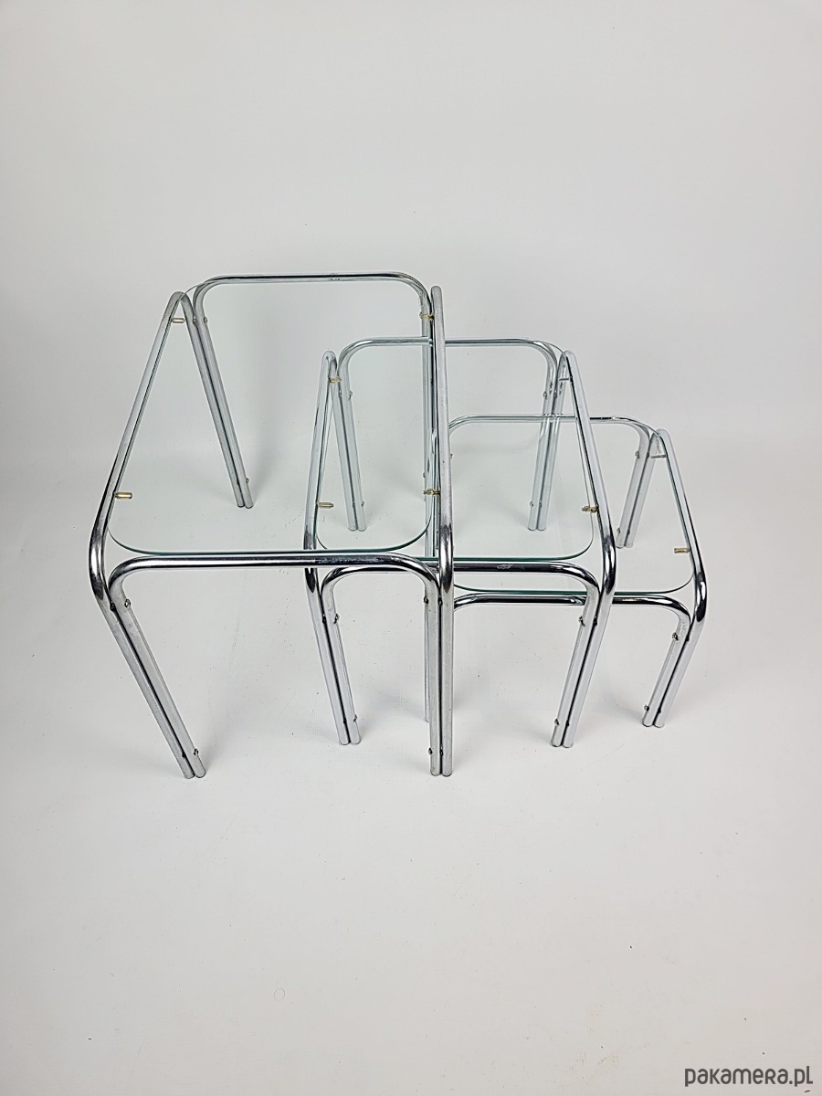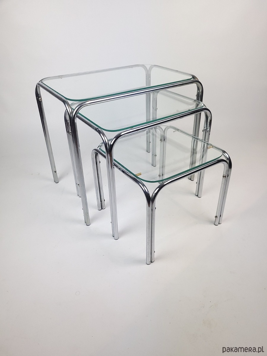 Prezentujemy wyjątkowy komplet trzech stolików typu nesting zachowany w doskonałej estetyce ery kosmicznej. Meble charakteryzują się minimalistyczną formą opartą na giętych chromowanych rurkach oraz blatach z grubego hartowanego szkła. To klasyczny przykład wzornictwa lat siedemdziesiątych łączący industrialną lekkość metalu z elegancją szklanych tafli. Konstrukcja zestawu pozwala na całkowite wsunięcie mniejszych stolików pod największy co czyni go niezwykle funkcjonalnym rozwiązaniem w mniejszych wnętrzach. Zaokrąglone krawędzie stelaża oraz transparentne blaty sprawiają że meble nie przytłaczają przestrzeni a ich srebrzysty blask dodaje wnętrzu luksusowego sznytu. Komplet idealnie wpisuje się w klimat mid century modern oraz nowoczesne aranżacje typu loft. Stoliki zachowane są w oryginalnym stanie vintage z naturalną patyną na chromowanych elementach która podkreśla ich autentyczne pochodzenie. Szklane blaty są przejrzyste i solidnie osadzone na gumowych podkładkach zapewniających stabilność. Stoliki w dobrym stanie posiadają delikatne utlenienia na chromowanej konstrukcji.