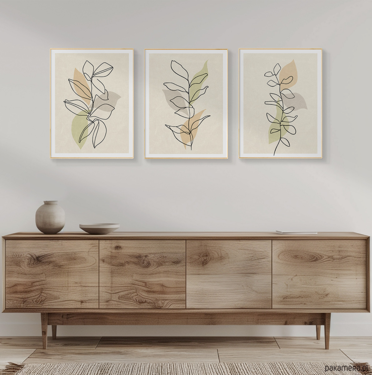 Zestaw 3 stylowych plakatów w stylu Boho, rośliny, liście, kwiaty, line art.