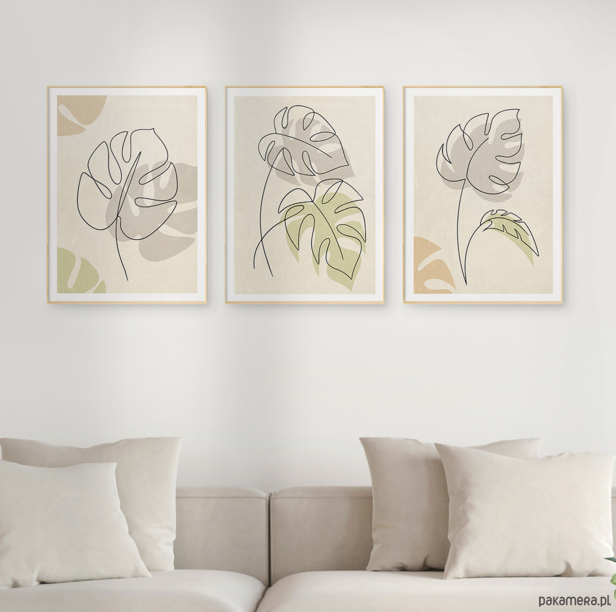 Zestaw trzech plakatów w popularnym stylu boho z motywem rośliny monstery. Minimalistyczny design, beżowa kolorystyka oraz delikatna tekstura to elementy, które doskonale podkreślają wyjątkowy charakter tego stylu.