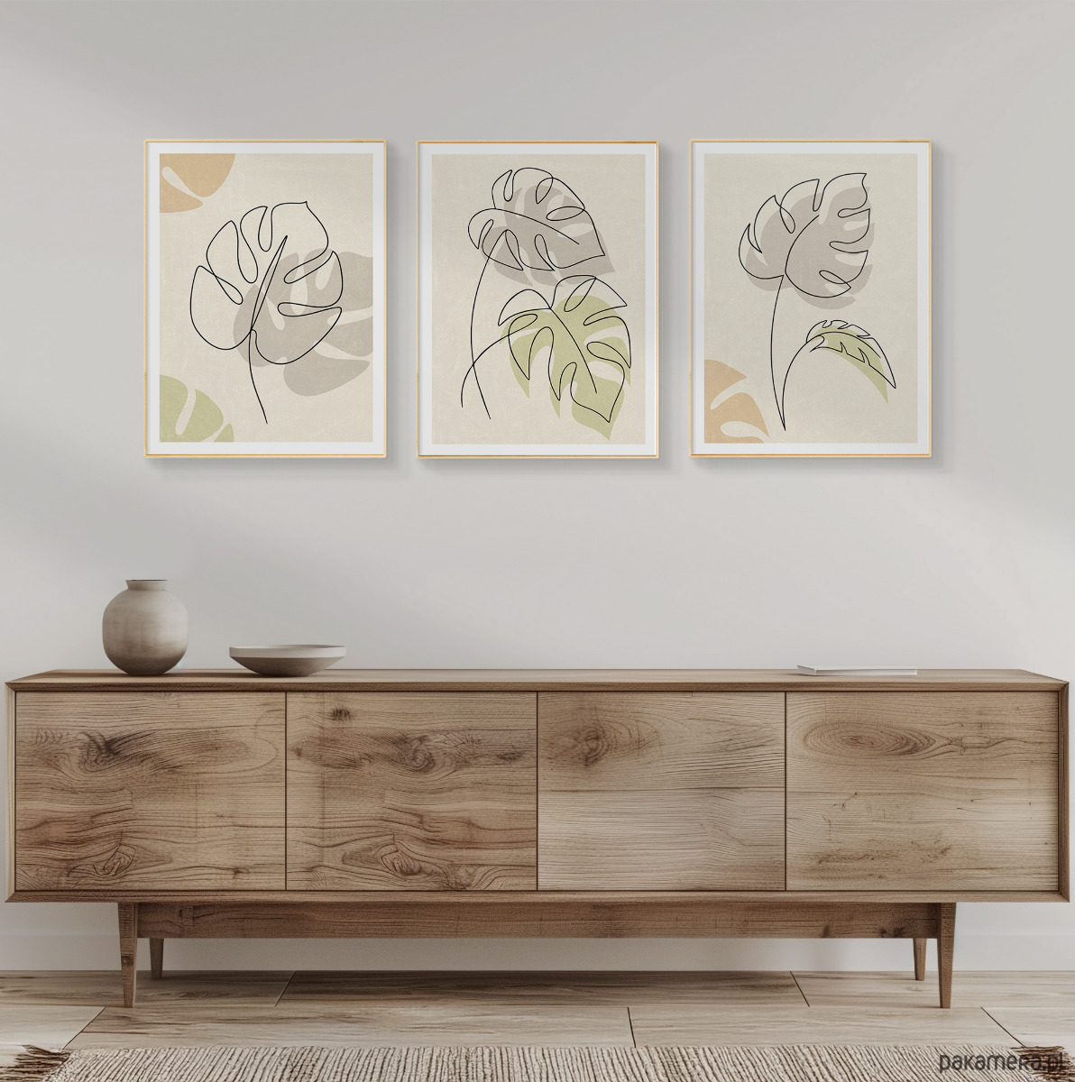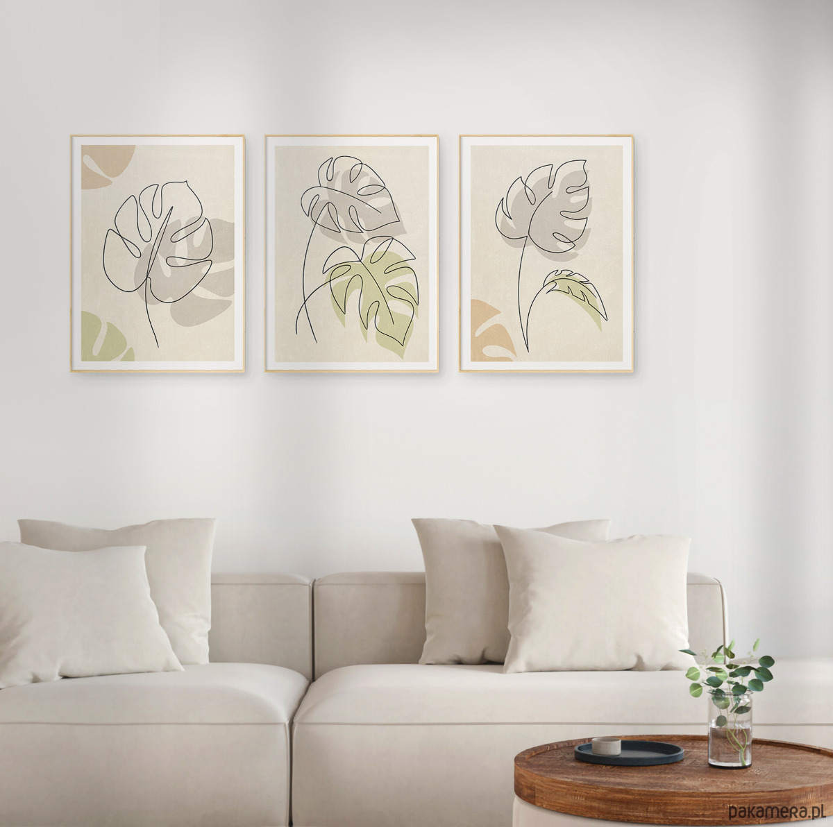 Zestaw 3 stylowych plakatów w stylu Boho, rośliny, monstera, line art.
