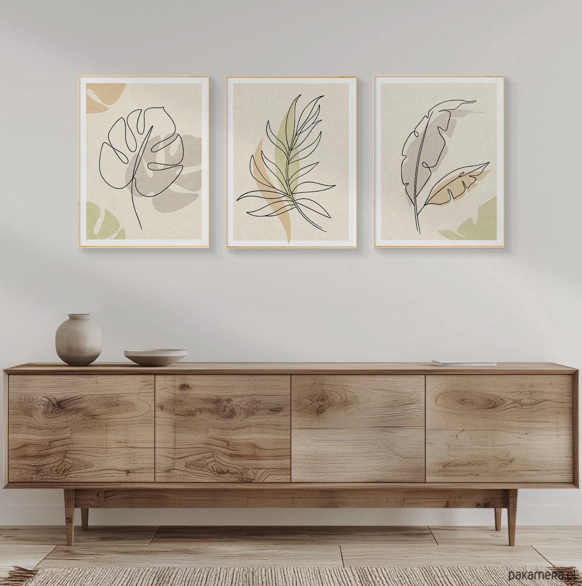 Zestaw 3 stylowych plakatów w stylu Boho, rośliny, monstera, line art.
