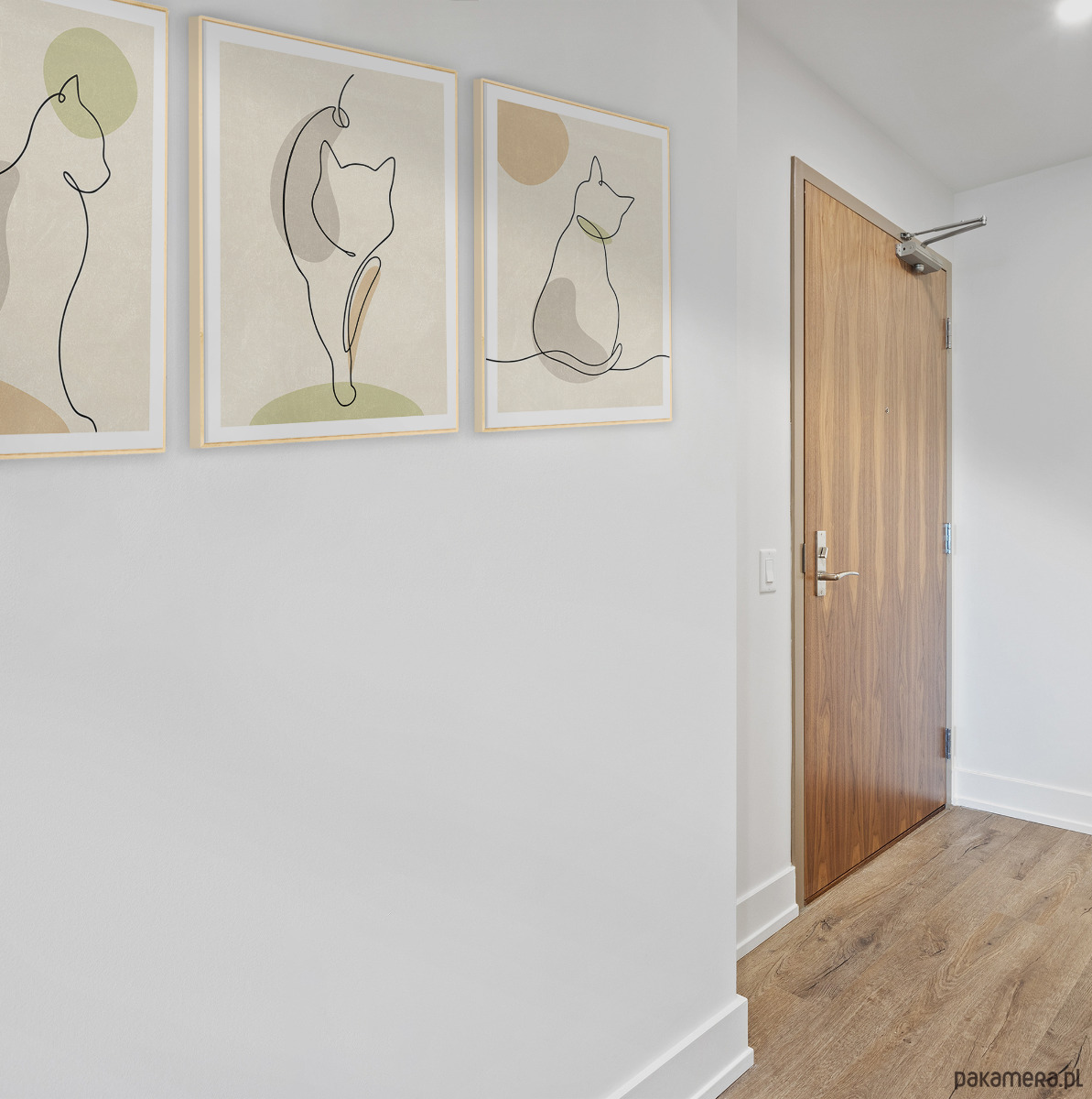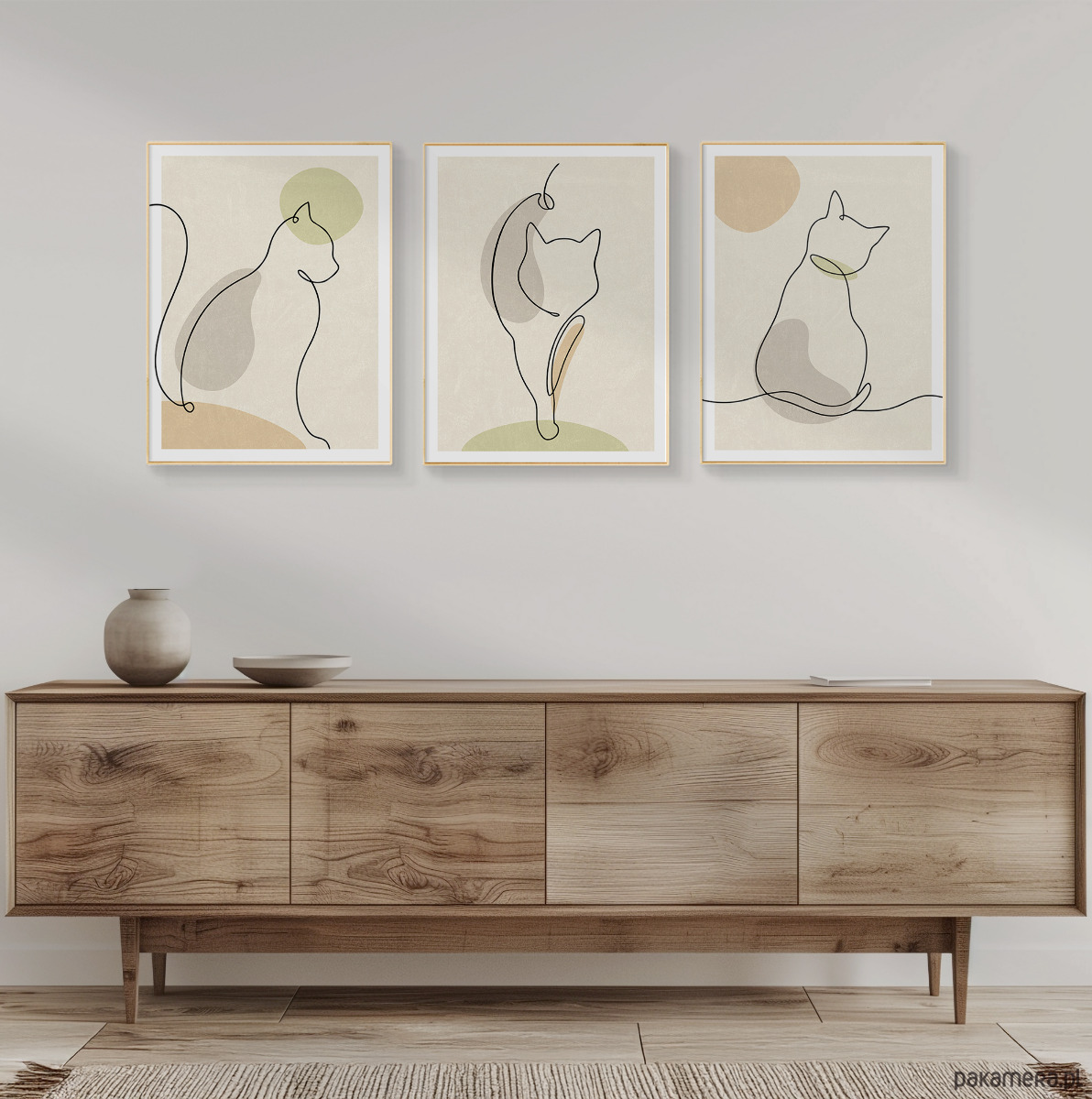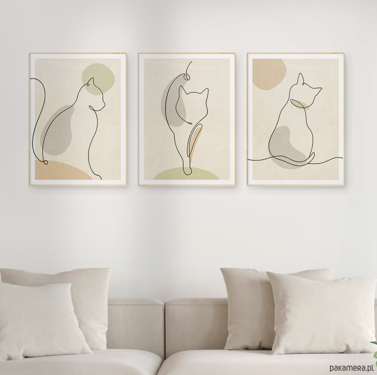 Zestaw 3 stylowych plakatów w stylu Boho, zwierzęta, kot, line art.