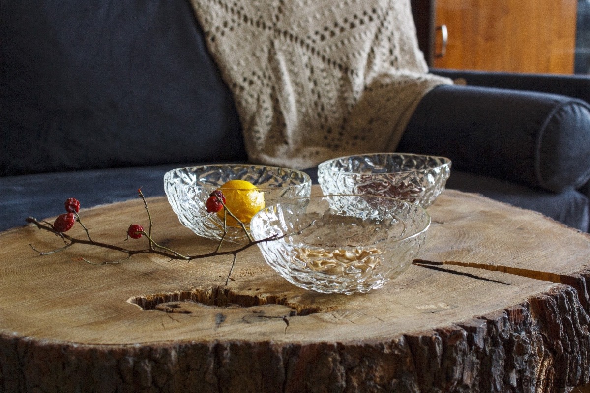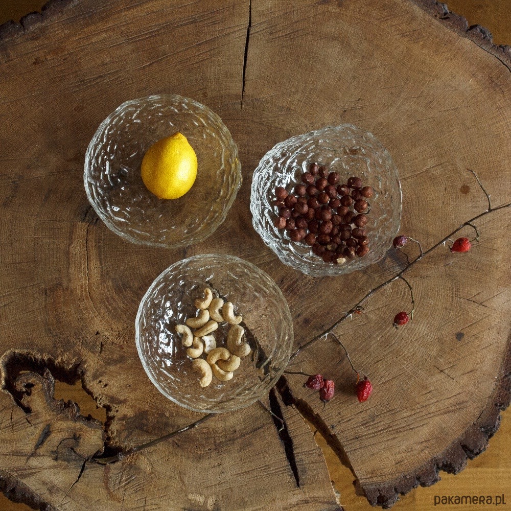 Zestaw trzech unikatowych szklanych miseczek na drobne przekąski. Każda jest ciut inna, wszystkie prowokują do integracji sensorycznej dzięki swojej fakturze i kształtom.