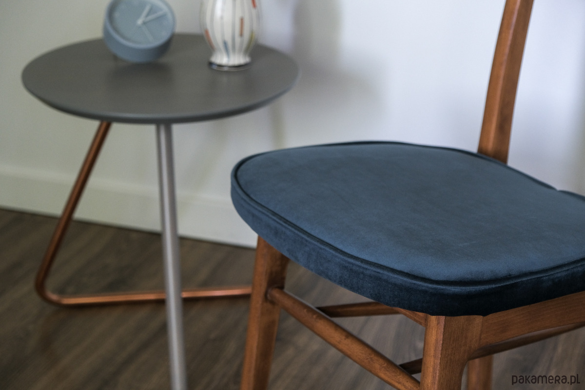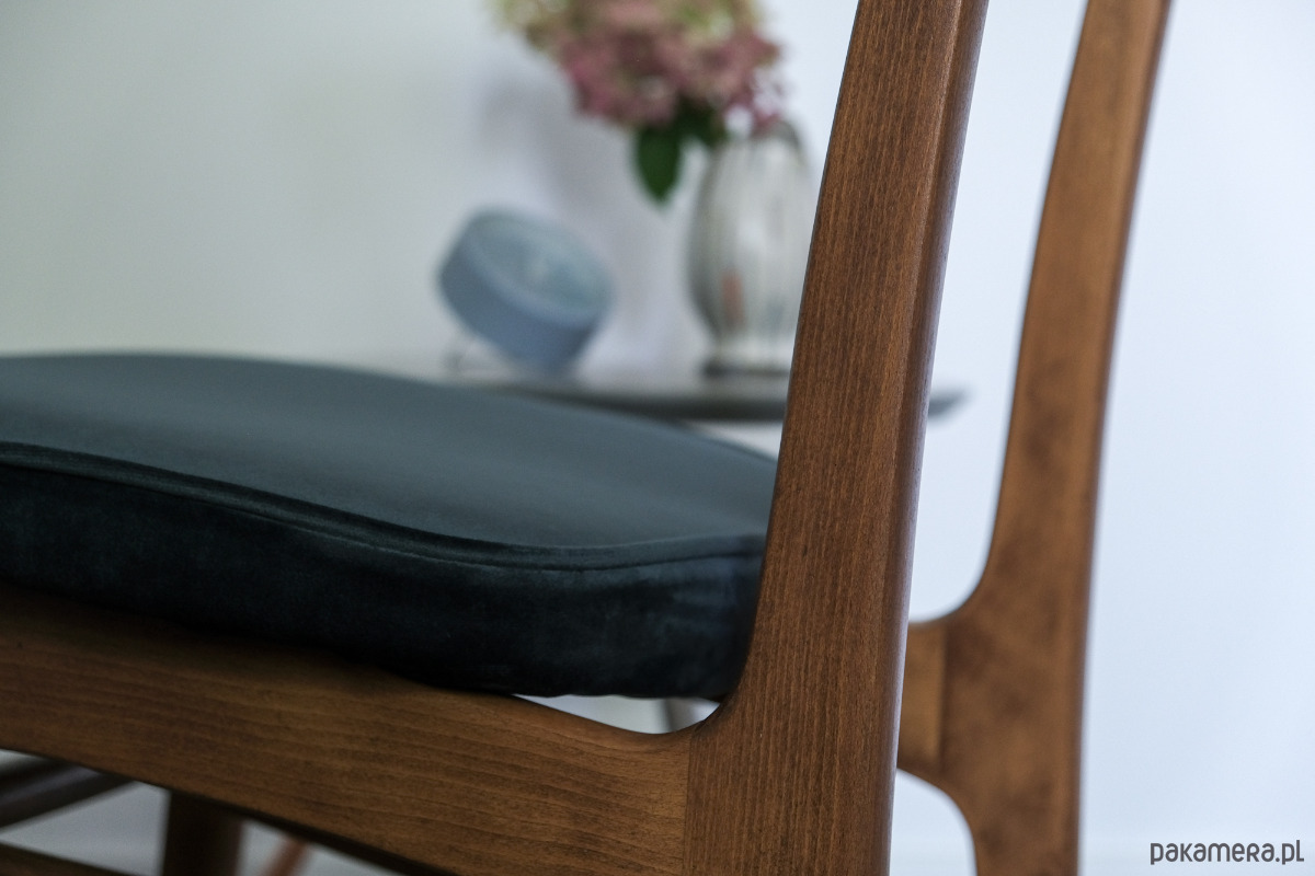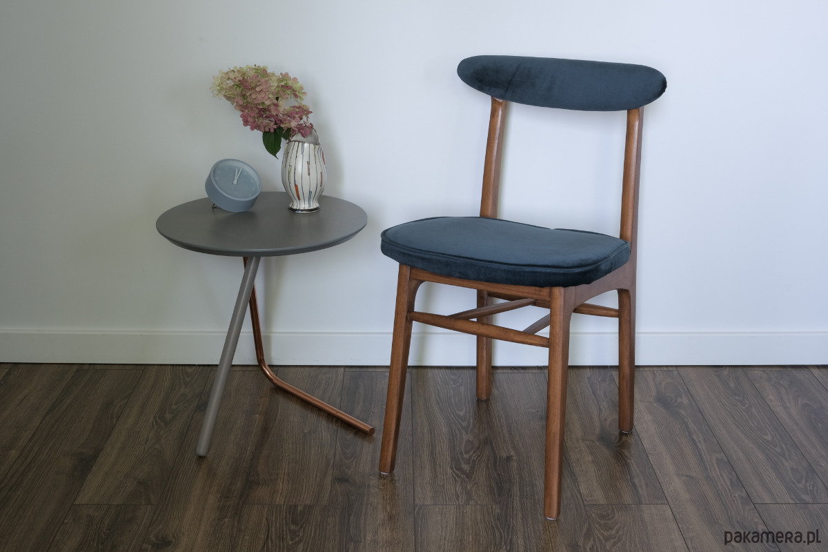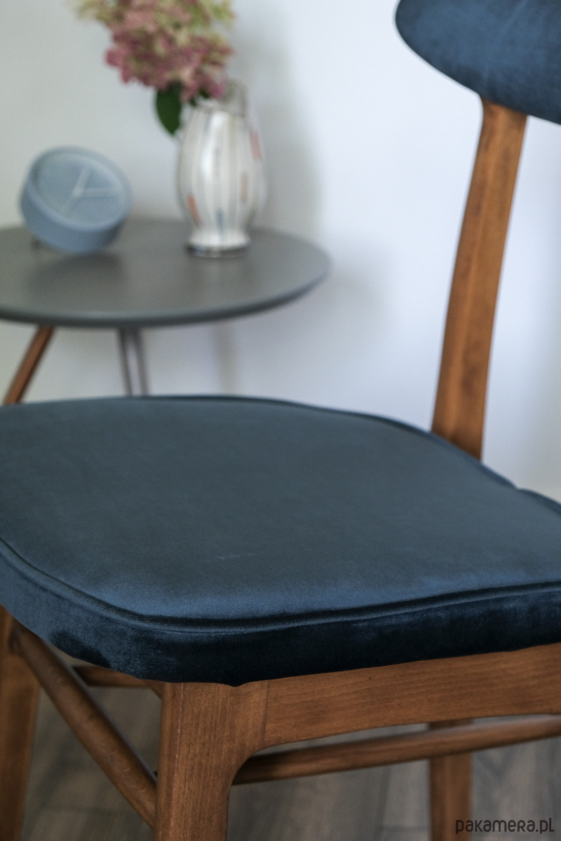 Całość w pięknej granatowej tkaninie typu velvet. Drewno zabezpieczone olejowoskiem Osmo w kolorze jasny orzech, wykończenie matowe.