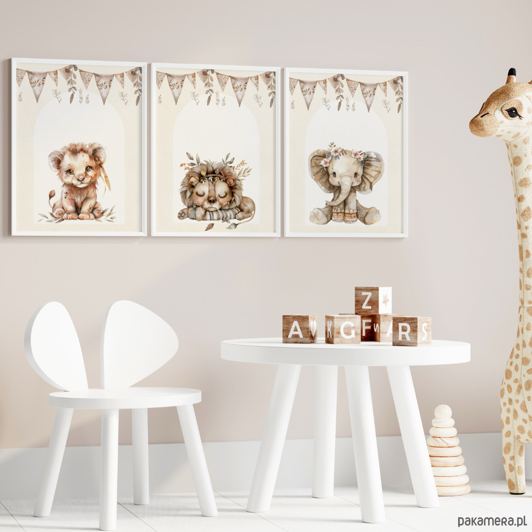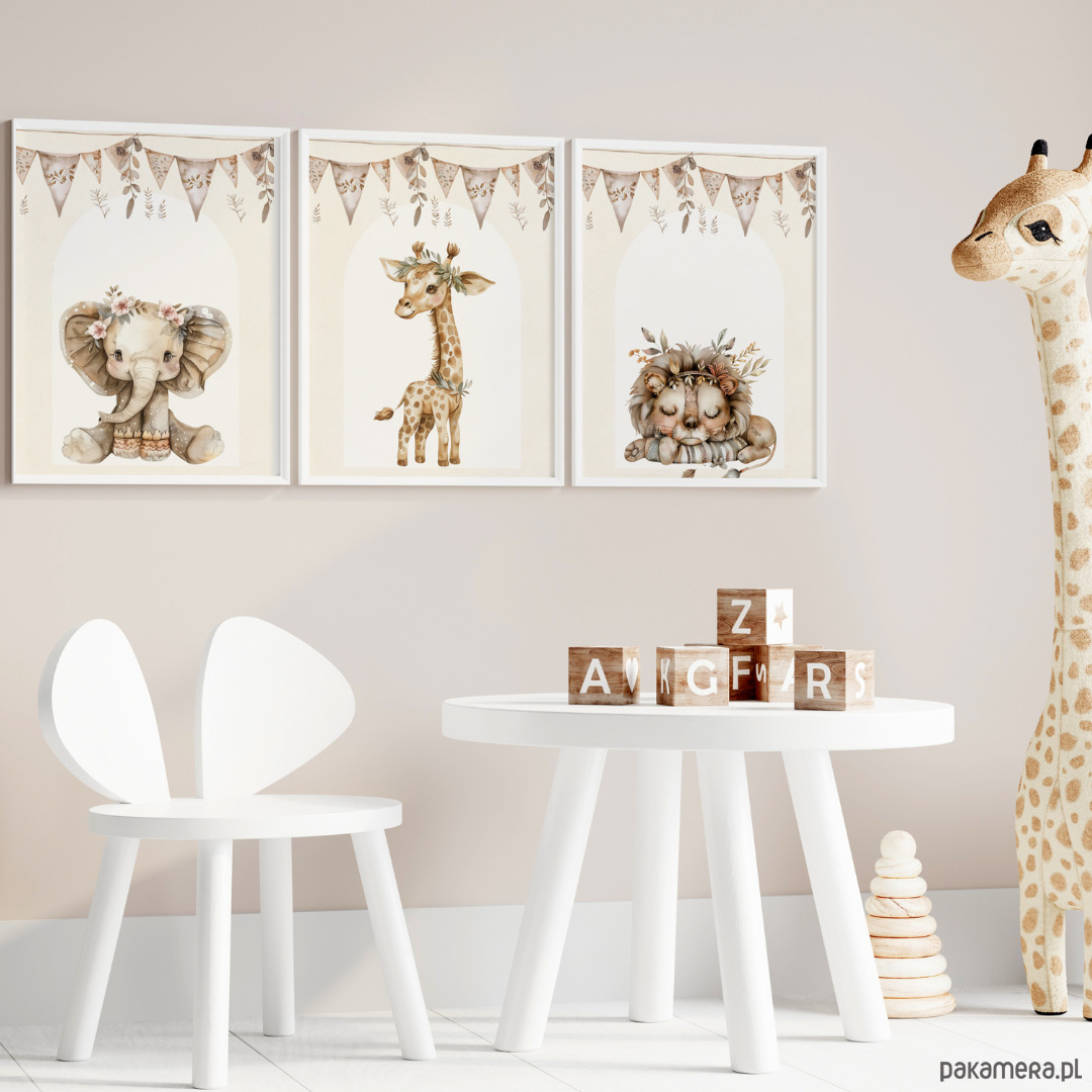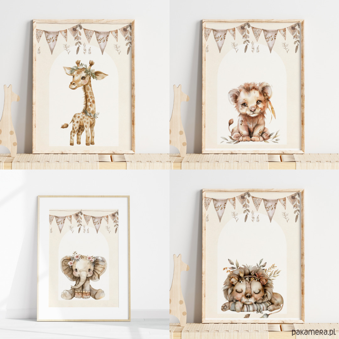 Zestaw 4 plakatów do pokoju dziecięcego w tematyce safari:
