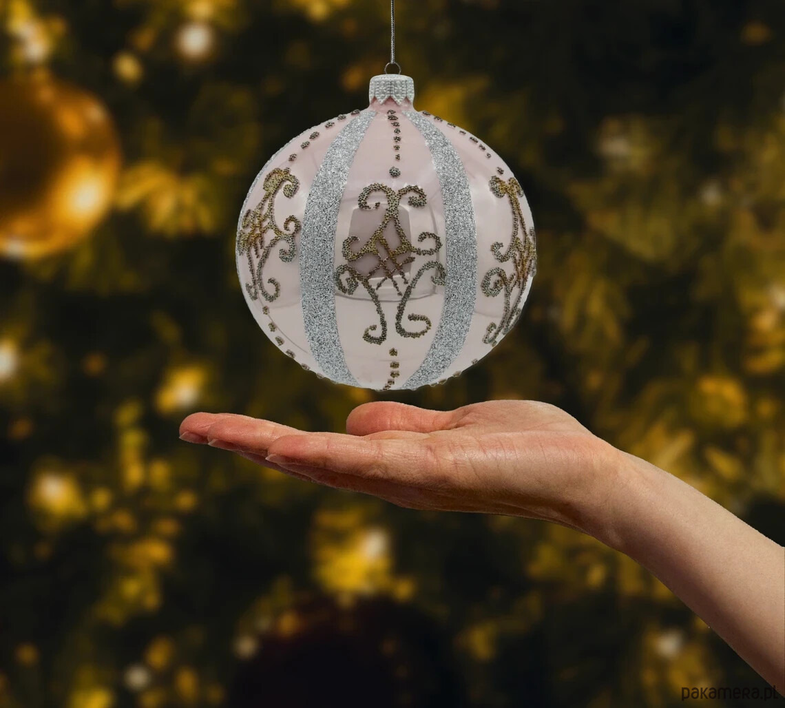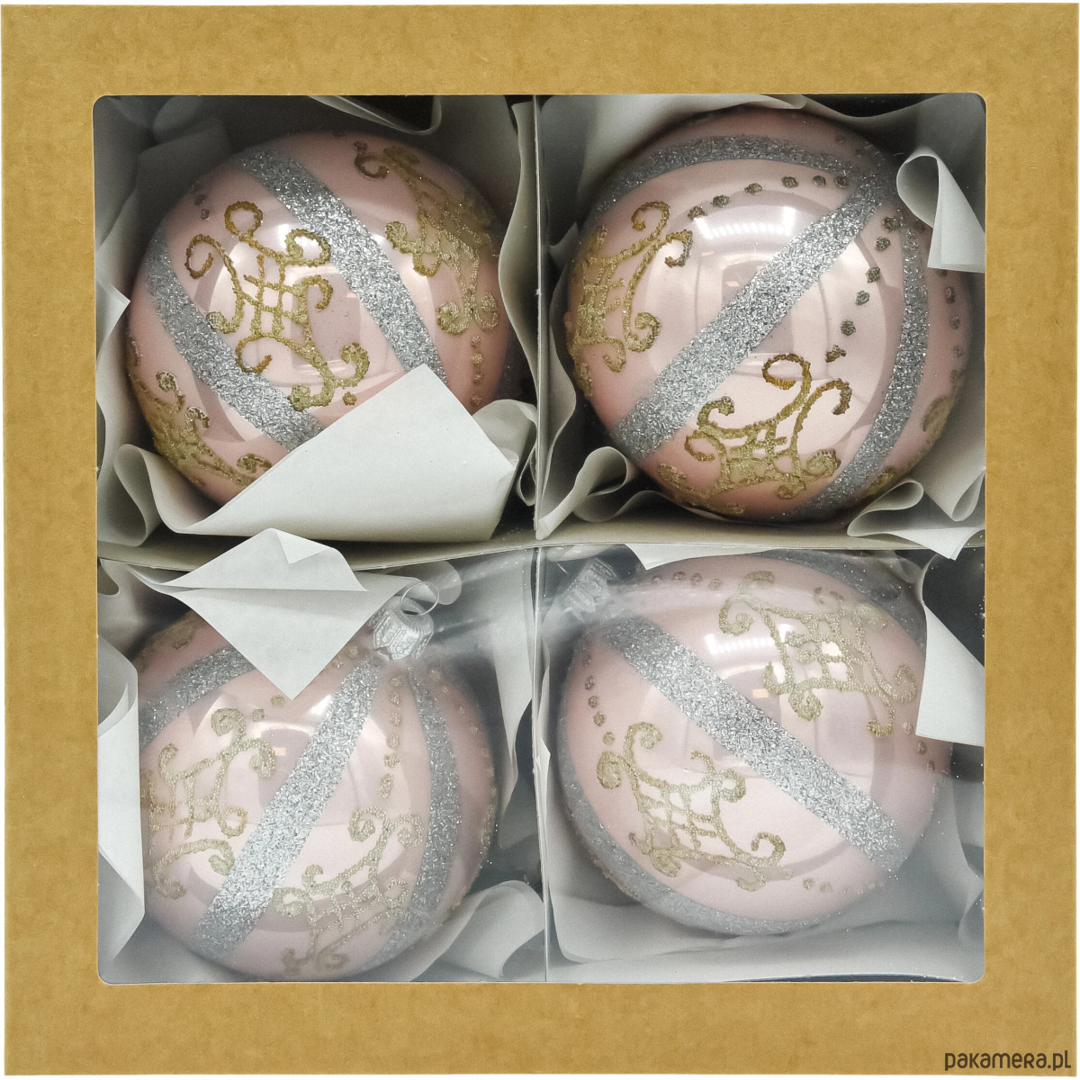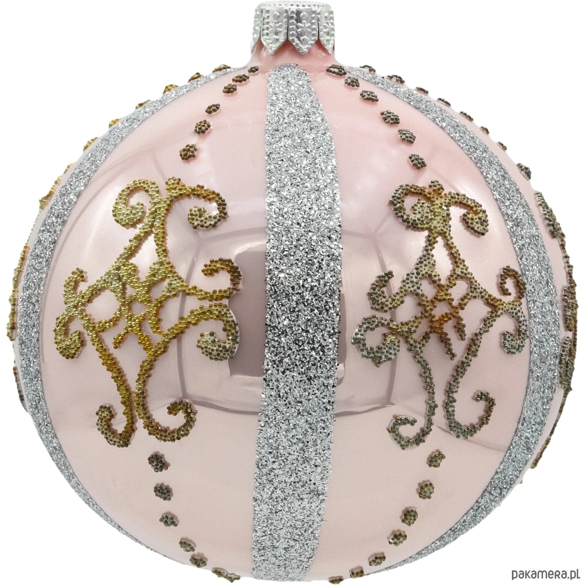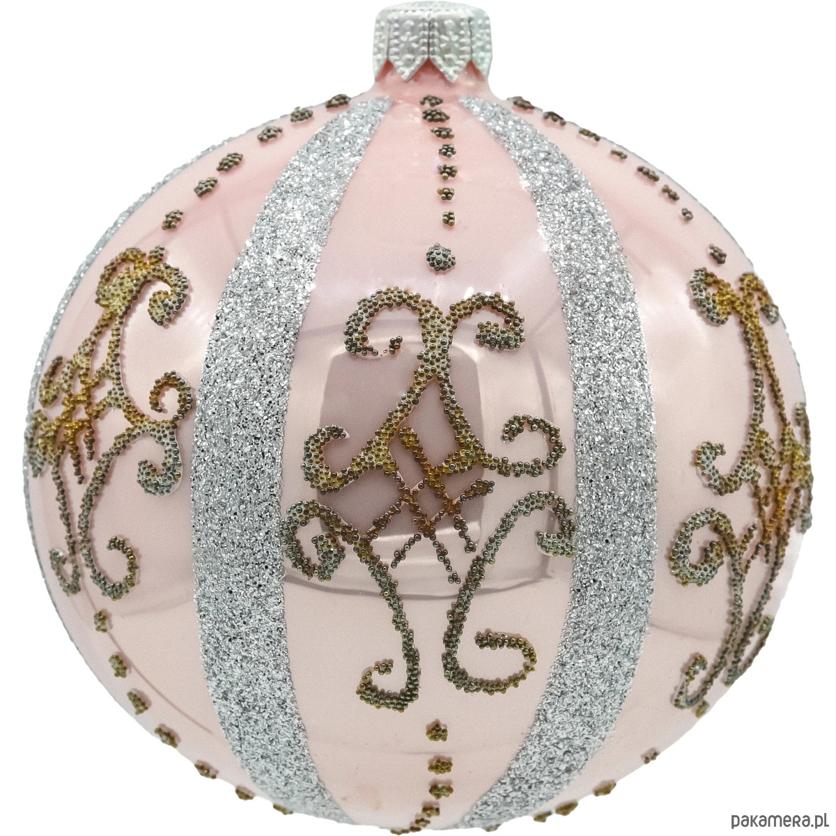 Wytworny komplet czterech ręcznie malowanych bombek choinkowych ze szkła dmuchanego o średnicy 10 cm. Delikatny, pudrowo-różowy kolor przełamują srebrne, brokatowe pasy biegnące pionowo przez całą bombkę oraz misterny, wypukły ornament w odcieniu szampańskiego złota (mikrokuleczki i drobny brokat). Całość dopełnia srebrna czapeczka z oczkiem do zawieszenia. To dekoracje w duchu glamour – subtelne, ale efektowne, idealne do pastelowych i eleganckich aranżacji świątecznych.