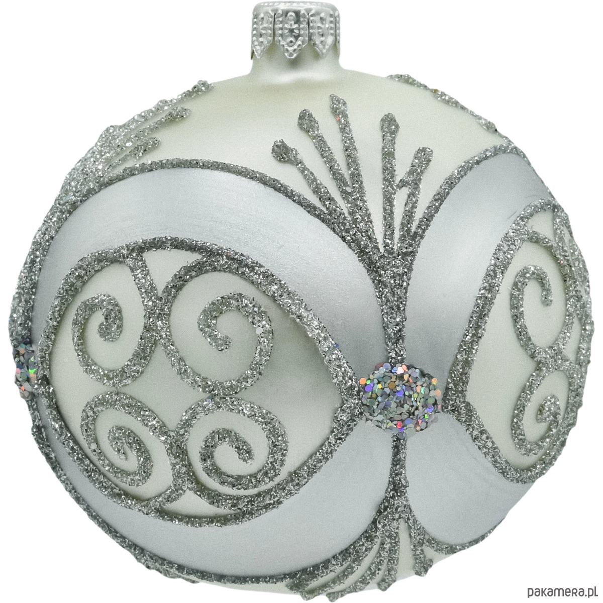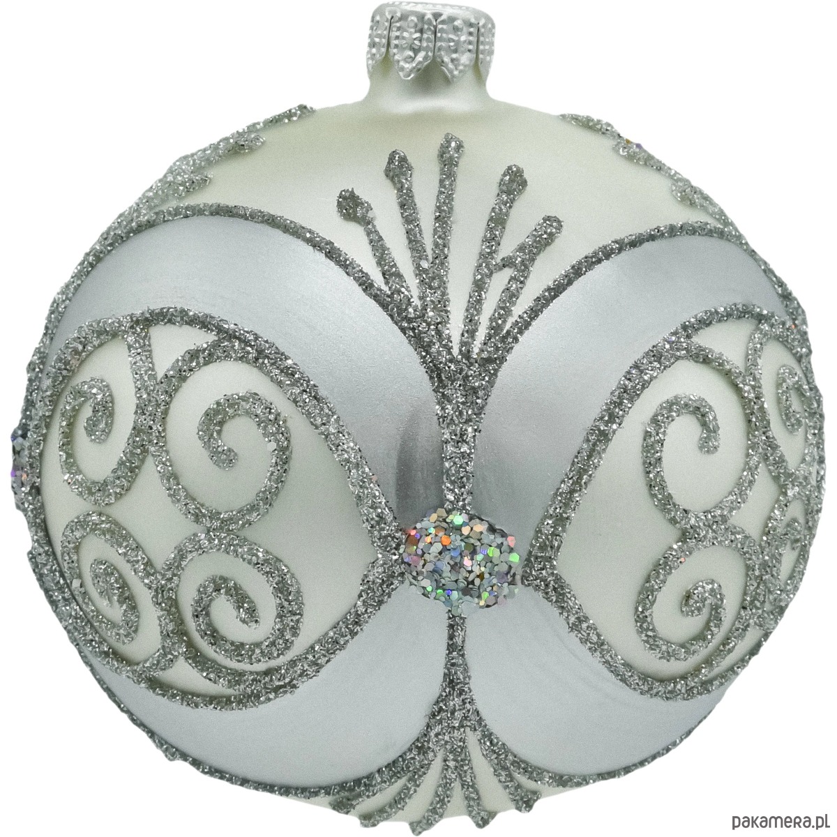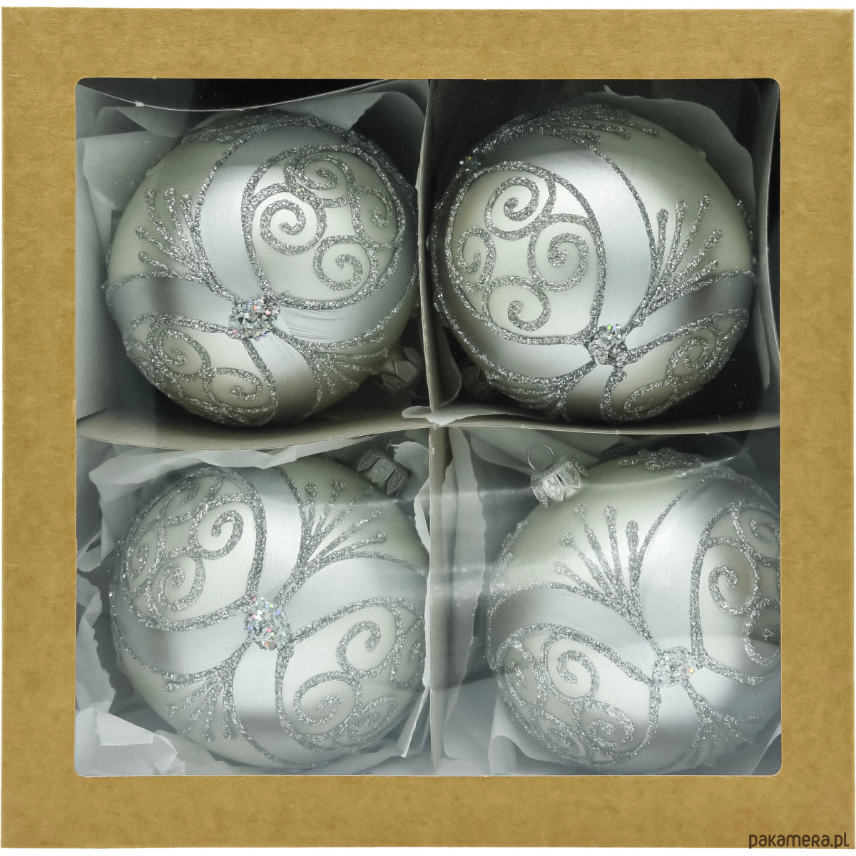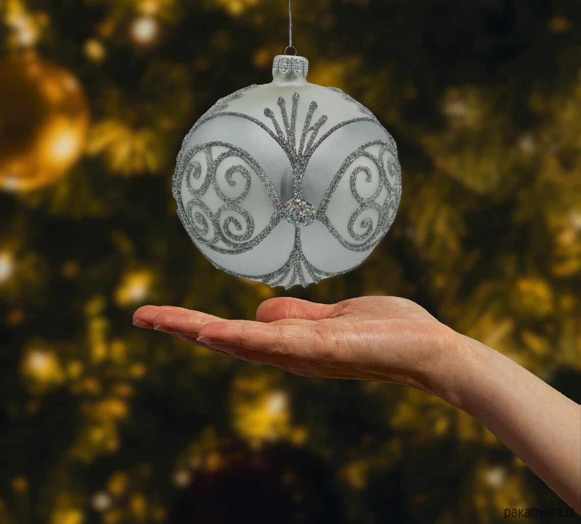 Wytworny komplet czterech szklanych bombek choinkowych 10 cm w odcieniach bieli i srebra. Każda bombka jest ręcznie zdobiona miękkimi, roślinnymi zawijasami z drobnego błyszczącego brokatu oraz akcentami z połyskujących kryształków (efekt delikatnego „diamentu”). Matowo-satynowe tło przełamane metalicznymi pasami daje elegancki kontrast i pięknie odbija światło lampek. To klasyka stylu glamour / modern classic, która doda choince hotelowej, domowej czy firmowej wyrafinowanego charakteru.