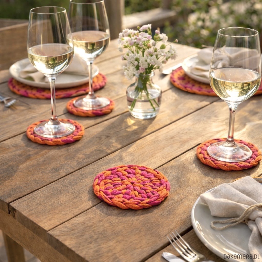 Sunset Muse to ręcznie wykonane podkładki inspirowane kolorami zachodzącego słońca, intensywnym różem i soczystą pomarańczą, które tworzą wyjątkową, energetyczną kompozycję. Każdy egzemplarz powstaje manualnie, dzięki czemu posiada unikalny charakter i widoczną, szlachetną strukturę splotu.