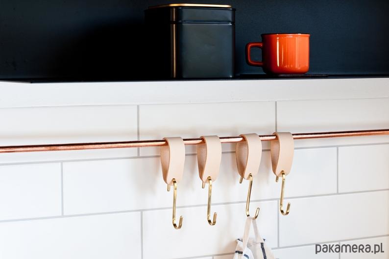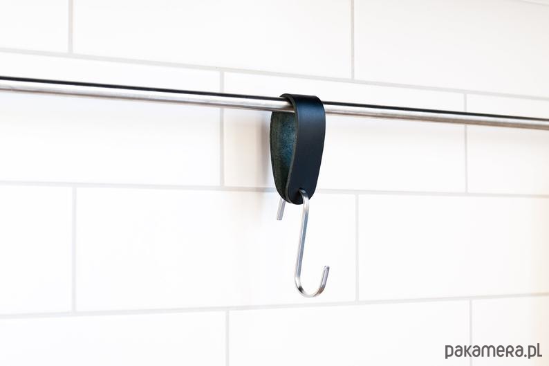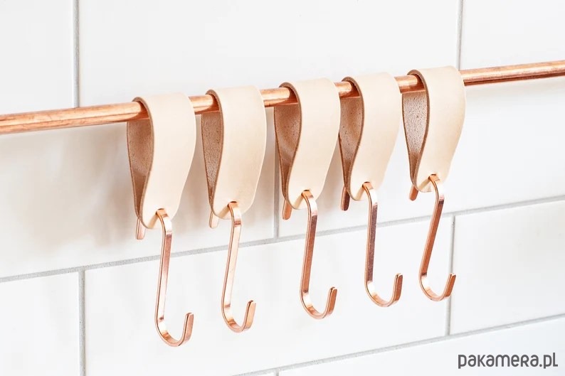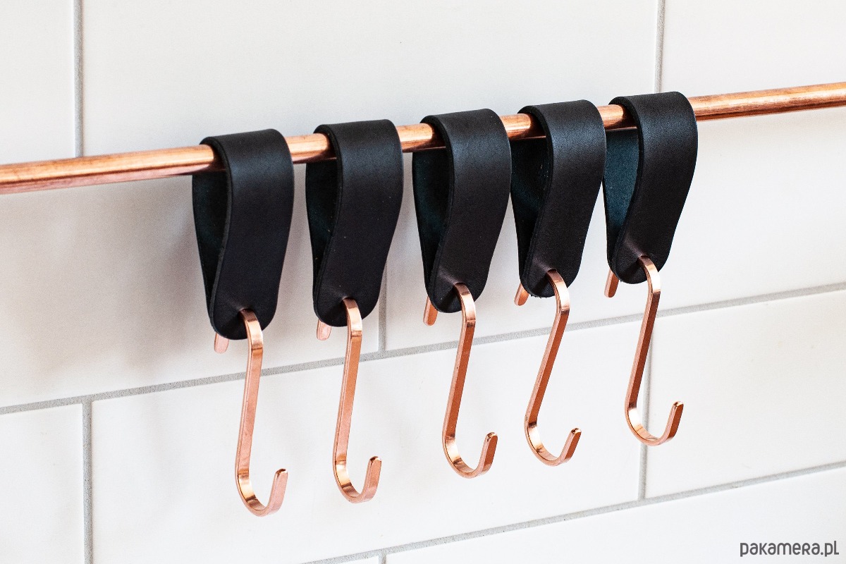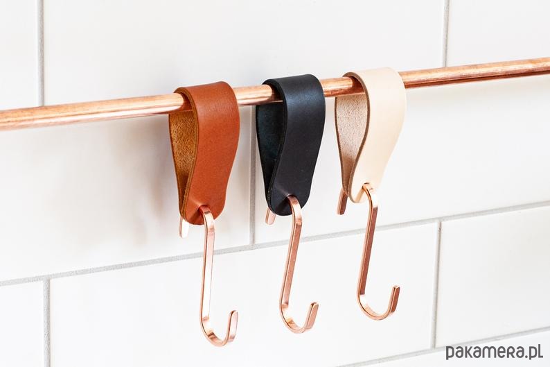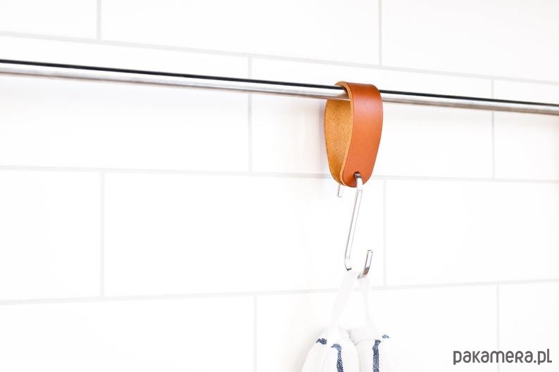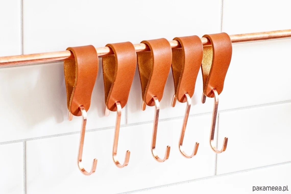 Zestaw 5 wieszaczków, haczyków "esek" na skórzanym pasku, idealne do zawieszenia na drążku w kuchni, łazience czy pokoju dziennym.