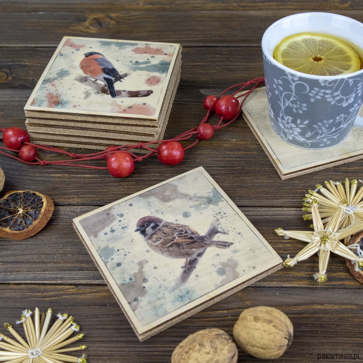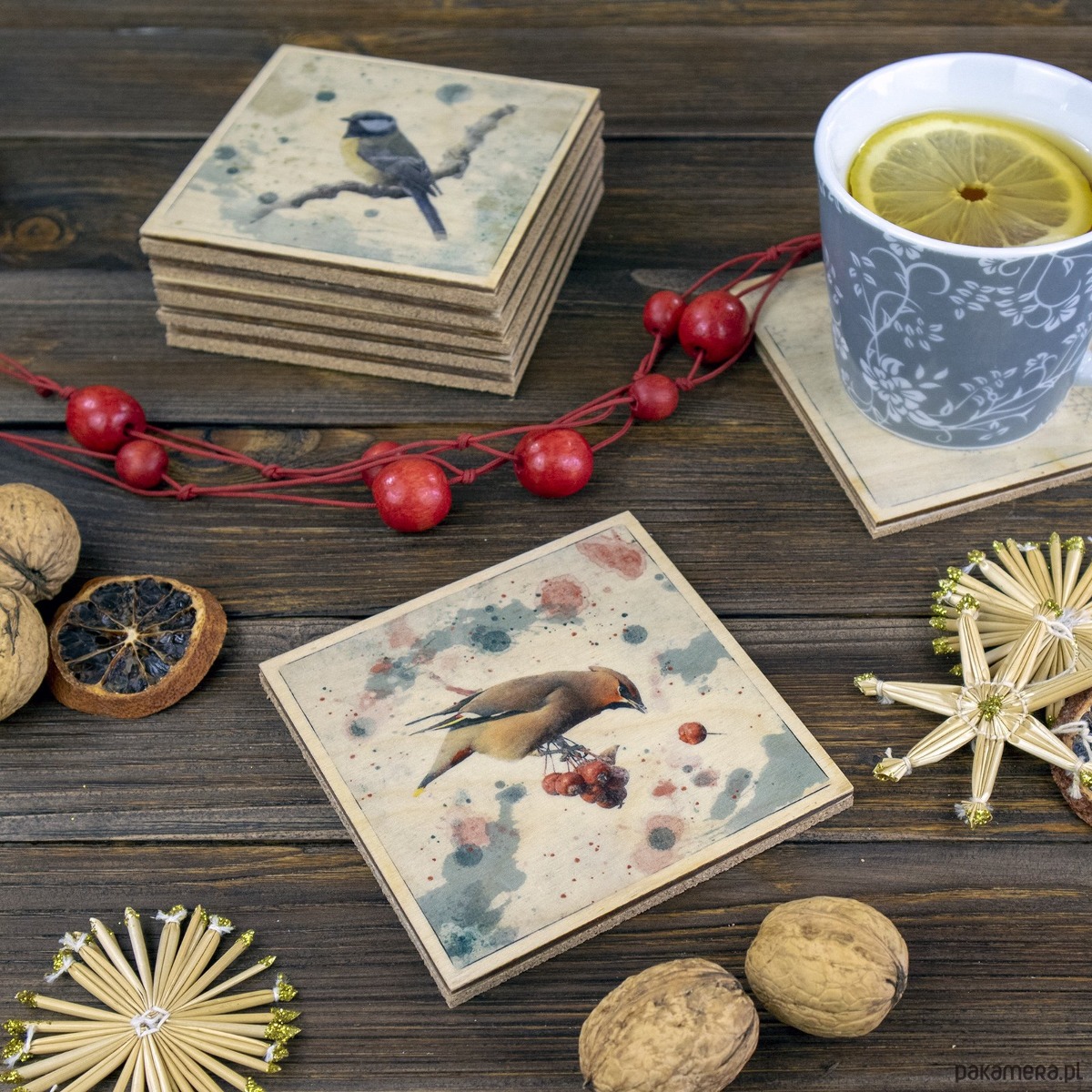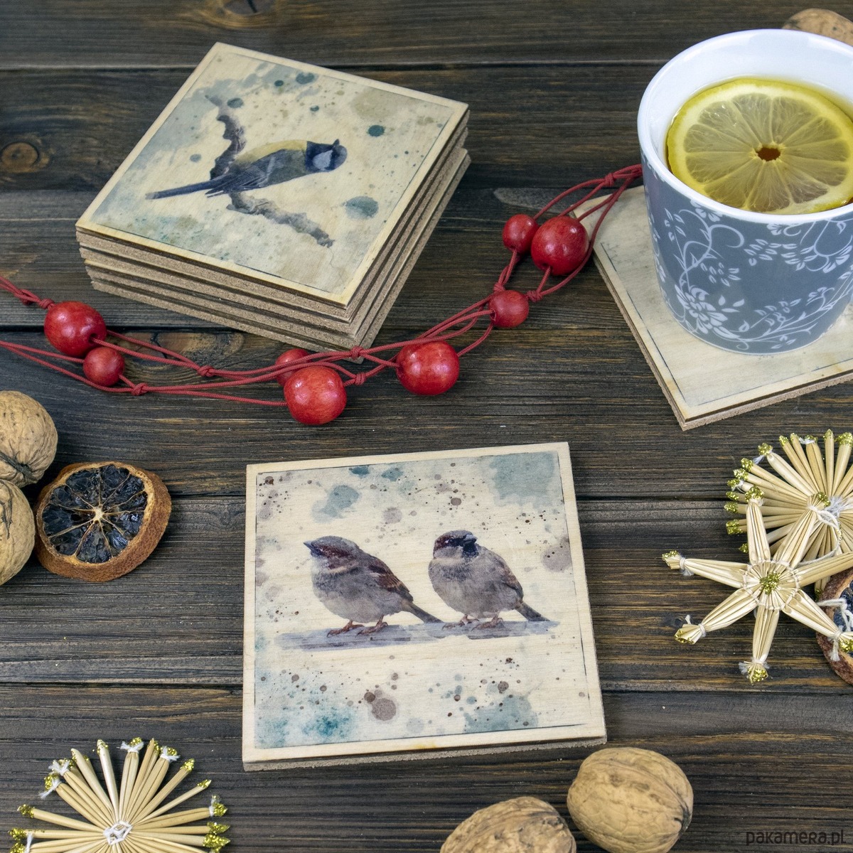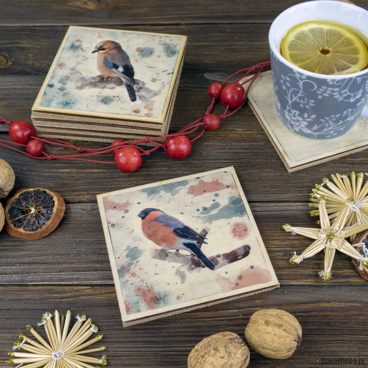 Podkładki pod kubki z 3 mm sklejki ozdobiliśmy ręcznie, transferując na drewno fotografie różnych ptaków. Jest gil, jemiołuszka, wróble, mazurek, sójka i sikorka.