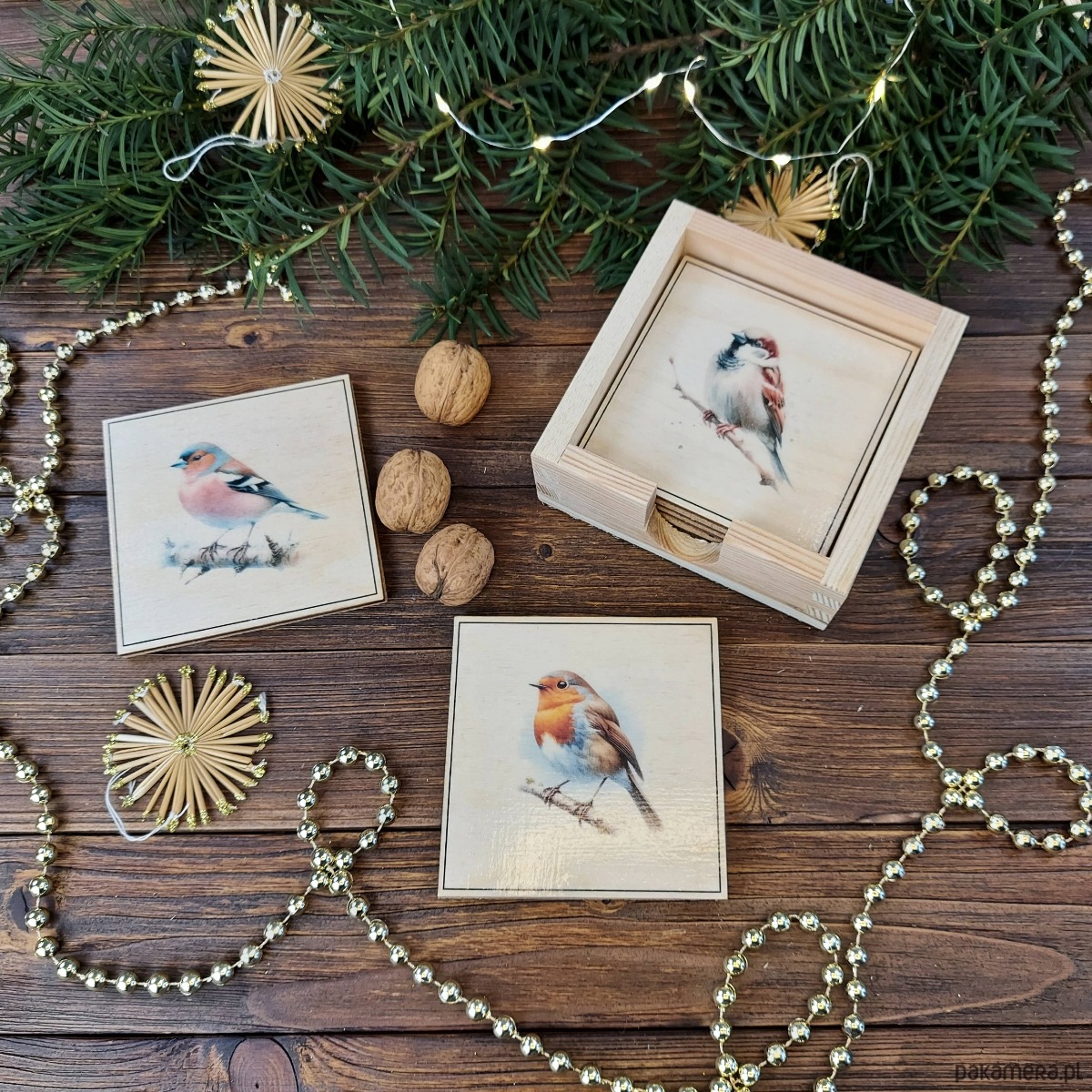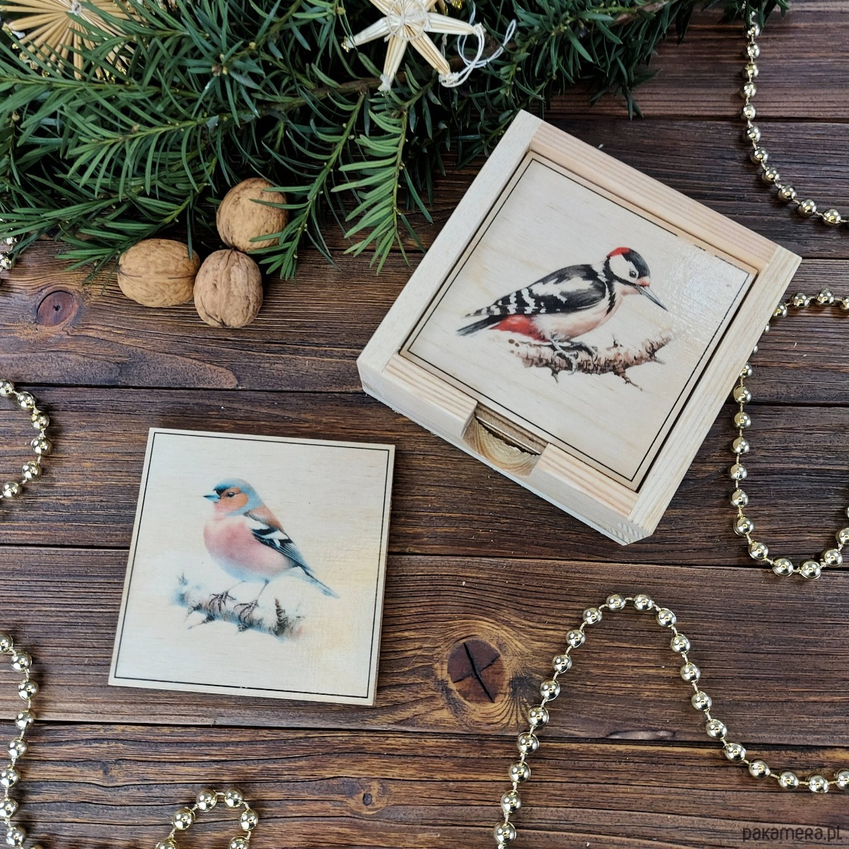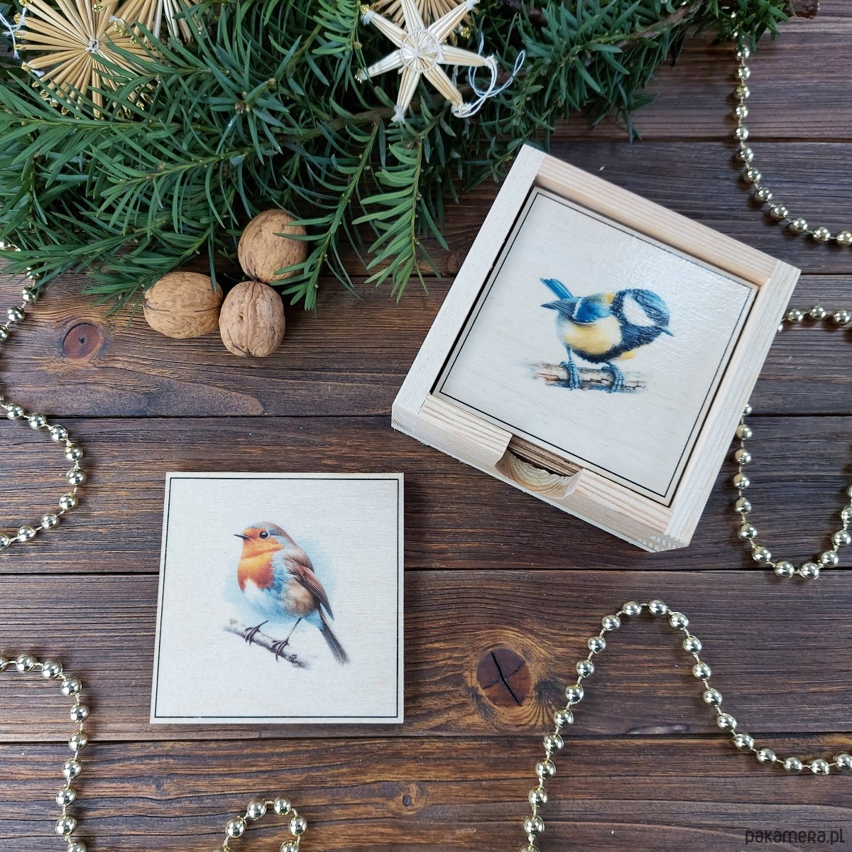 Podkładki pod kubki z 3 mm sklejki ozdobiliśmy ręcznie, transferując na drewno grafiki różnych ptaków. Jest sikorka, wróbel, rudzik, dzięcioł, zimorodek i zięba.