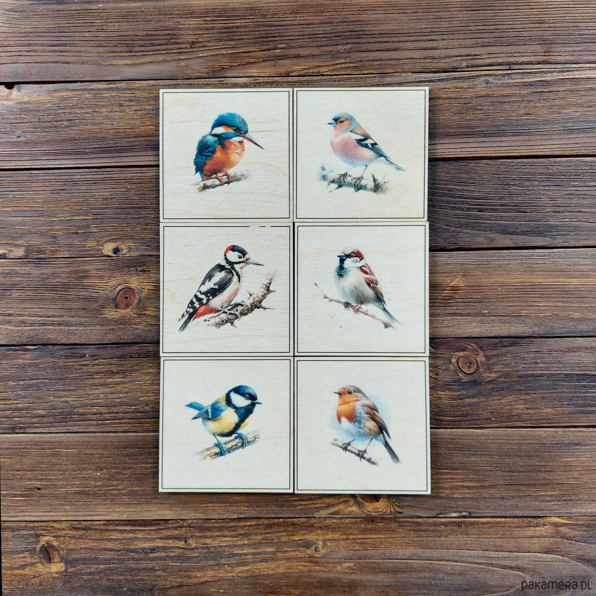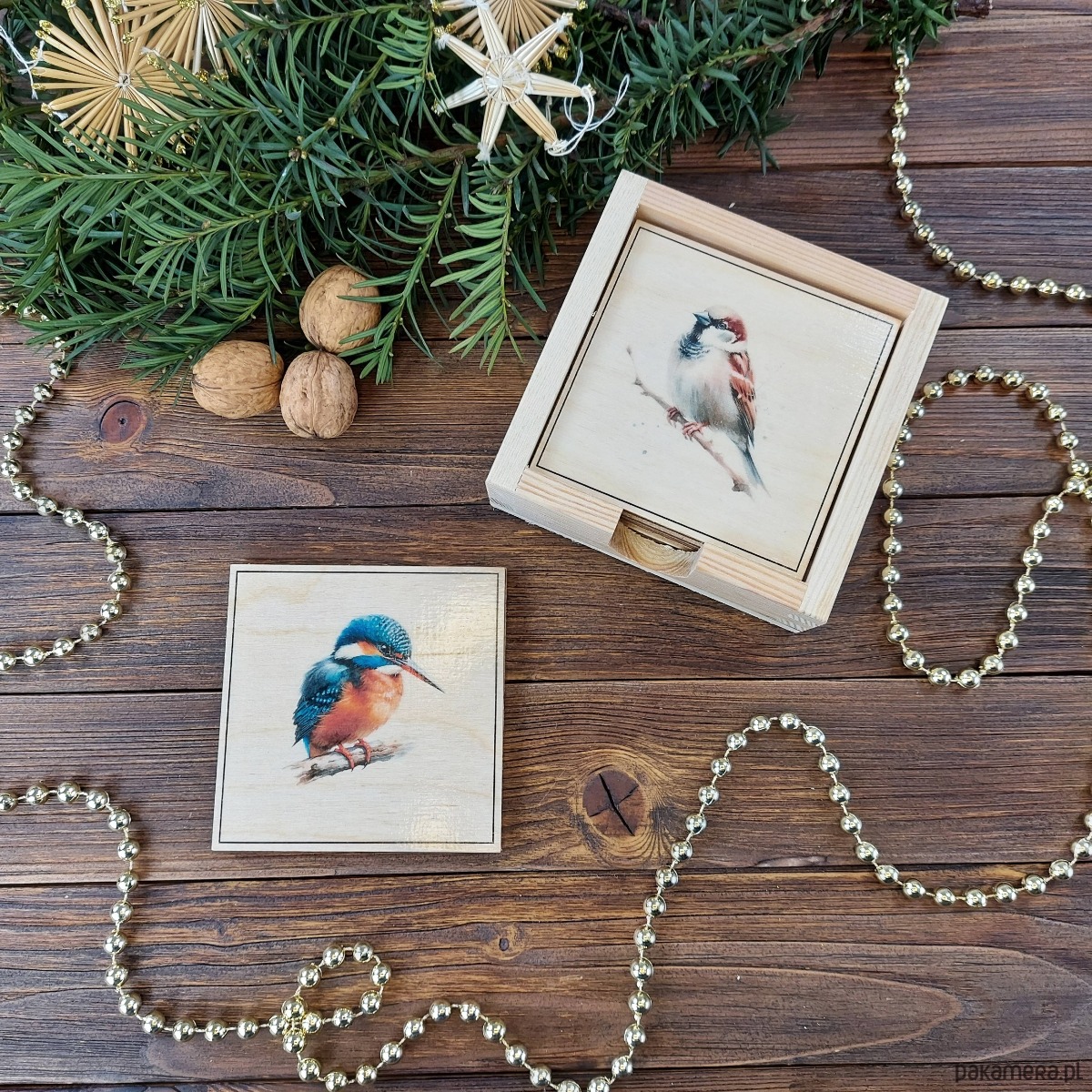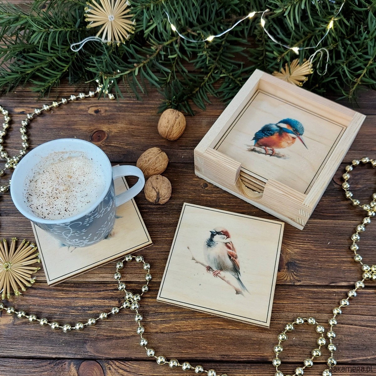 Podkładki pod kubki z 3 mm sklejki ozdobiliśmy ręcznie, transferując na drewno grafiki różnych ptaków. Jest sikorka, wróbel, rudzik, dzięcioł, zimorodek i zięba.