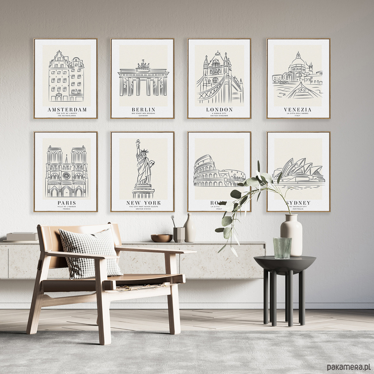 Zestaw ośmiu minimalistycznych plakatów z architekturą - symbolami miast.