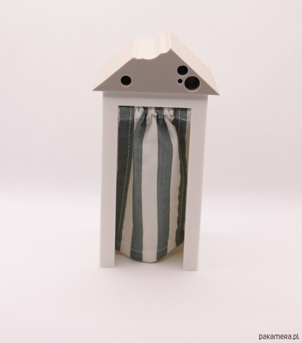Domek plażowy: Stylowa przebieralnia z daszkiem w kształcie serka i zasłonką w paski, która dodaje uroku plażowej scenerii.