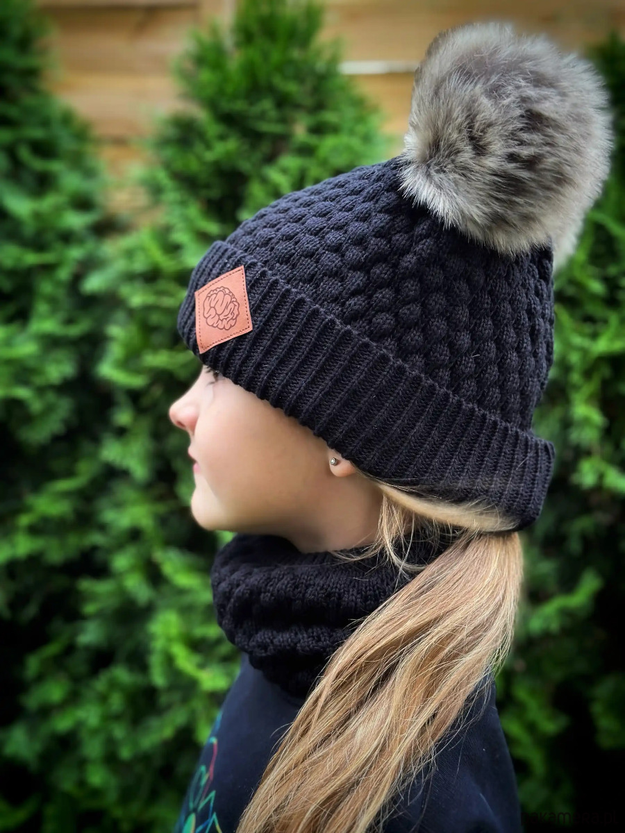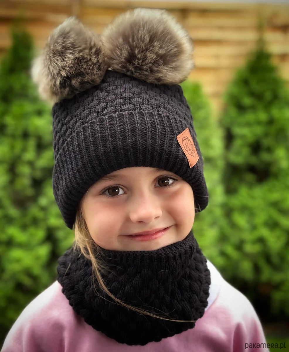 ZESTAW: bawełniana czapka dla dziecka z dwoma pomponami i komin Czarny