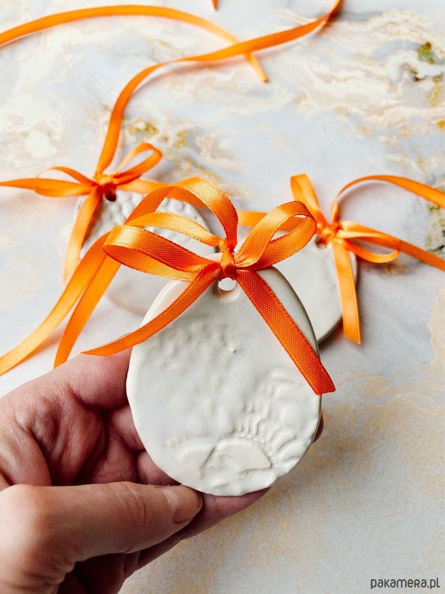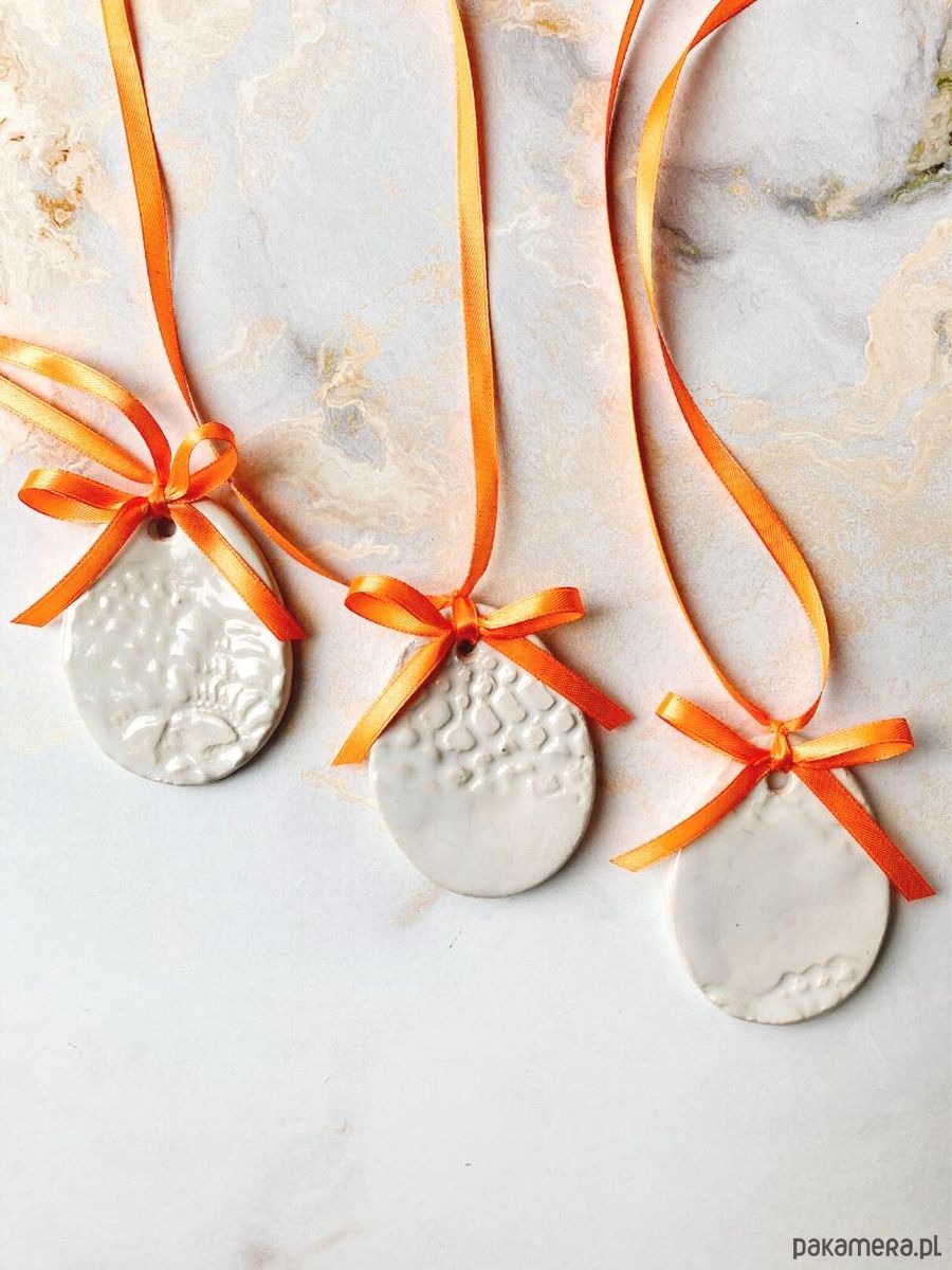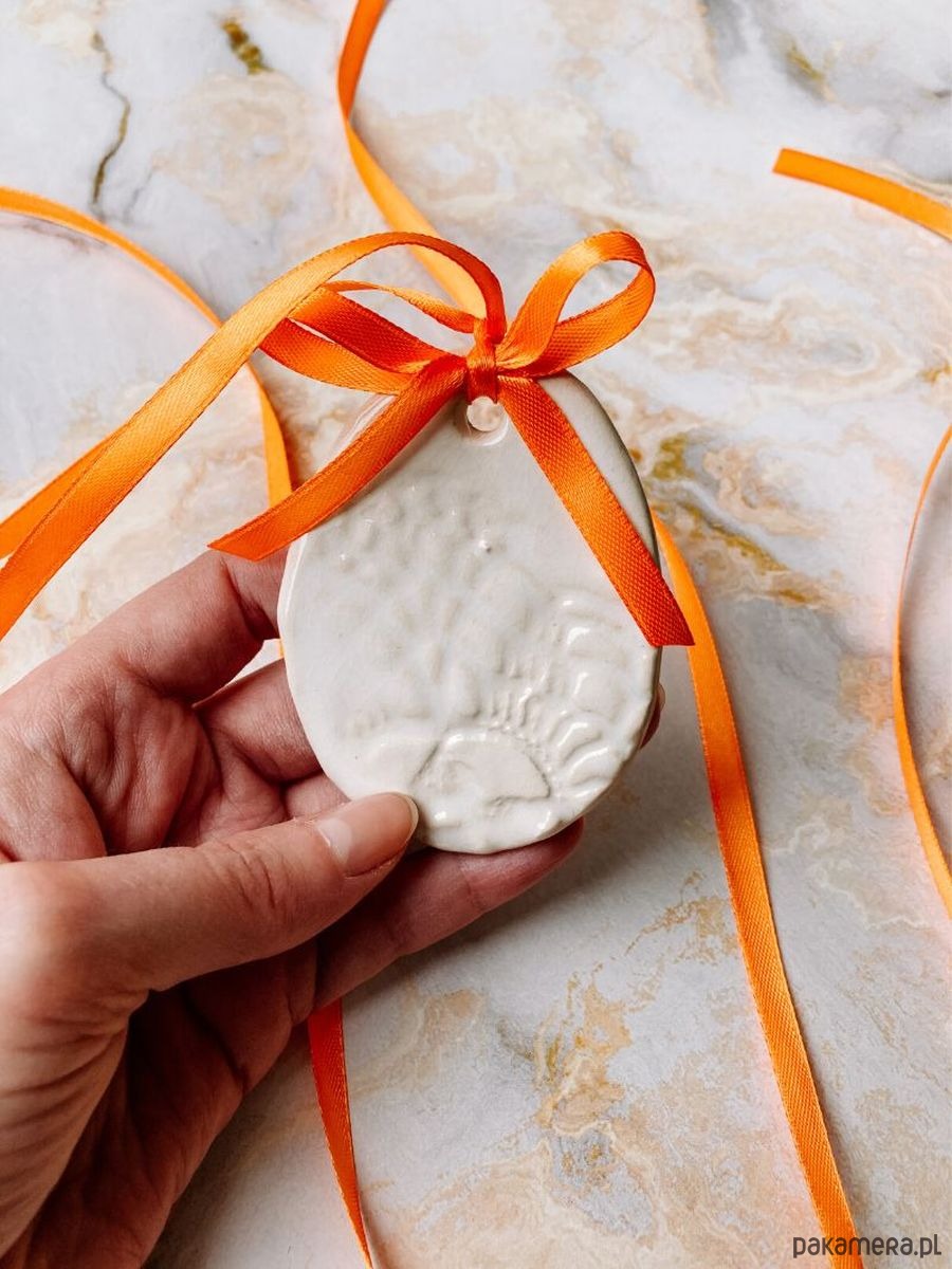Białe, dekoracyjne ceramiczne jajeczka z odciśniętym wzorem świetnie sprawdzą się do dekoracji mieszkania/domu. Ręcznie wykonane i wykończone ozdobną pomarańczową wstążką . Jajka mogą być zawieszone na szafce lub oknie. Warto dodać akcent Wielkanocny do naszej przestrzeni domowej.