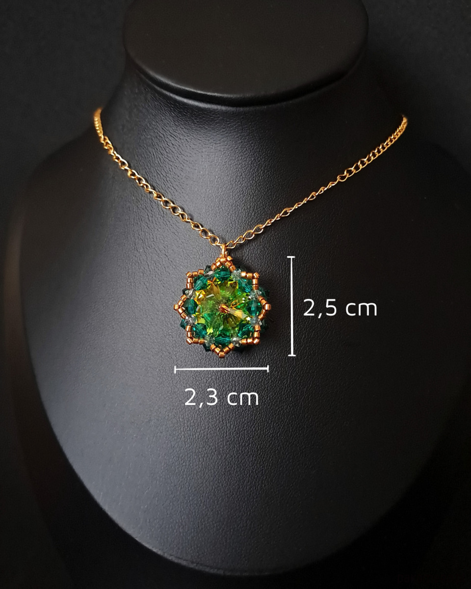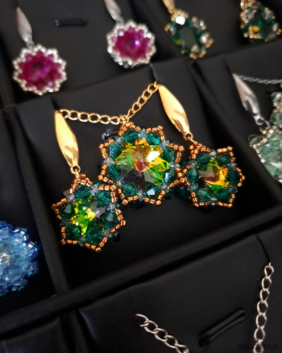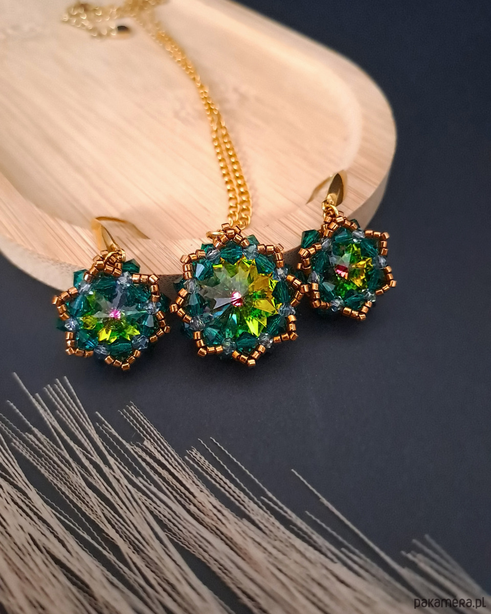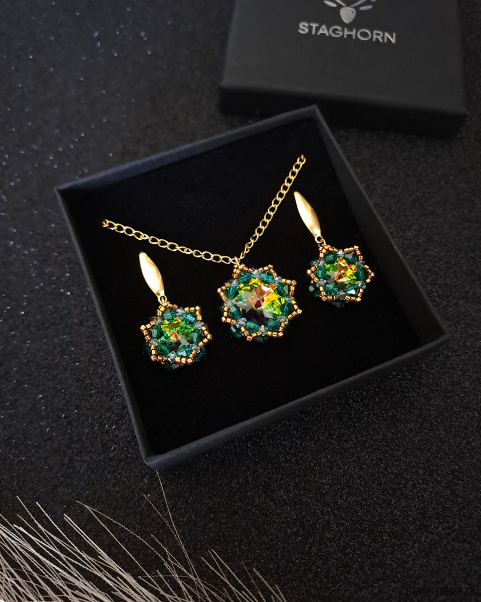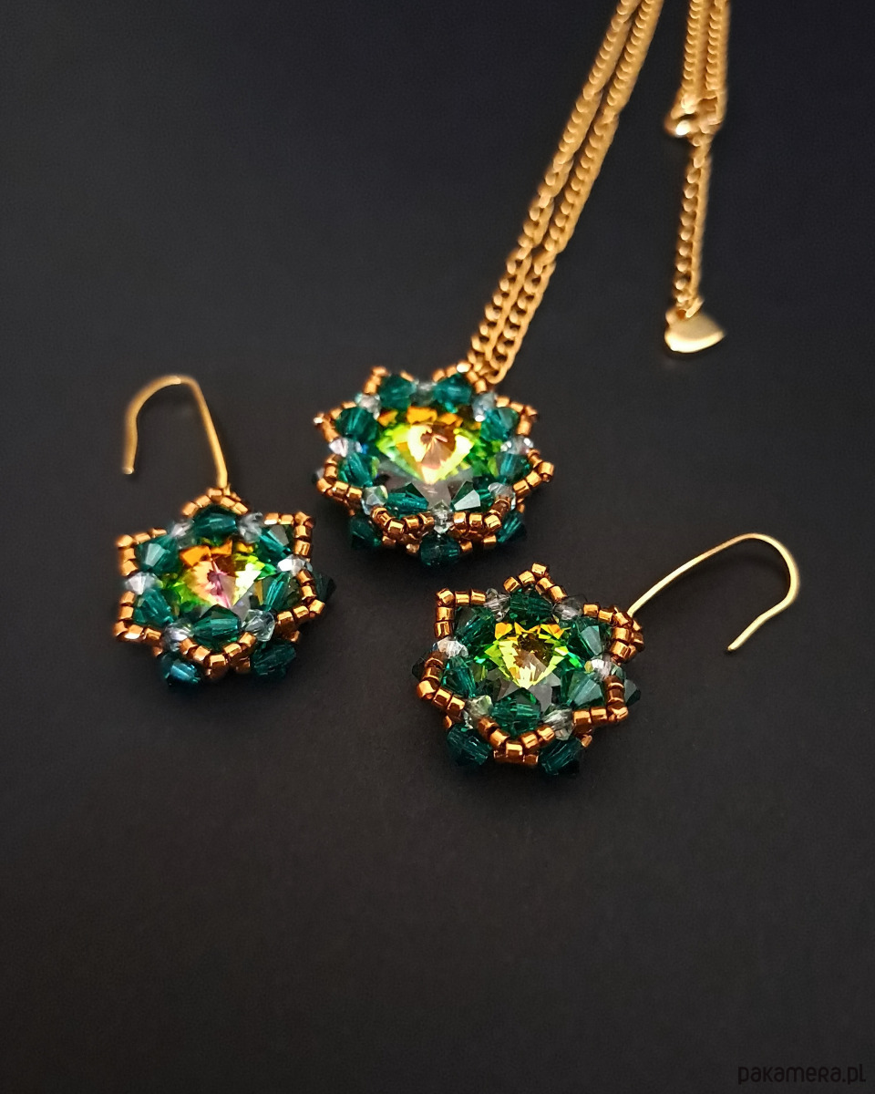 Zielono-Złoty Zestaw Biżuterii "Vitrail Maxima" to kwintesencja wyrafinowanego stylu, który nie tylko zdobi, ale także zachwyca. Kamienie Preciosa Rivoli Maxima emanują tajemniczym blaskiem - od głębokiej zieleni, przez złote refleksy, aż po akcenty fioletu i pomarańczu. Delikatne kryształki Preciosa w kolorach Emerald i crystal vitrail podkreślają blask centralnych kamieni, a koraliki Miyuki Delica w odcieniu brązowego złota dodają subtelnej, luksusowej nuty.