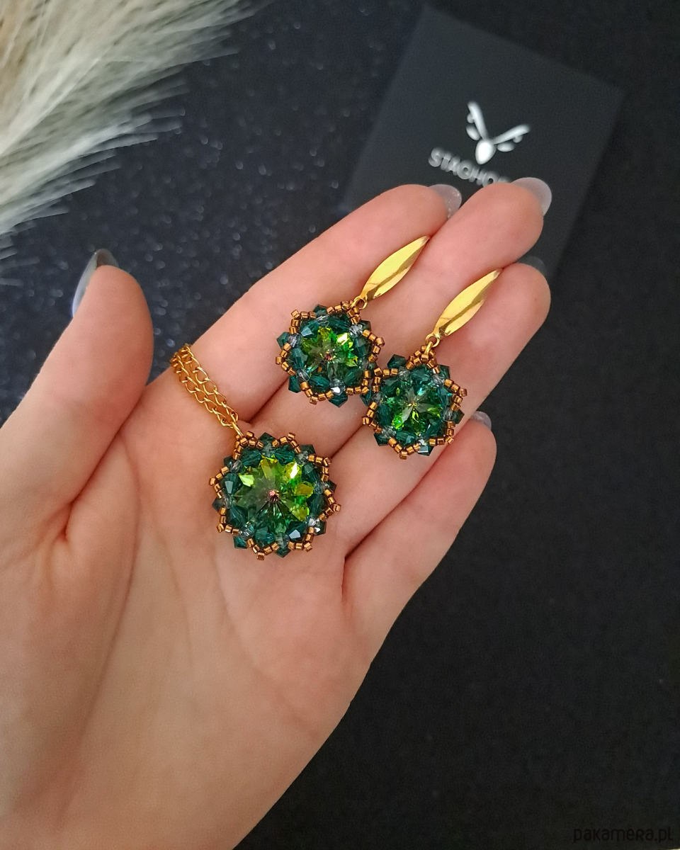 Komplet składa się z kolczyków o długości ok 4 cm oraz naszyjnika, tworzących spójną, harmonijną całość. Centralnym elementem kompozycji są kamienie Preciosa Rivoli Maxima o średnicy 16 mm i 12 mm w odcieniu Vitrail - głębokiej, eleganckiej zieleni o wyjątkowej czystości i blasku.