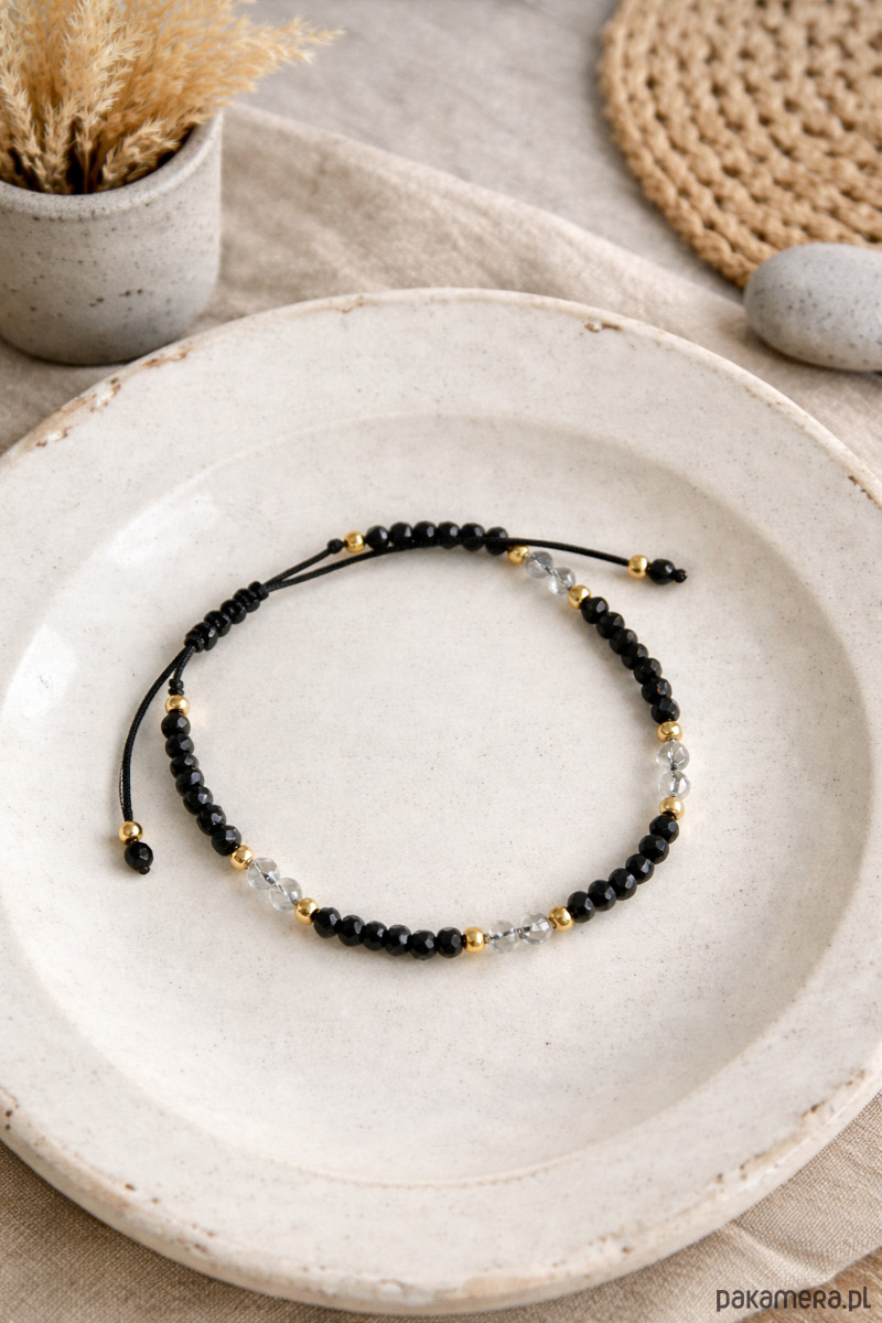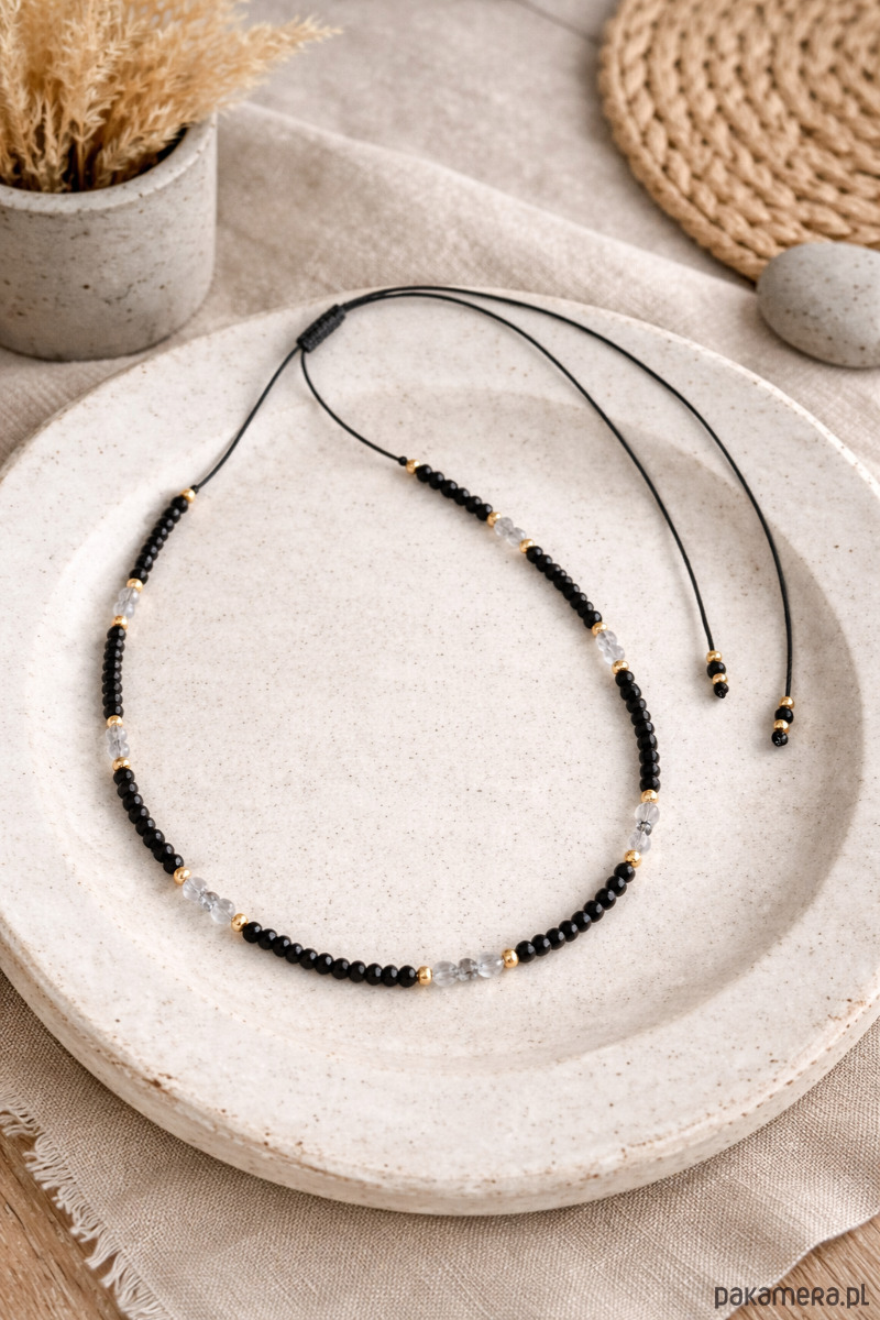 Delikatny, a jednocześnie pełen charakteru zestaw: bransoletka i naszyjnik wykonane z naturalnych kamieni czarnego turmalinu oraz labradorytu, przeplatanych subtelnymi złotymi akcentami. Oba elementy posiadają regulowaną długość, dzięki czemu można idealnie dopasować je do siebie i do stylizacji.