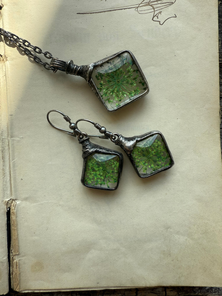 Zestaw wykonany na specjalne zamówienie – komplet delikatnych kolczyków i dopasowanego wisiorka z wyjątkowym zielonym kwiatem Queen Anne’s Lace (dzikiej marchwi), który symbolizuje delikatność, wdzięk i subtelną siłę natury 🌿