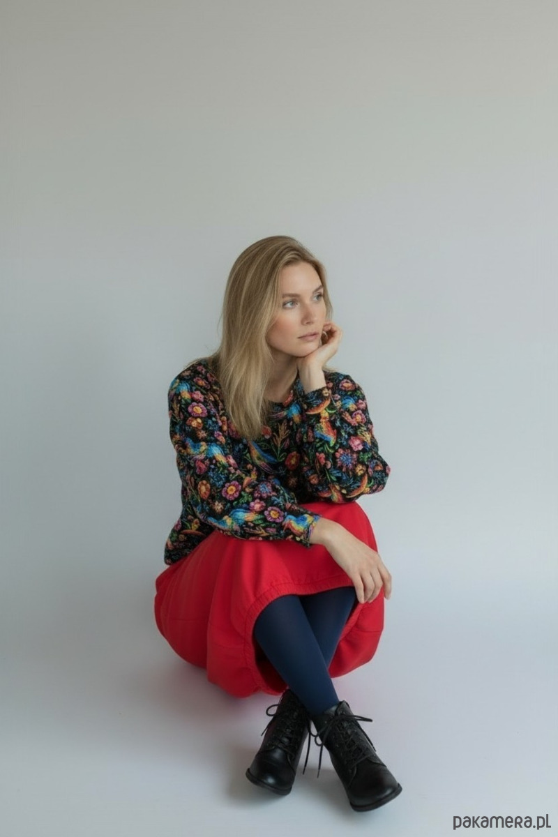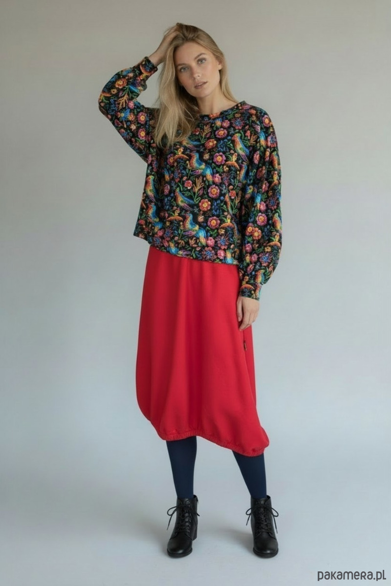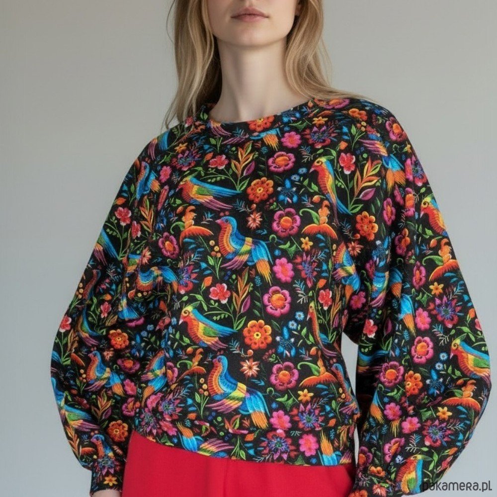 Wyjątkowy komplet dresowy damski składający się z bluzy Citta oraz spódnicy Samsara z wyrazistym, folkowym wzorem w ptaki. To zestaw dla kobiet, które cenią artystyczny charakter ubrań, wygodę i dopracowaną formę.