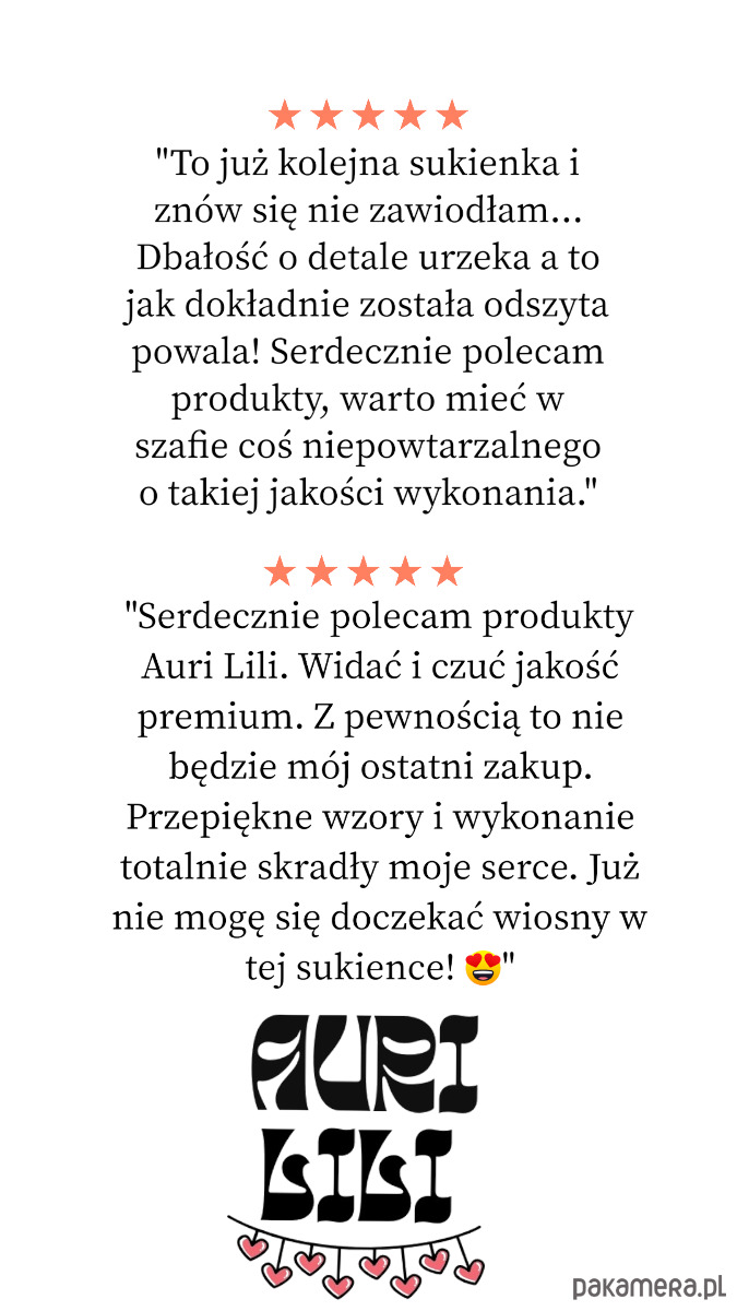 Możesz zwrócić zakupiony produkt bez podania przyczyny w przeciągu 14 dni od daty jego otrzymania. Wystarczy, że wyślesz wiadomość e-mail na adres Pakamery. Pamiętaj, że produkt musi być w stanie nienaruszonym i nie może nosić śladów używania. Zwracany towar przesyłasz na własny koszt wraz z wypełnionym formularzem o odstąpieniu od umowy (do pobrania po zalogowaniu). Produkty wykonane na indywidualne zamówienie nie podlegają zwrotowi. Pełna procedura zwrotu (tutaj)
