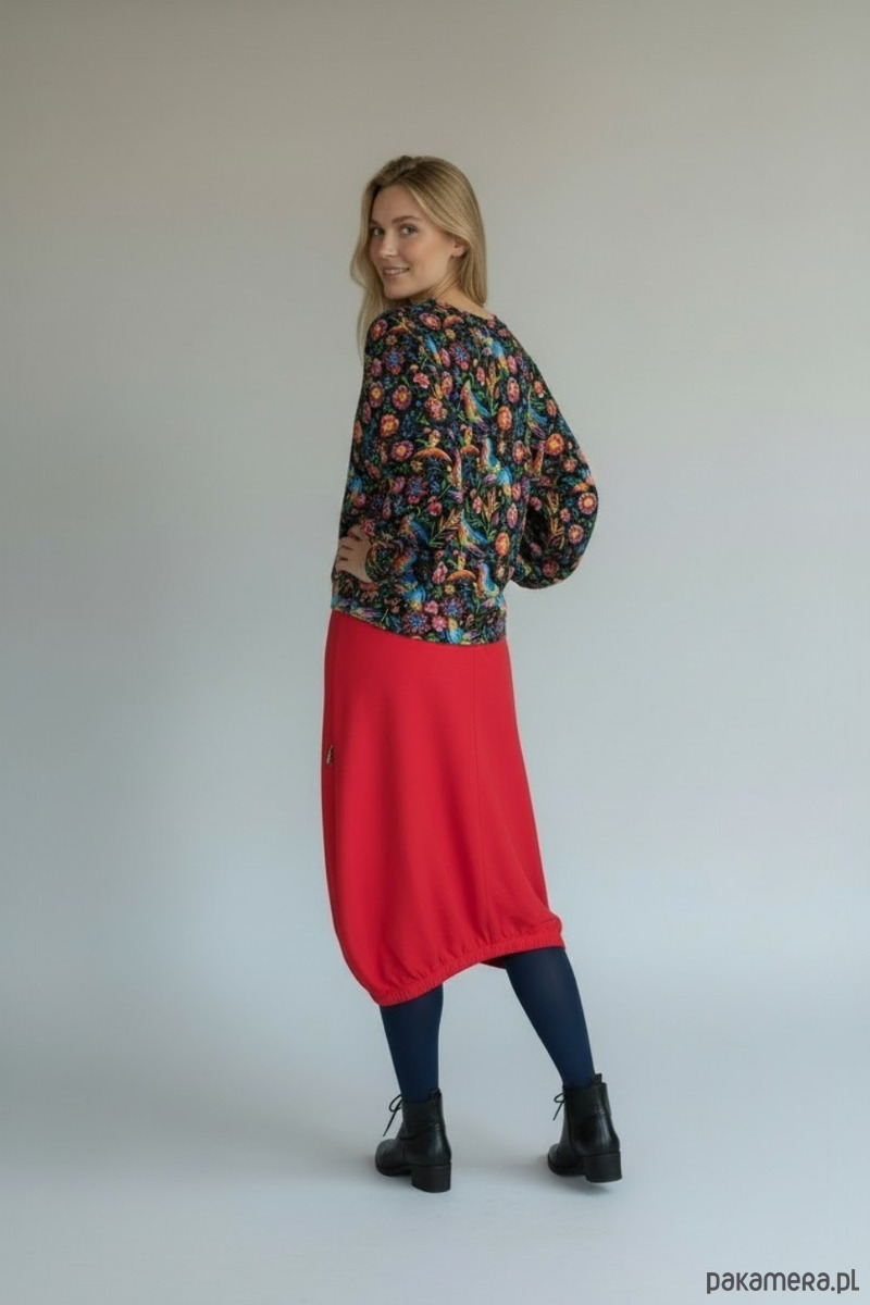 Spódnica midi o kroju bombki, z dłuższymi bokami i asymetryczną linią. Na dole wykończona gumką, co nadaje sylwetce nowoczesny, dynamiczny charakter. Model posiada kieszenie, co zwiększa funkcjonalność i wygodę.