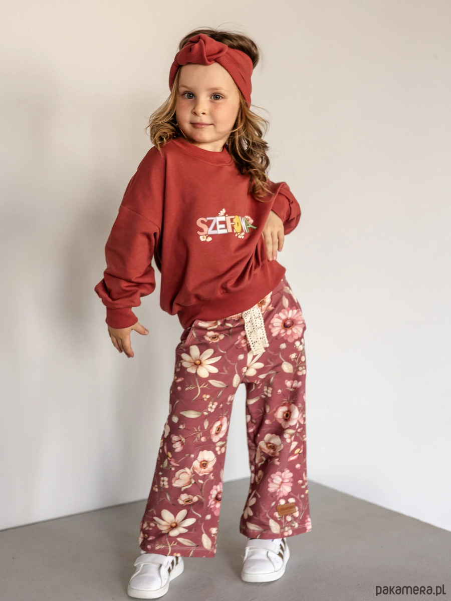 Odkryj nasz wyjątkowy zestaw, który składa się z bluzy SZEFOWA i kulotów AZALIA w pięknym bordowym kolorze z kwiatowym printem. Wykonany z najwyższej jakości dresówki premium, zestaw ten jest idealnym wyborem dla każdej małej modnisi. Materiał spełnia standardy OEKO-TEX®, co zapewnia bezpieczeństwo i komfort noszenia.