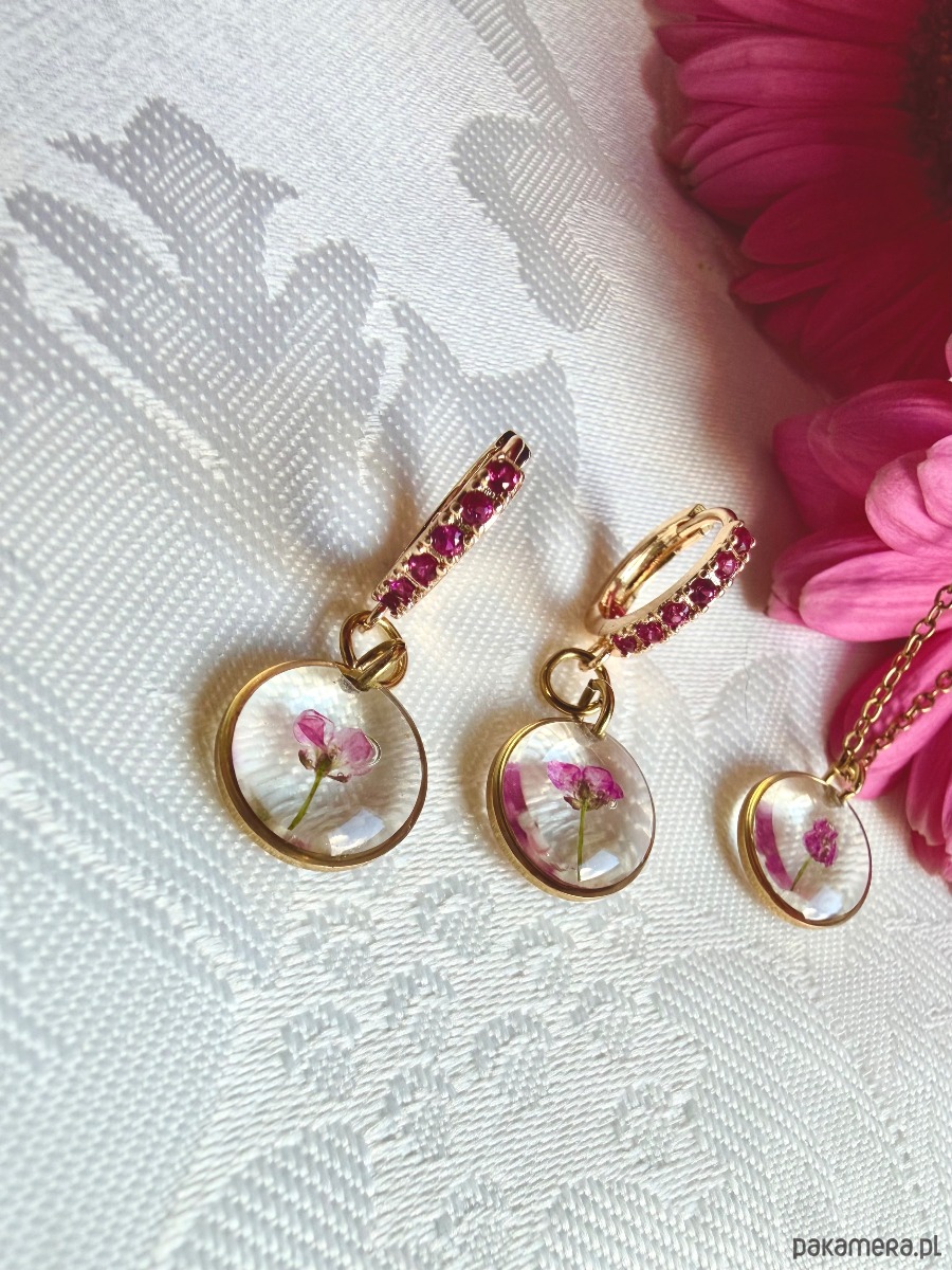 • Połączenie natury z glamour: Naturalne piękno polnych kwiatów zestawiliśmy z subtelnym blaskiem różowych cyrkonii przy kolczykach, co nadaje całości wyjątkowego charakteru.