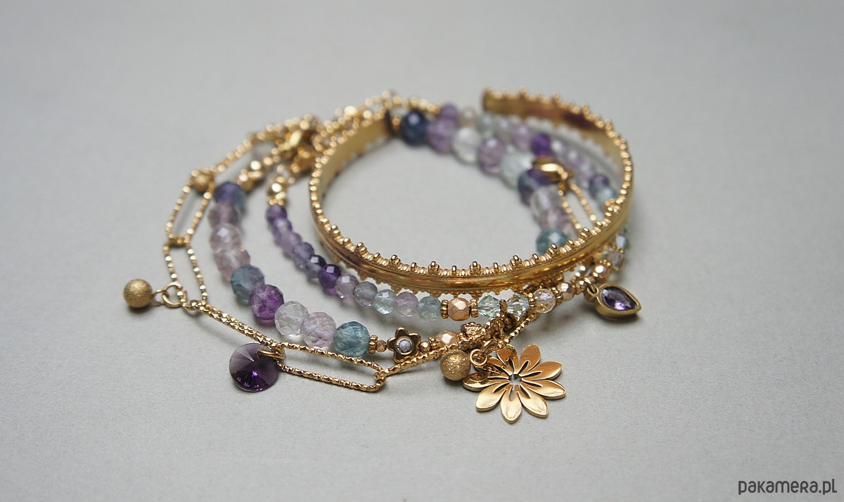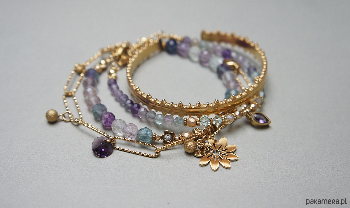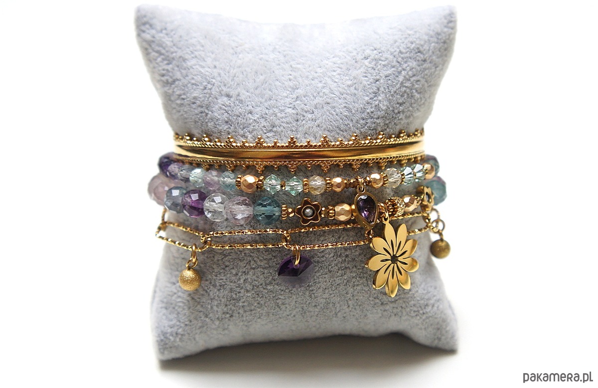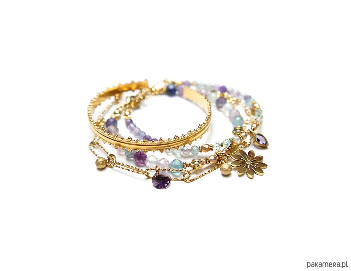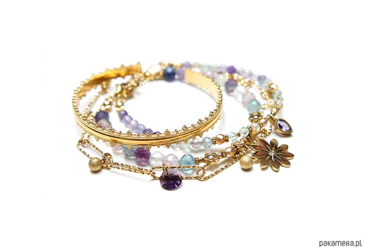 Zestaw czterech bransoletek wykonanych w całości z pozłacanej stali szlachetnej oraz naturalnych, szlachetnych kamieni - fasetowanego fluorytu [3.5mm i 6mm], przekładek z hematytu [1mm i 6mm - kwiatki], hematytu fasetowanego, platerowanego [2mm, 3mm i 4mm], kryształków fasetowanych [4mm], zawieszki z cyrkonią w okuciu, zawieszki z kryształkiem. Bransoletki pasują na nadgarstek 16 - 17cm (długość bransoletek na lince jubilerskiej i łańcuszka - 18,5cm). Biżuteria ozdobnie zapakowana.