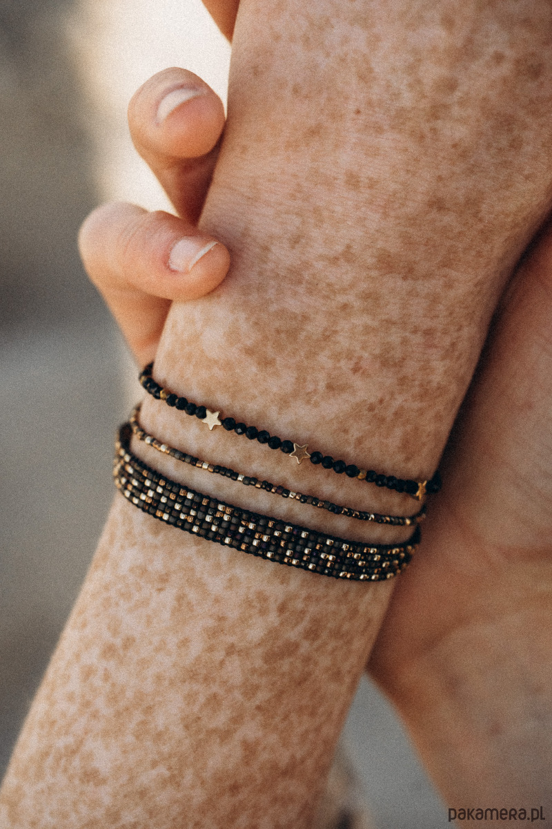 Ponadczasowy dobór koralików w odcieniach czerni i złota sprawia, że bransoletki będą świetnym dodatkiem na niejedną okazję.