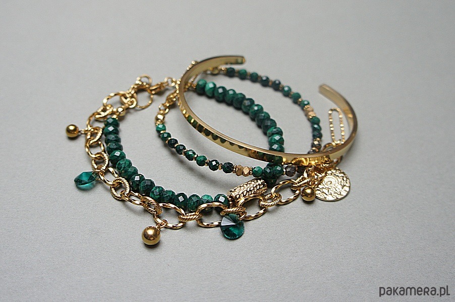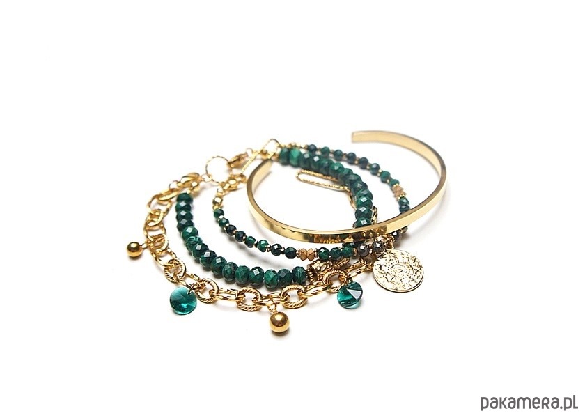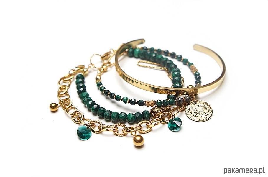 Zestaw czterech bransoletek wykonanych w całości z pozłacanej stali szlachetnej oraz naturalnych, szlachetnych kamieni - malachity fasetowane [3mm oraz oponki 6 x 4mm], pirytu o surowej strukturze [3mm], przekładek z hematytu [1mm oraz 3 x 2mm]. Bransoletki pasują na nadgarstek 15 - 16cm (dlugość bransoletek ok 18,7). Biżuteria ozdobnie zapakowana.