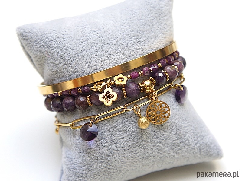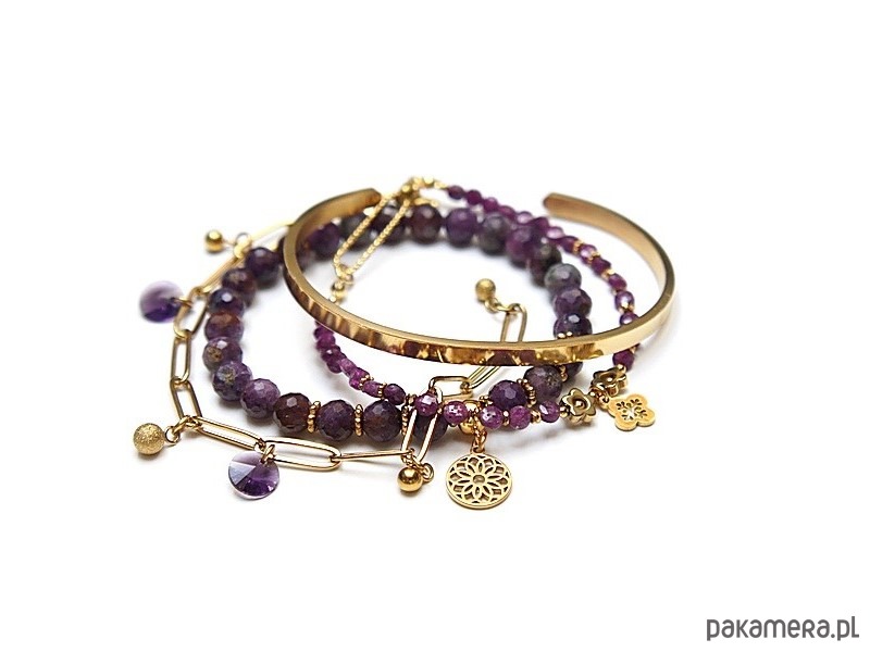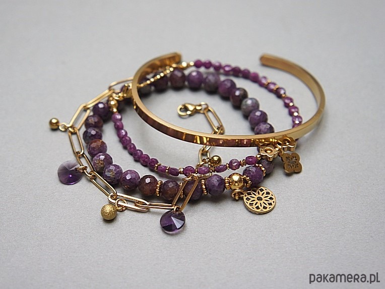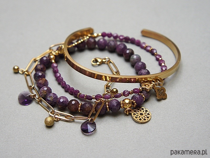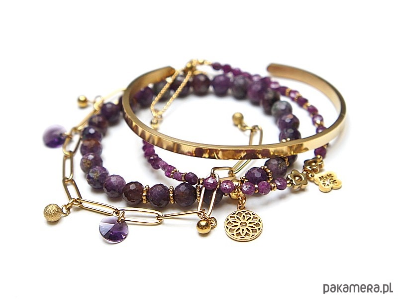 Zestaw czterech bransoletek wykonanych w całości z pozłacanej stali szlachetnej oraz naturalnych, szlachetnych kamieni - rubiny fasetowane [4mm oraz 6mm], przekładek z hematytu [6mm], zawieszek z kryształkami Swarovski. Bransoletki pasują na nadgarstek 15 - 16cm Biżuteria ozdobnie zapakowana.