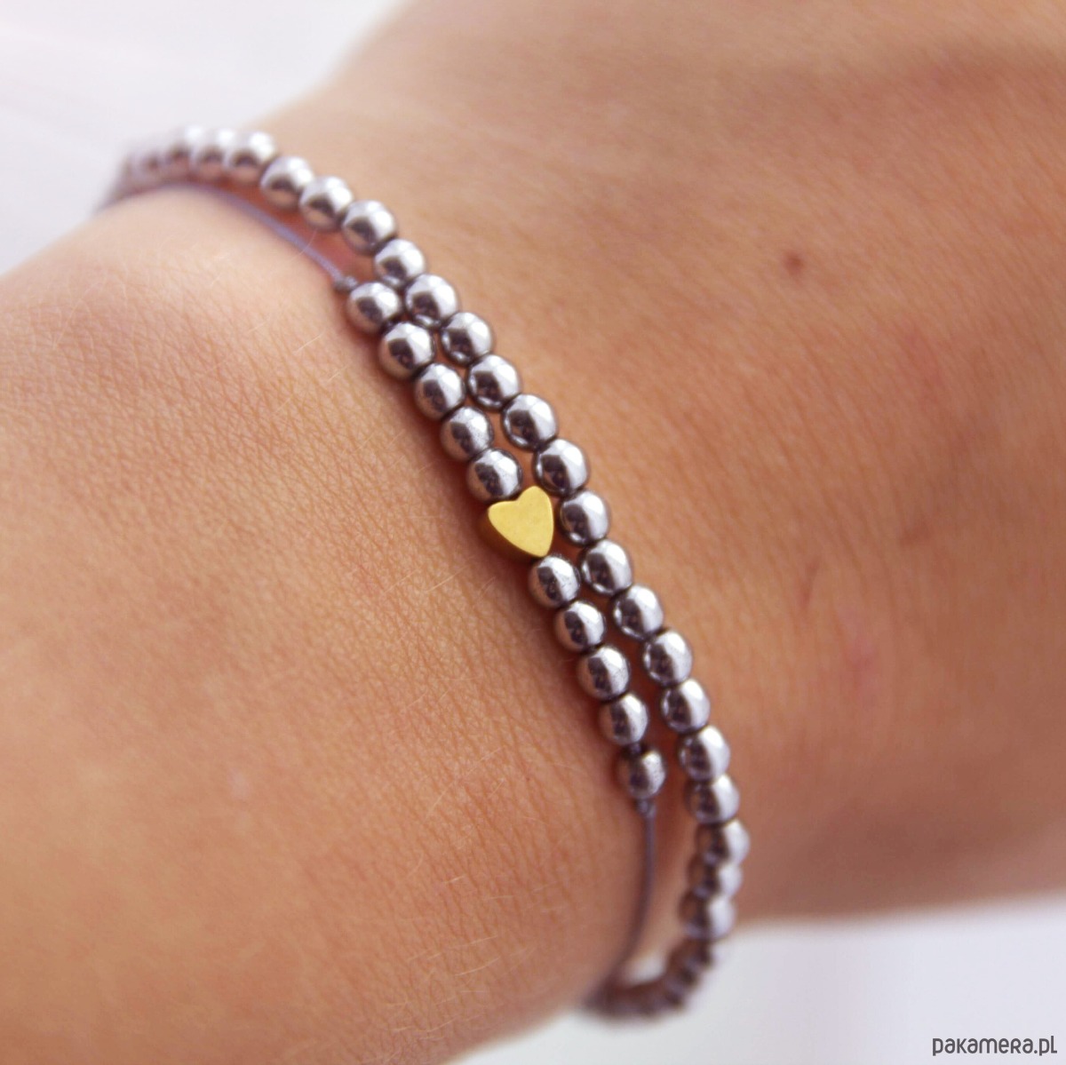 Zestaw dwoch bransoletek z hematytu w kolorze srebra, jedna na gumce, obwod ok 17 cm(możliwość dopasowania), druga sznurkowa ze złotym sercem, obowd regulowany.
