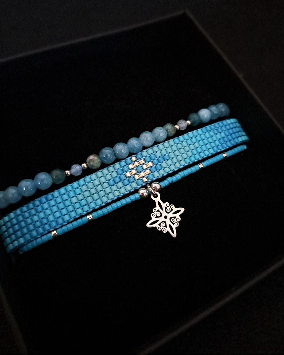 Akwamaryn i apatyt to kamienie związane z klarownością i spokojem. Akwamaryn przynosi ukojenie, równowagę i czystość myśli, a także symbolizuje wewnętrzną odwagę i prawdę. Apatyt wspiera kreatywność i komunikację, wprowadzając poczucie lekkości i świeżości. Ich chłodne, wodne odcienie sprzyjają koncentracji i wyciszeniu, tworząc subtelny talizman spokoju.