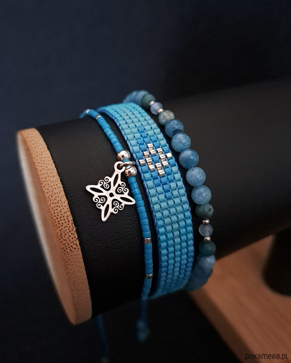 - Bransoletka tkana na krośnie z koralików Miyuki Delica w trzech odcieniach niebieskiego i srebra. Szerokość: 1 cm.