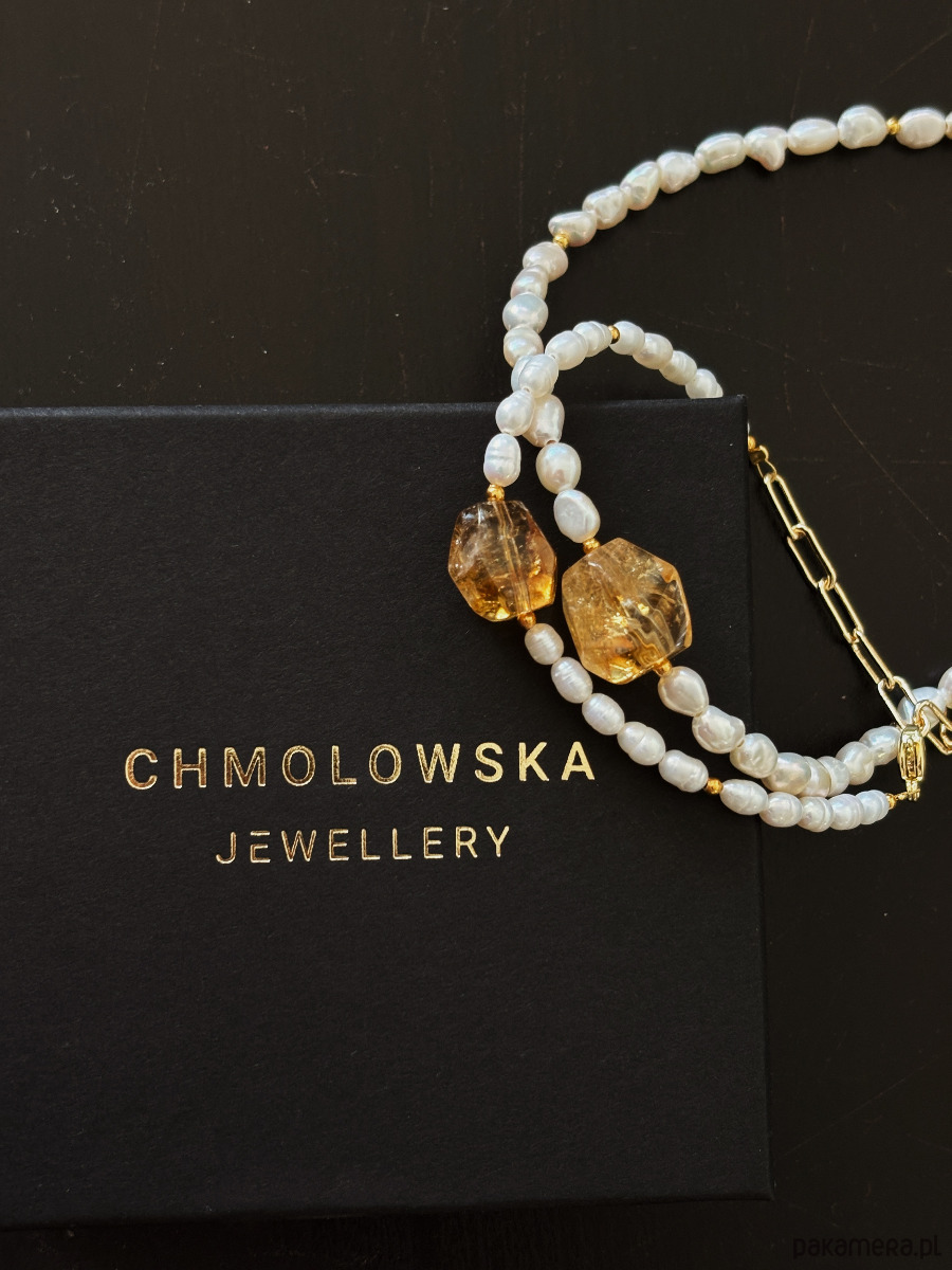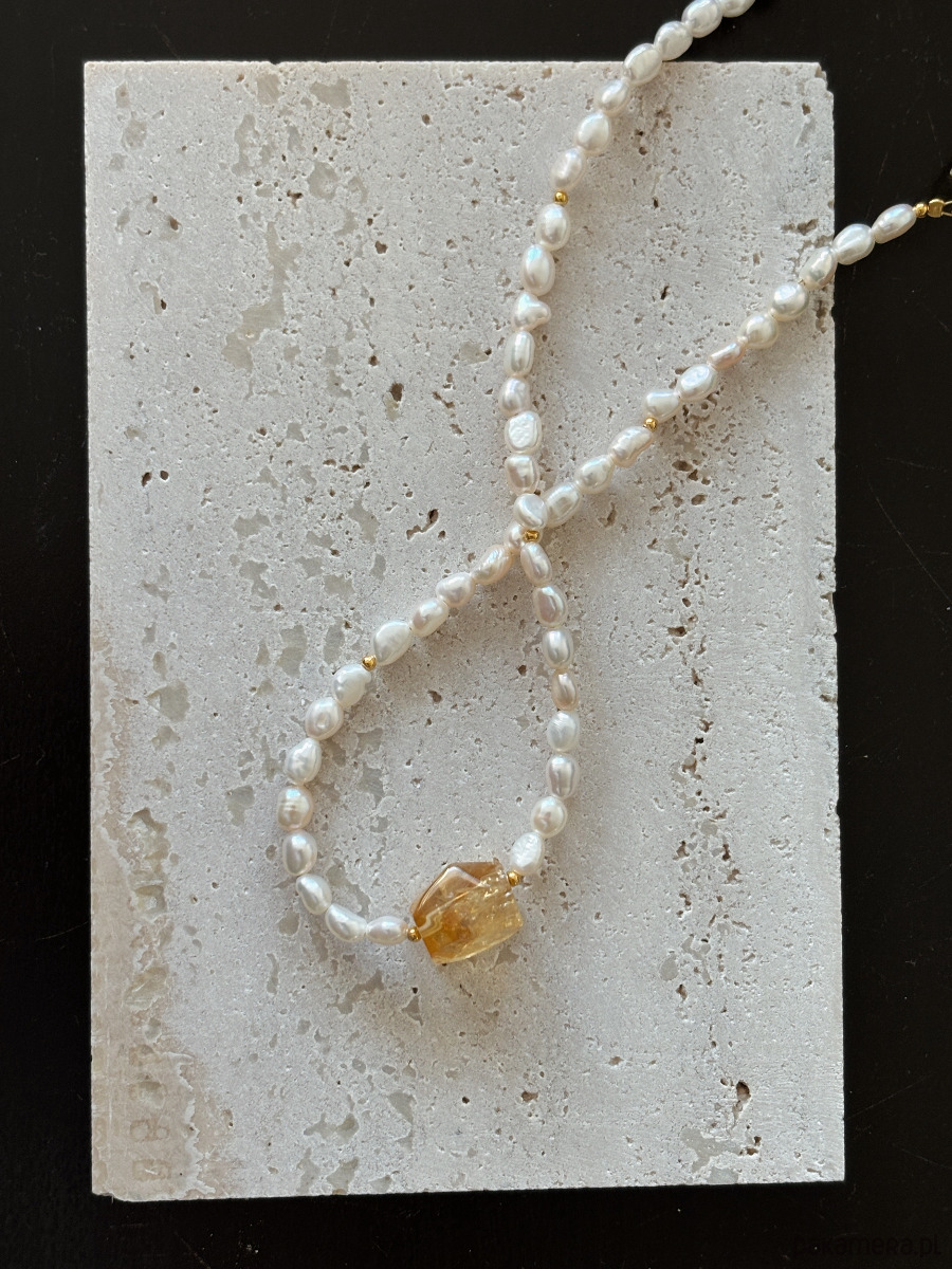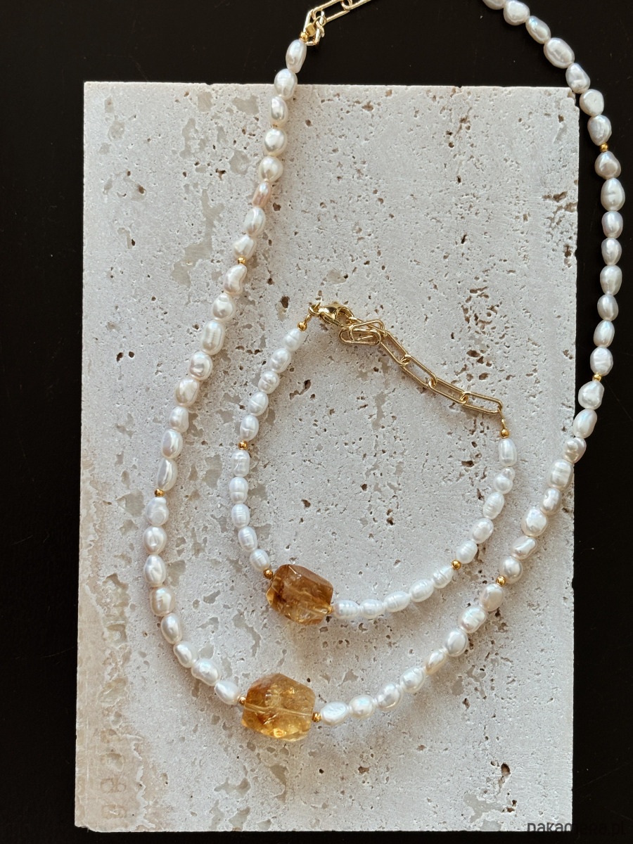 Naszyjnik i bransoletka wykonane są na lince jubilerskiej z użyciem pereł naturalnych, cytrynu- surowej bryły, łańcuszka i zapięcia rodowanych złotem.