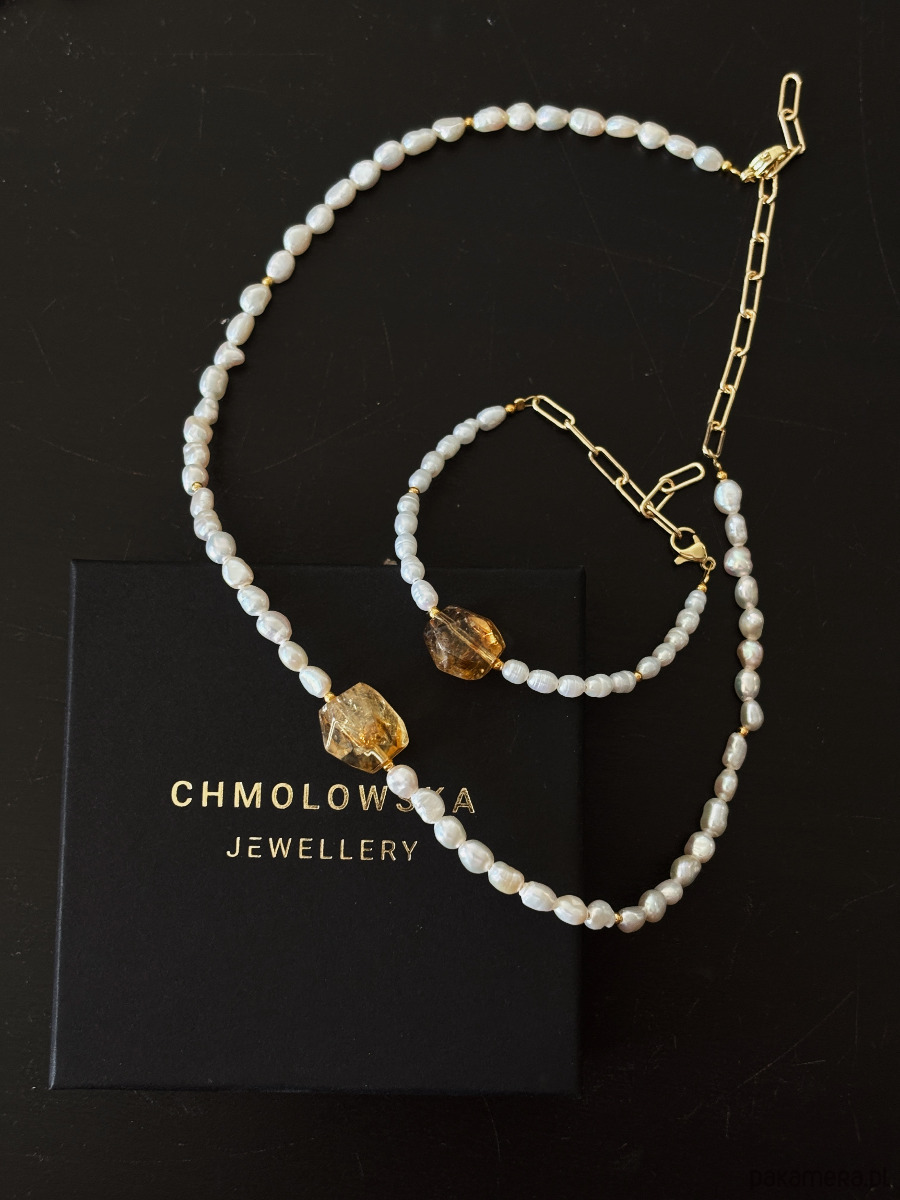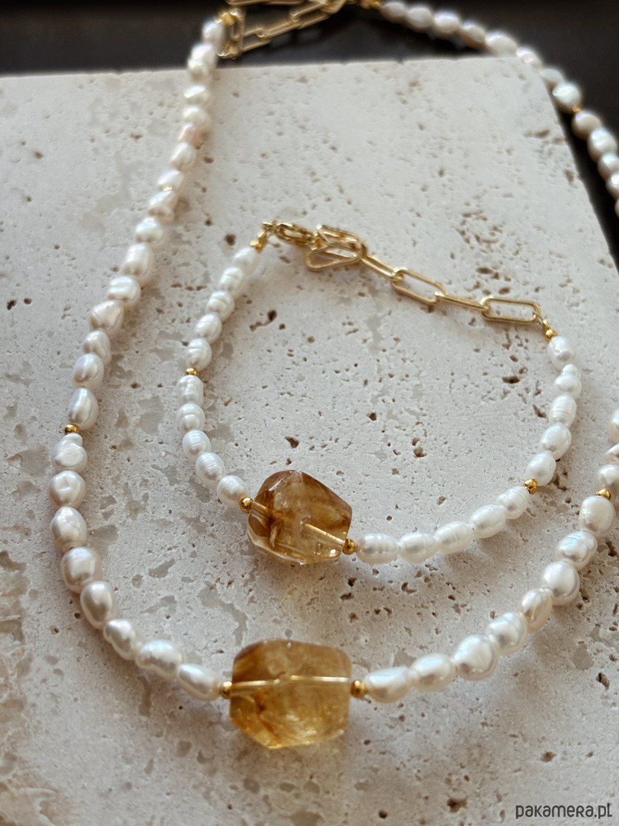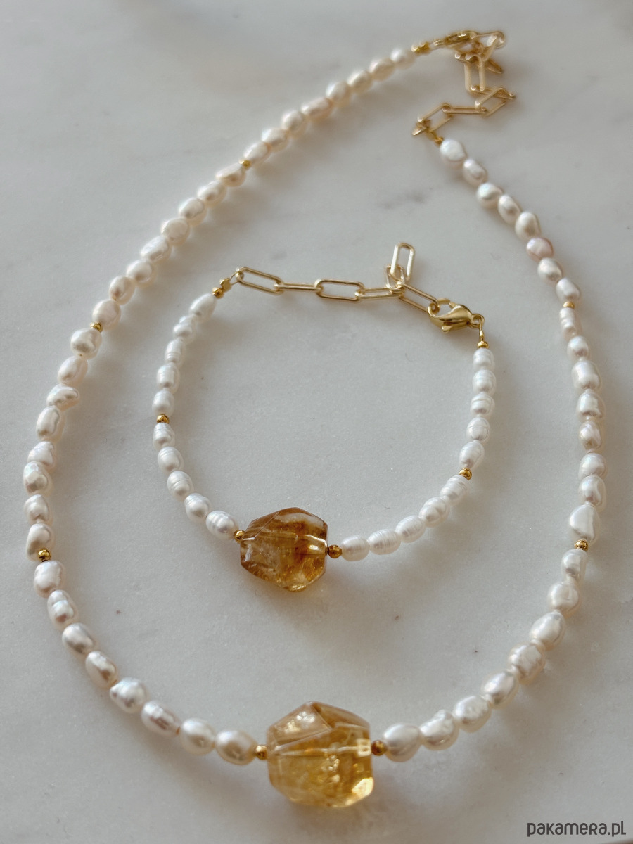 Naszyjnik i bransoletka wykonane są na lince jubilerskiej z użyciem pereł naturalnych, cytrynu- surowej bryły, łańcuszka i zapięcia rodowanych złotem.