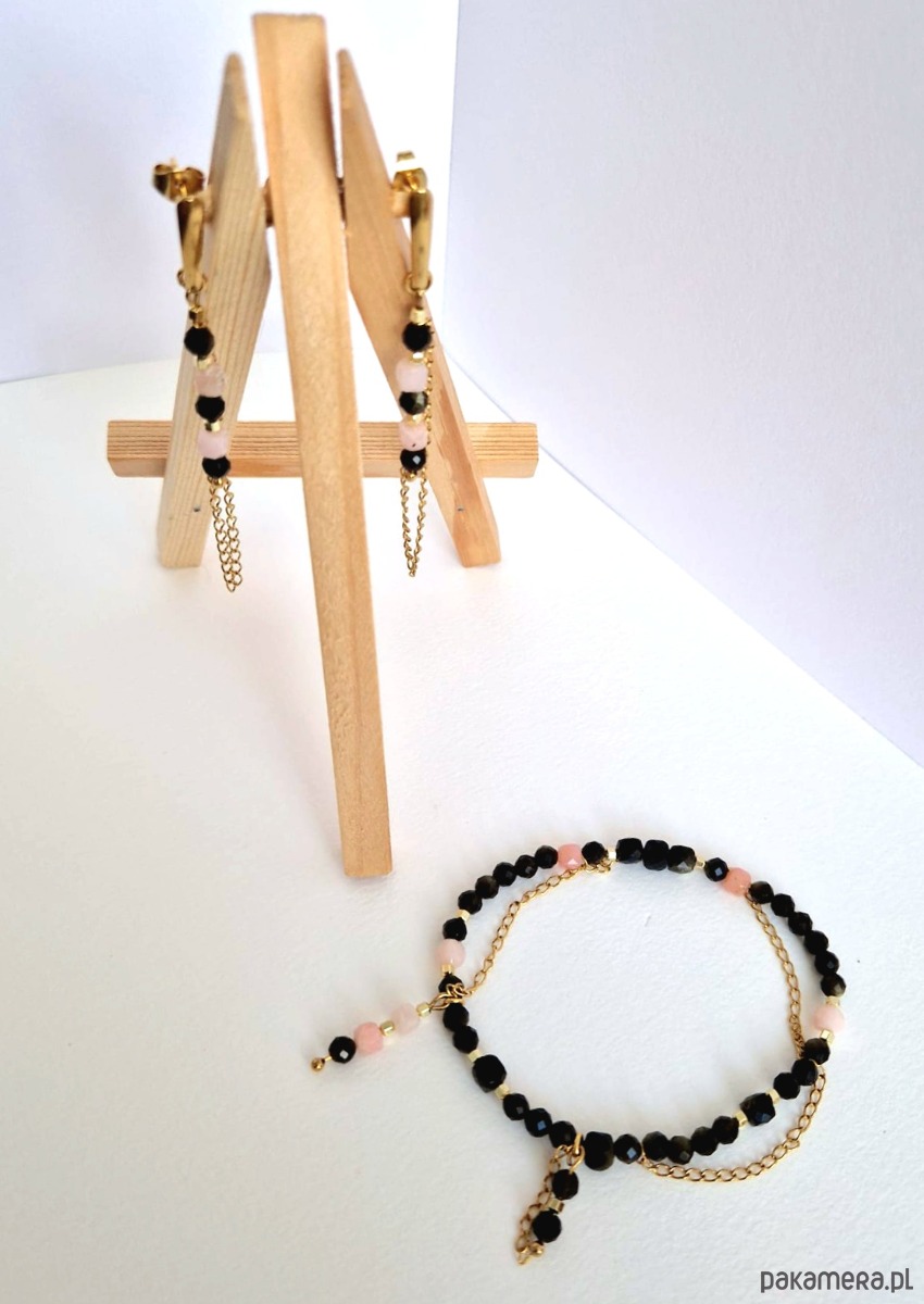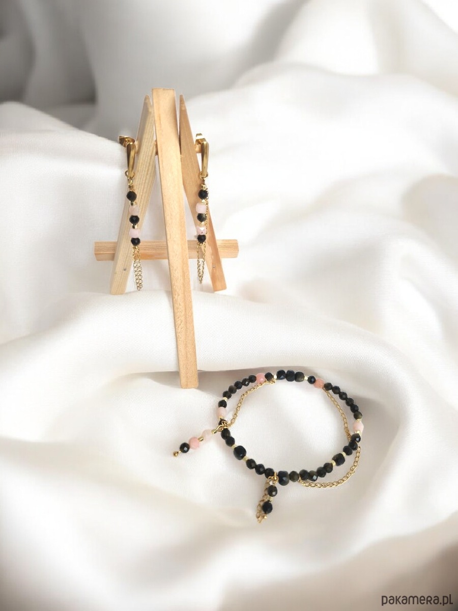 Oryginalna bransoletka z kolczykami wykonana z różowego opalu wysokiej jakości, czarnego turmalinu oraz obsydianu, połączonych z delikatnym złotym łańcuszkiem, który jest wspólnym, autorskim motywem zarówno w bransoletce, jak i w kolczykach.